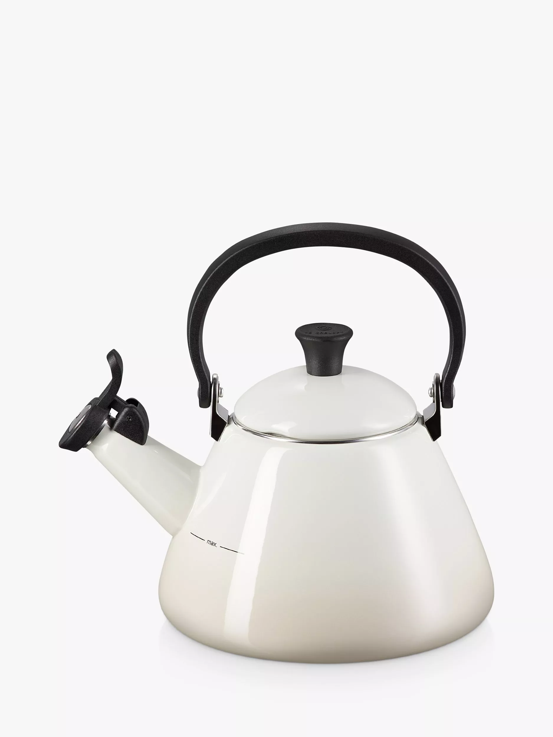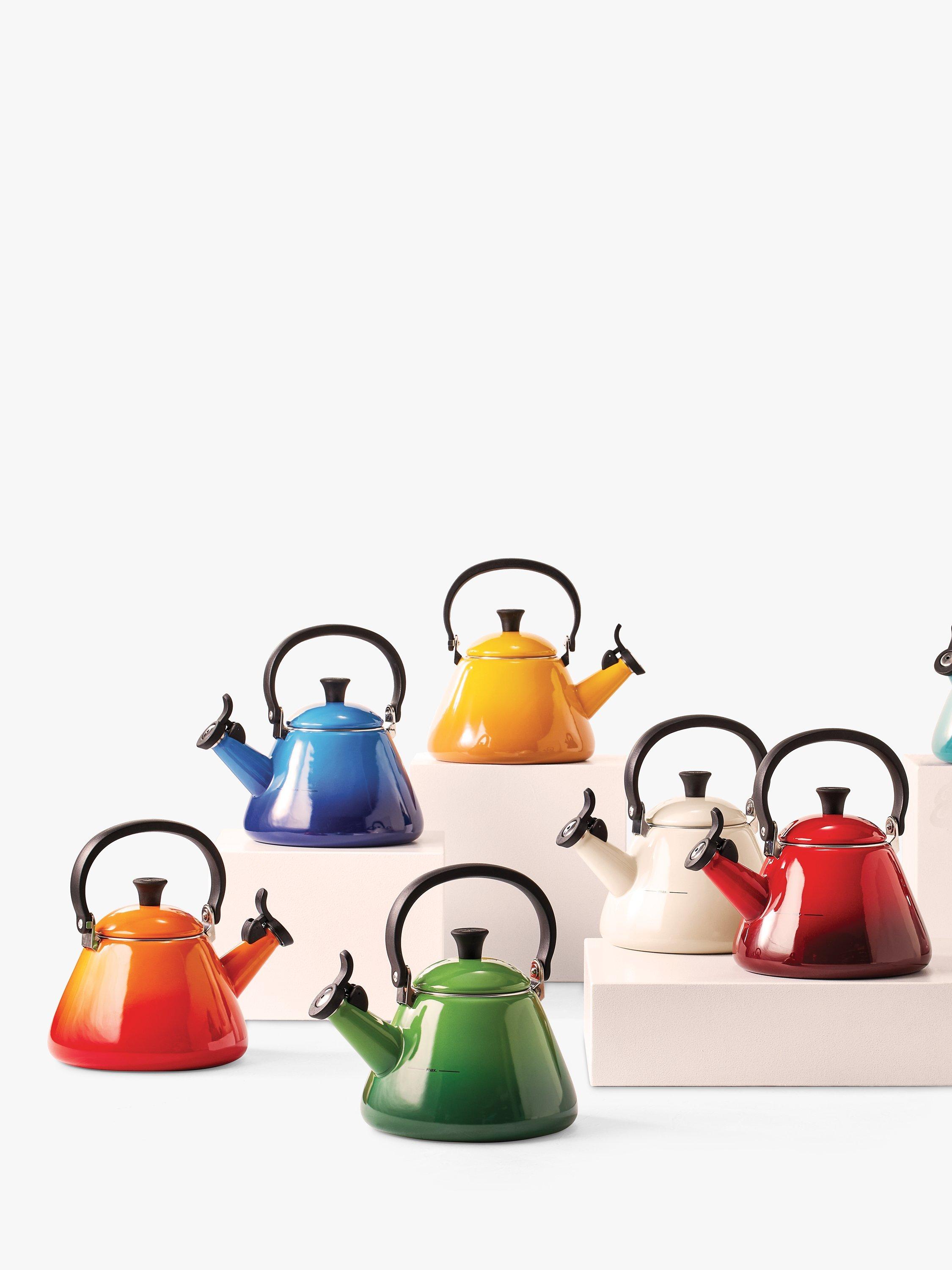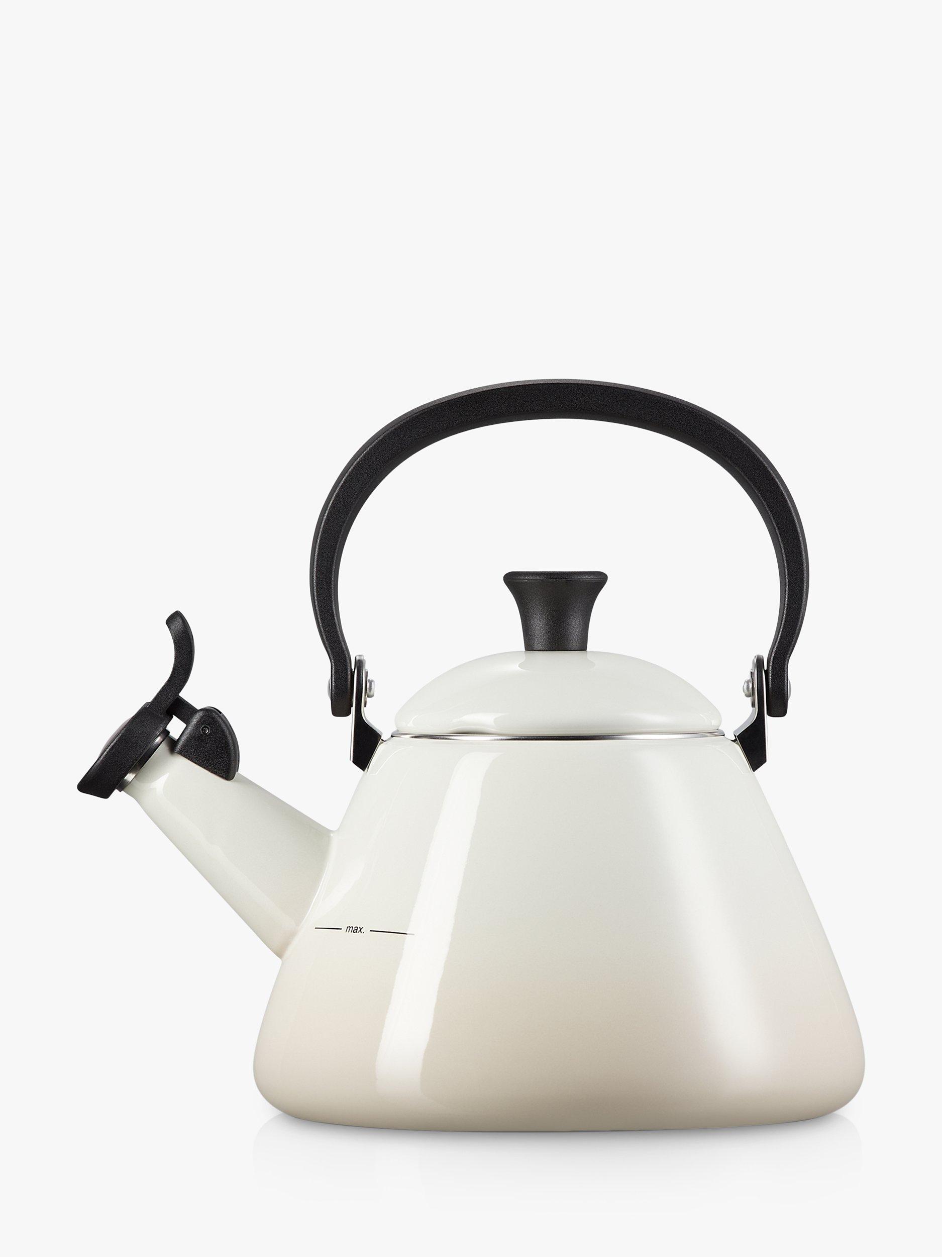 This kone-style enamelled stovetop kettle from Le Creuset has a wide base for fast and efficient heating. A whistle lets you know when the water has come to the boil.