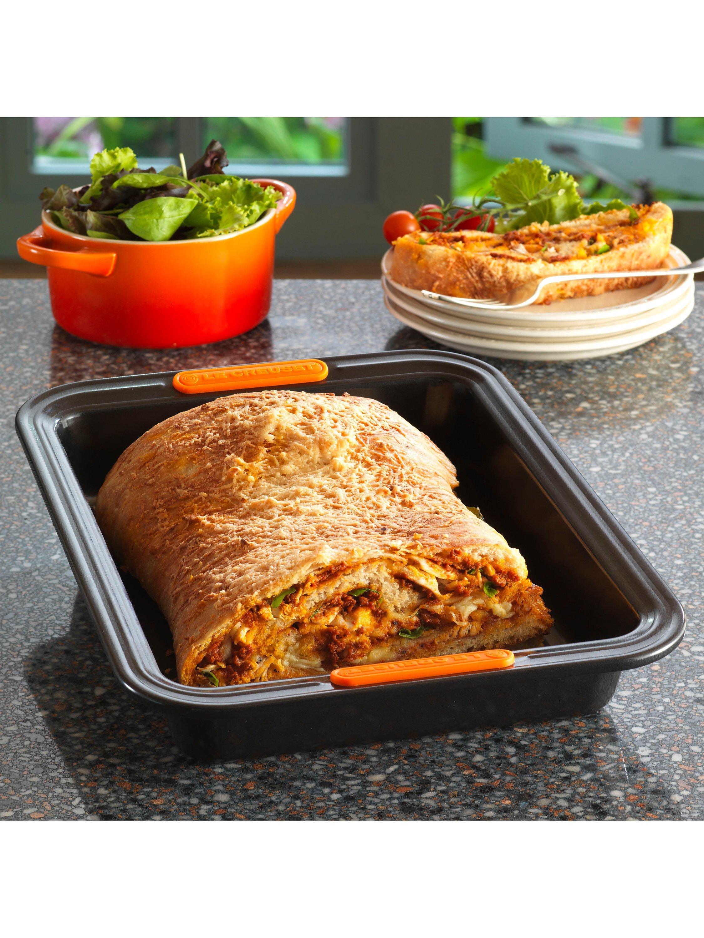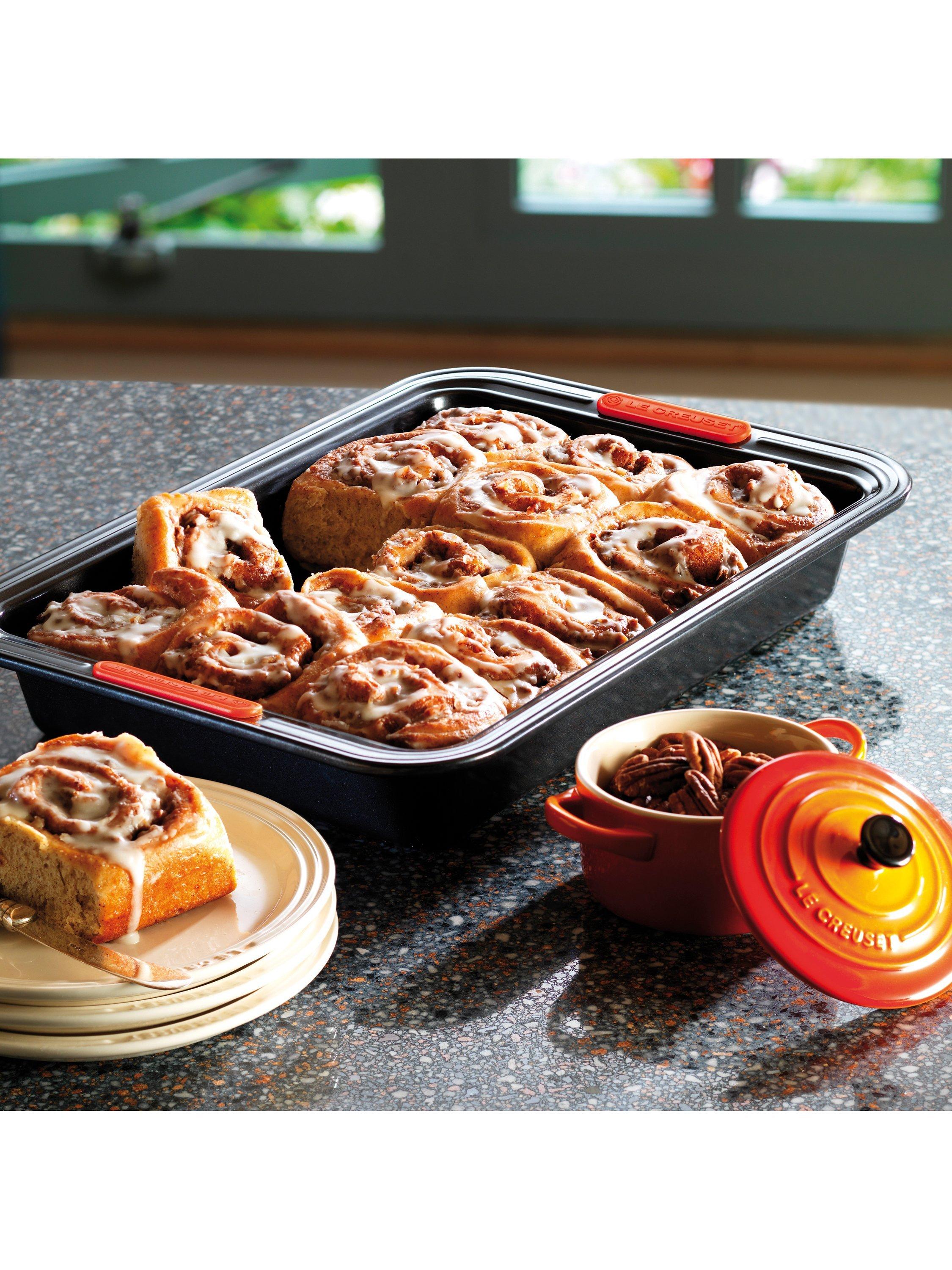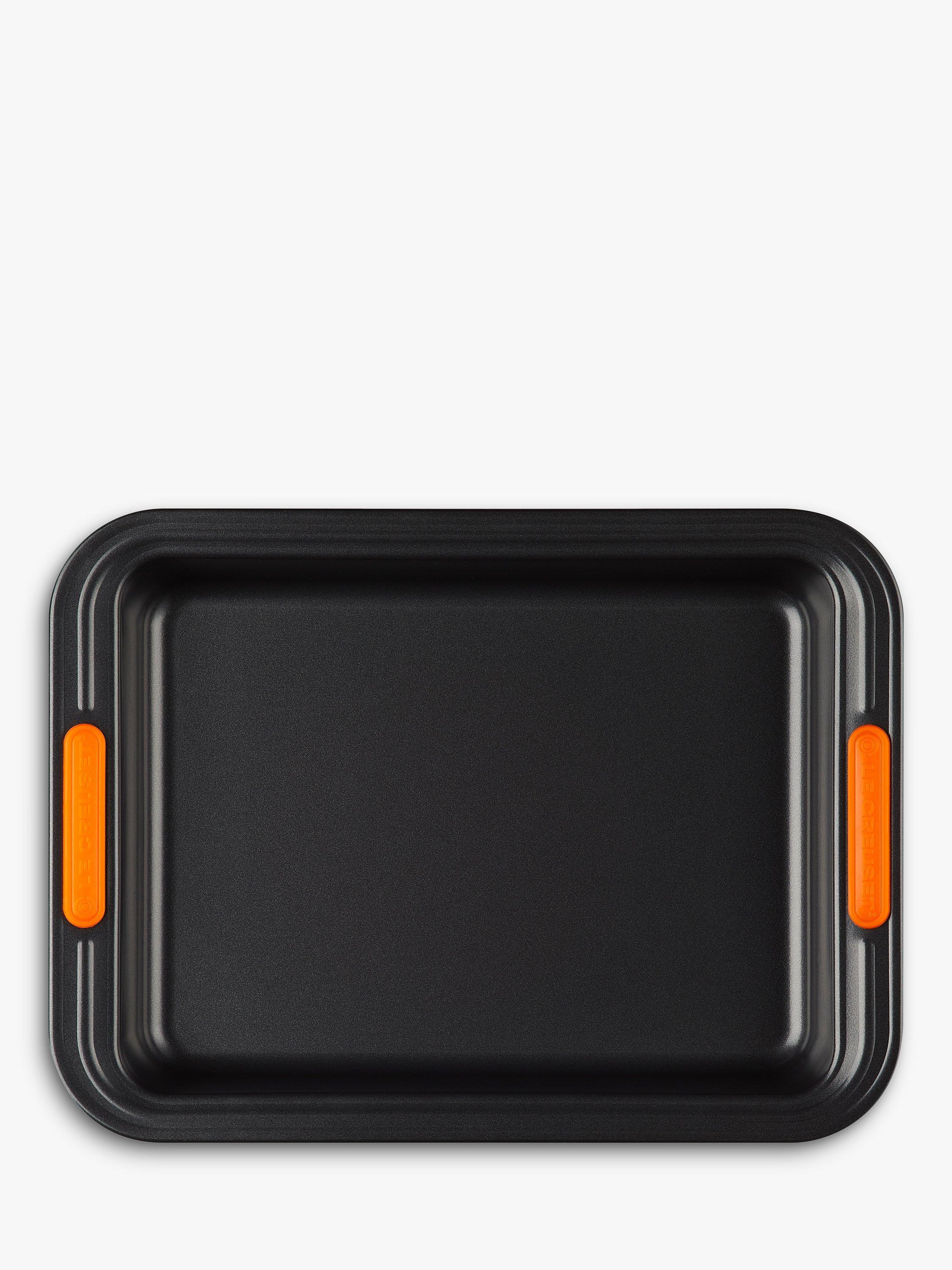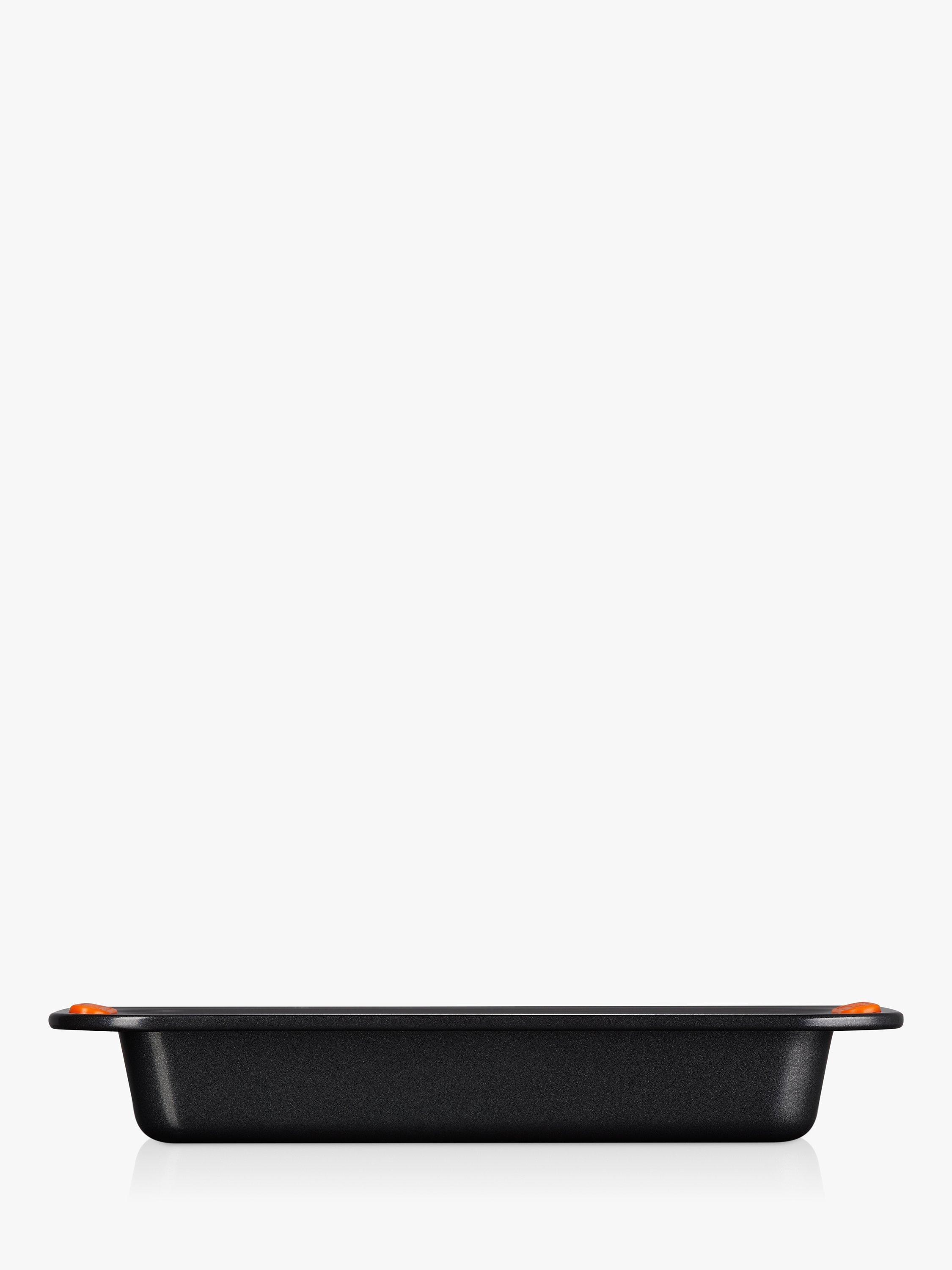 The generous size and versatile shape of the Rectangular Cake Tin from Le Creuset makes it indispensable. Perfect for making slab cakes, focaccia bread and gingerbread, it is also ideal to use as a shallow roasting tin or for pasta bakes. The wide rim on the outside of the tin, featuring heat-resistant silicone inserts for added grip, makes lifting a full tin easier and safer, especially when taking to and from a hot oven. The non-stick is even metal utensil safe.