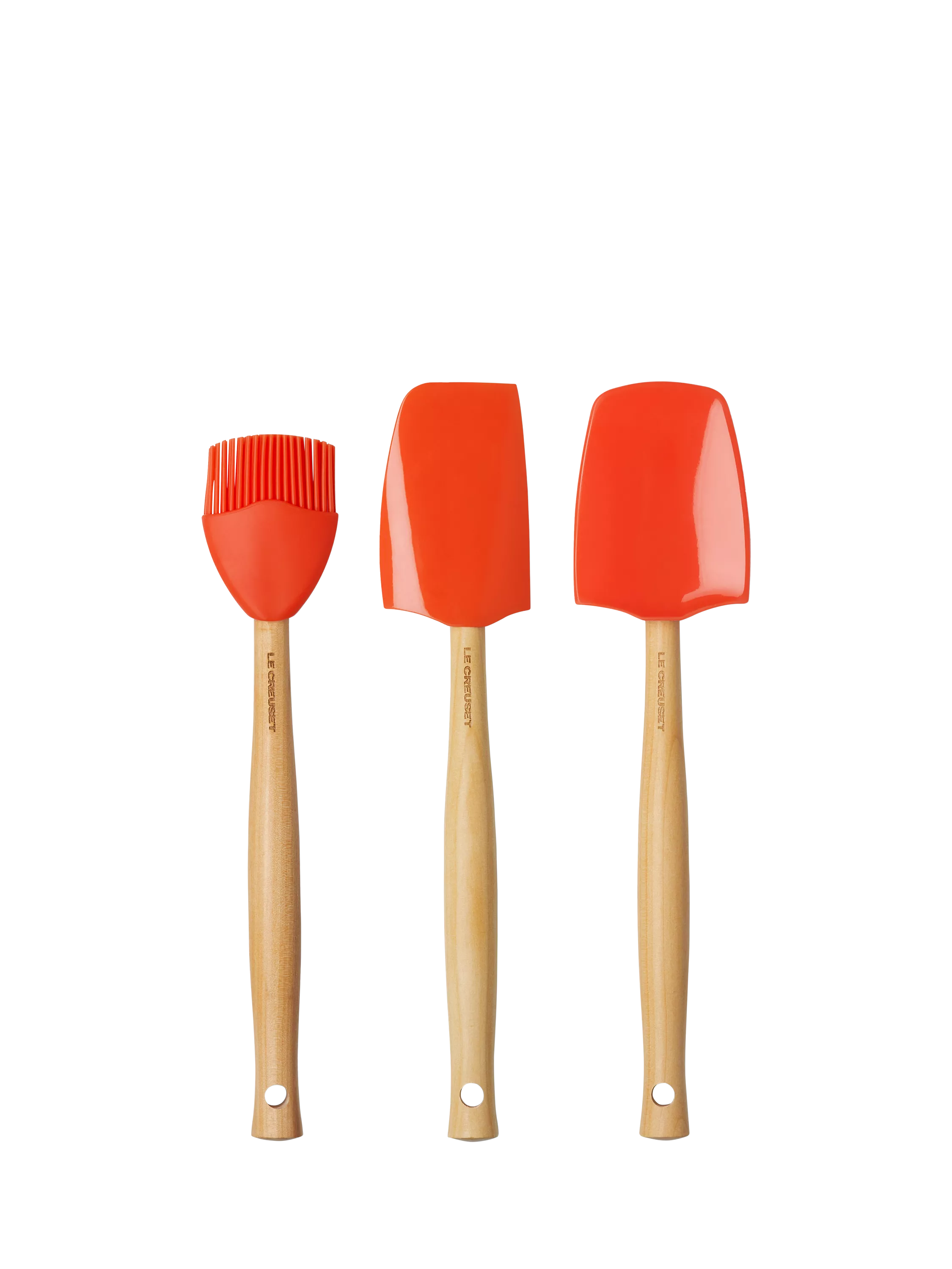 An essential trio for kitchen cooking and baking, from Le Creuset. The medium spatula, large spatula spoon and basting brush are made from premium silicone, and each tool is flexible to use and easy to clean. Silicone withstands temperatures of up to 250°C and is non-oxidising, stain-resistant and will not scratch or damage any cookware.