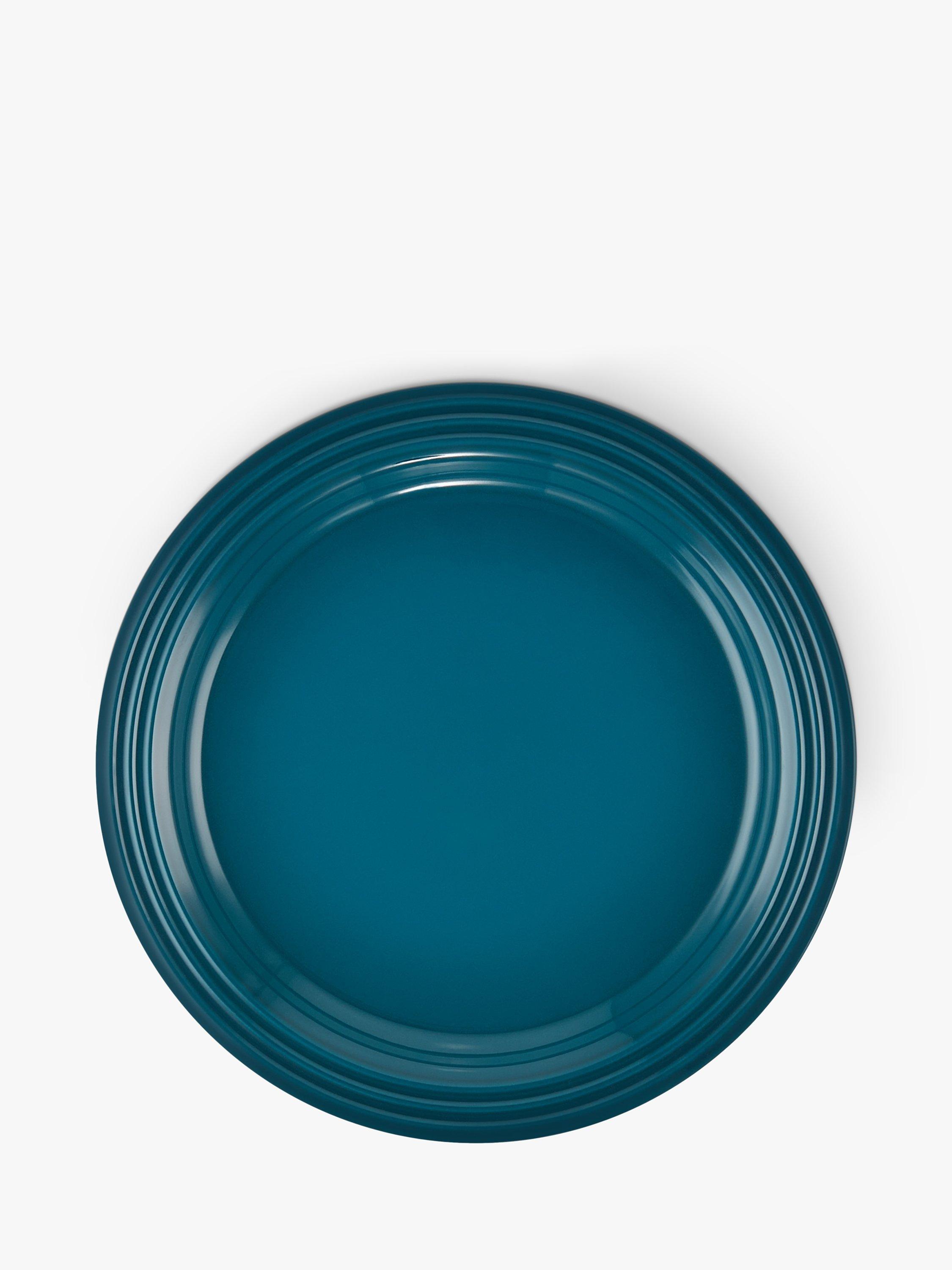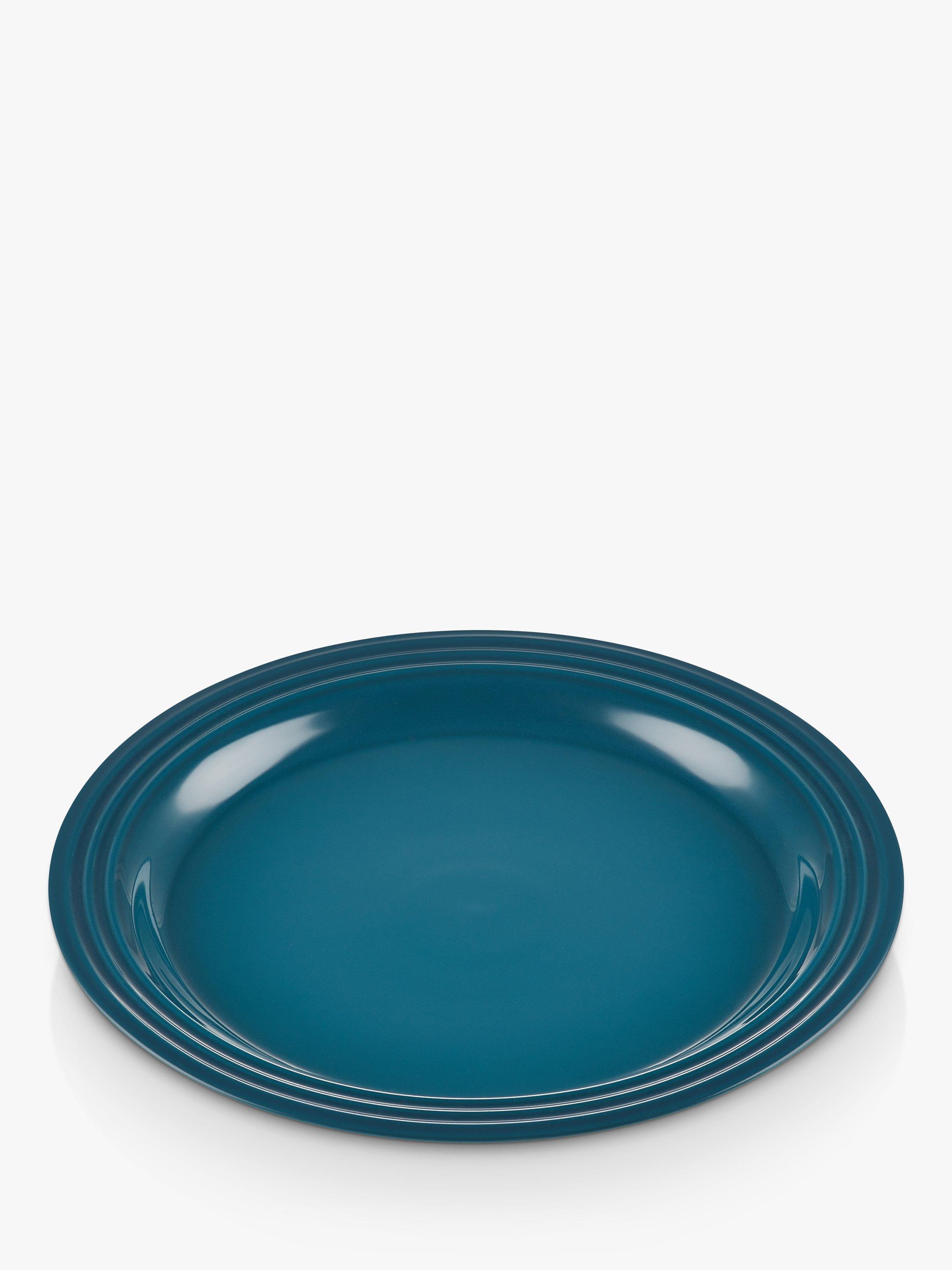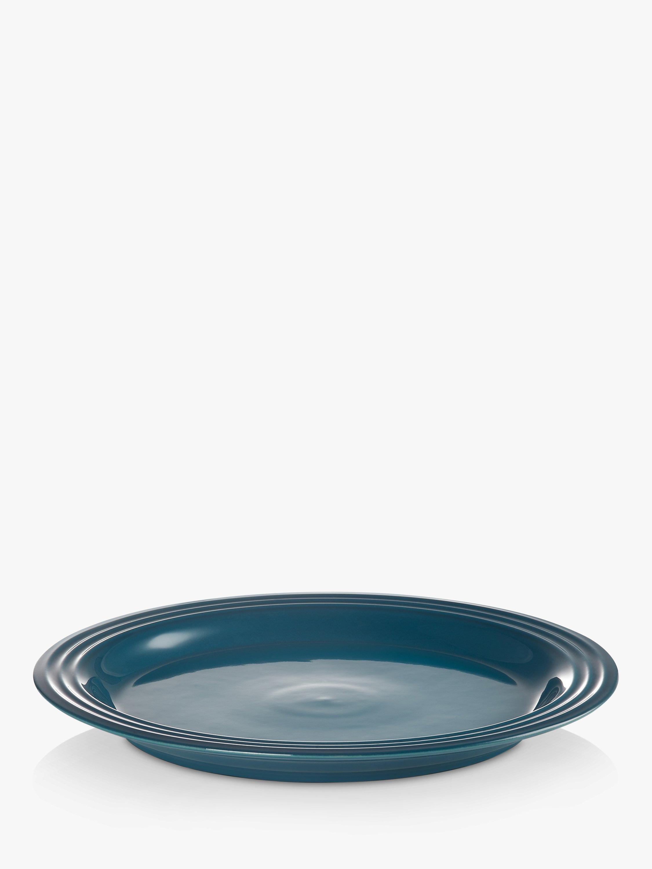 Le Creuset's distinctive three-ring branding on the rim of this dinner plate defines its look. It also has a recessed base to capture liquid.