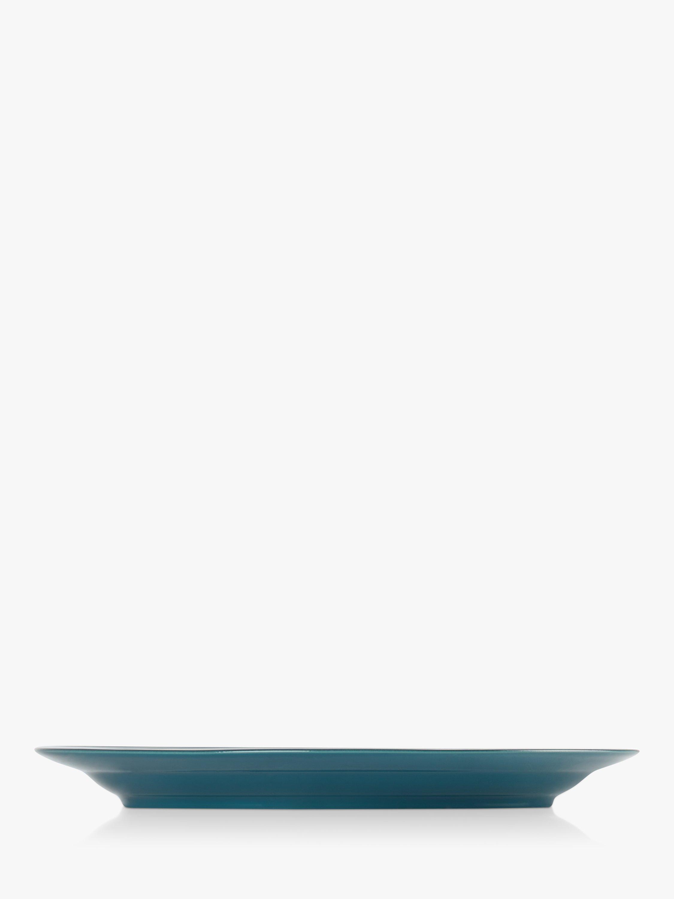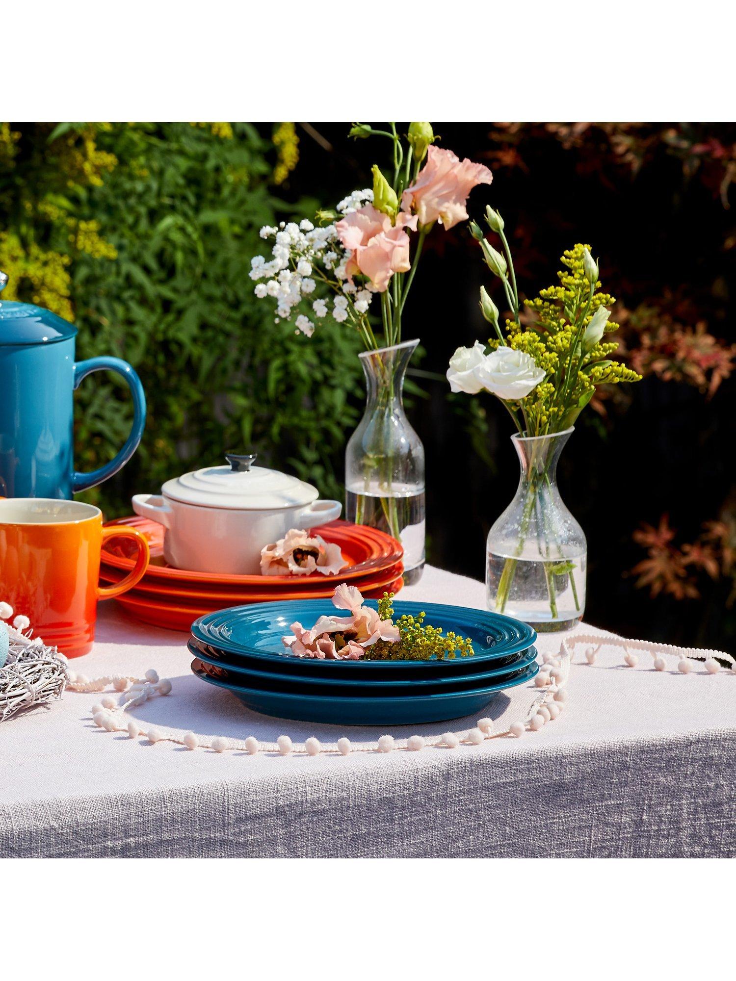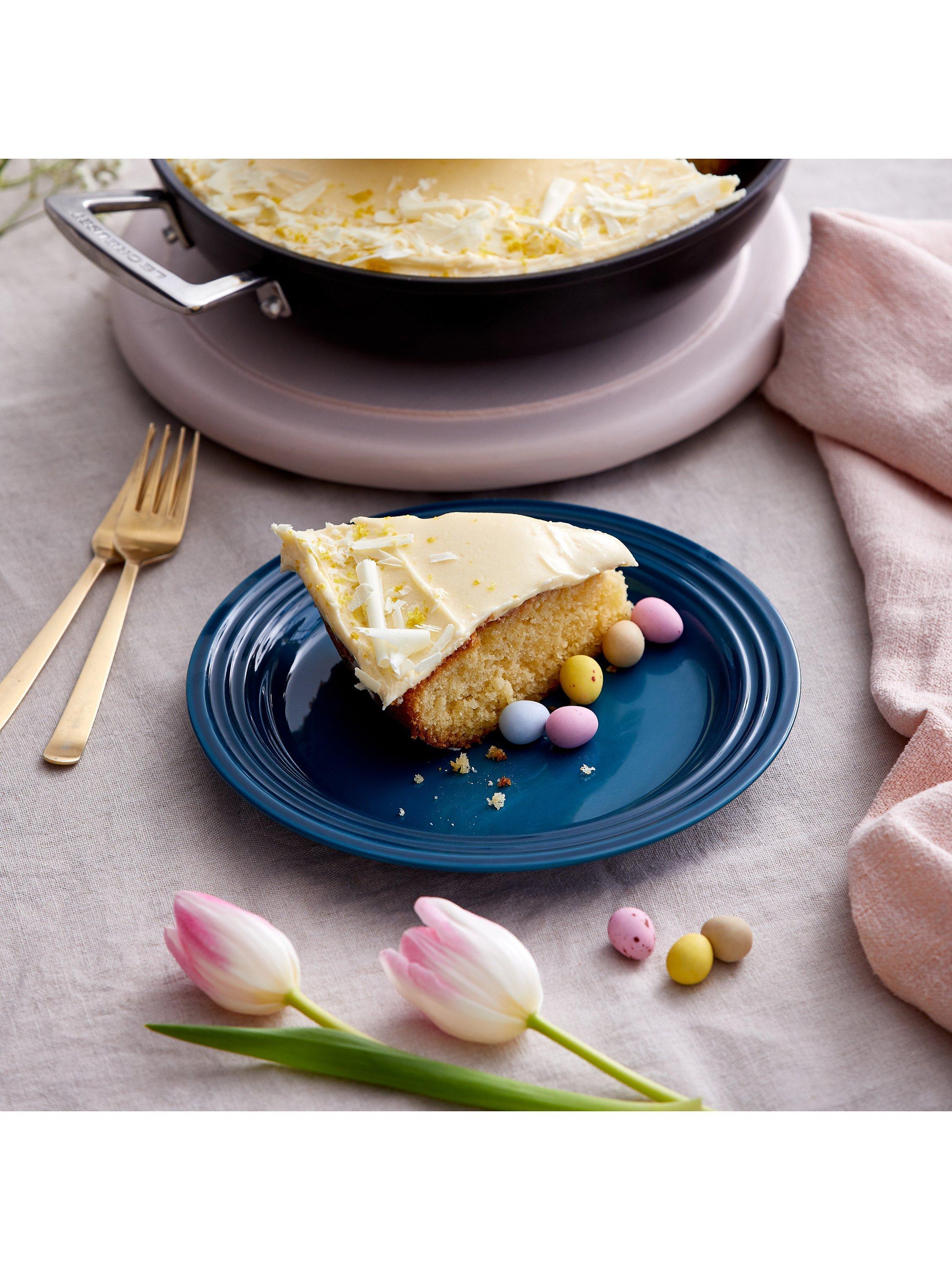 Le Creuset's distinctive three-ring branding on the rim of this dinner plate defines its look. It also has a recessed base to capture liquid.