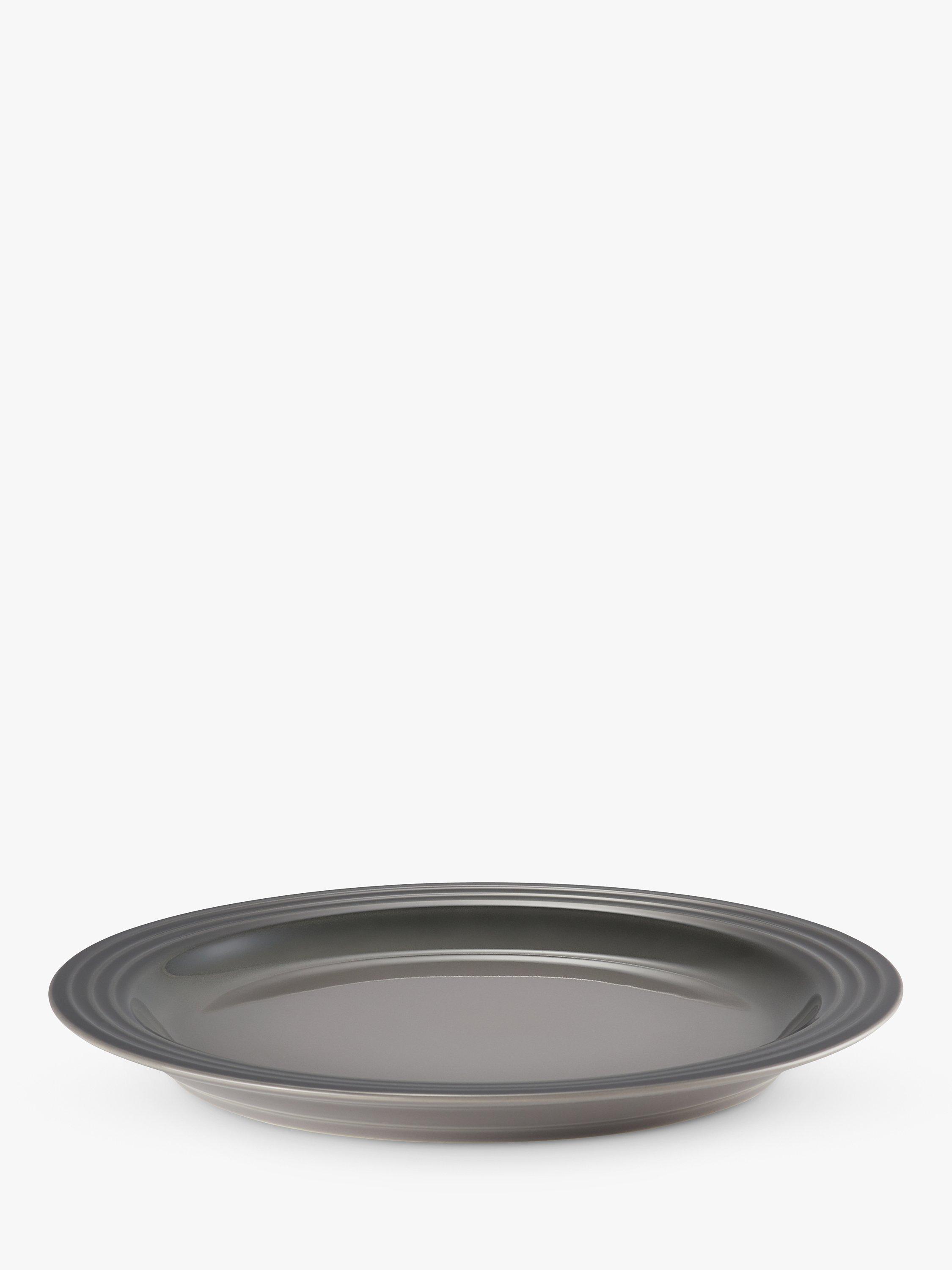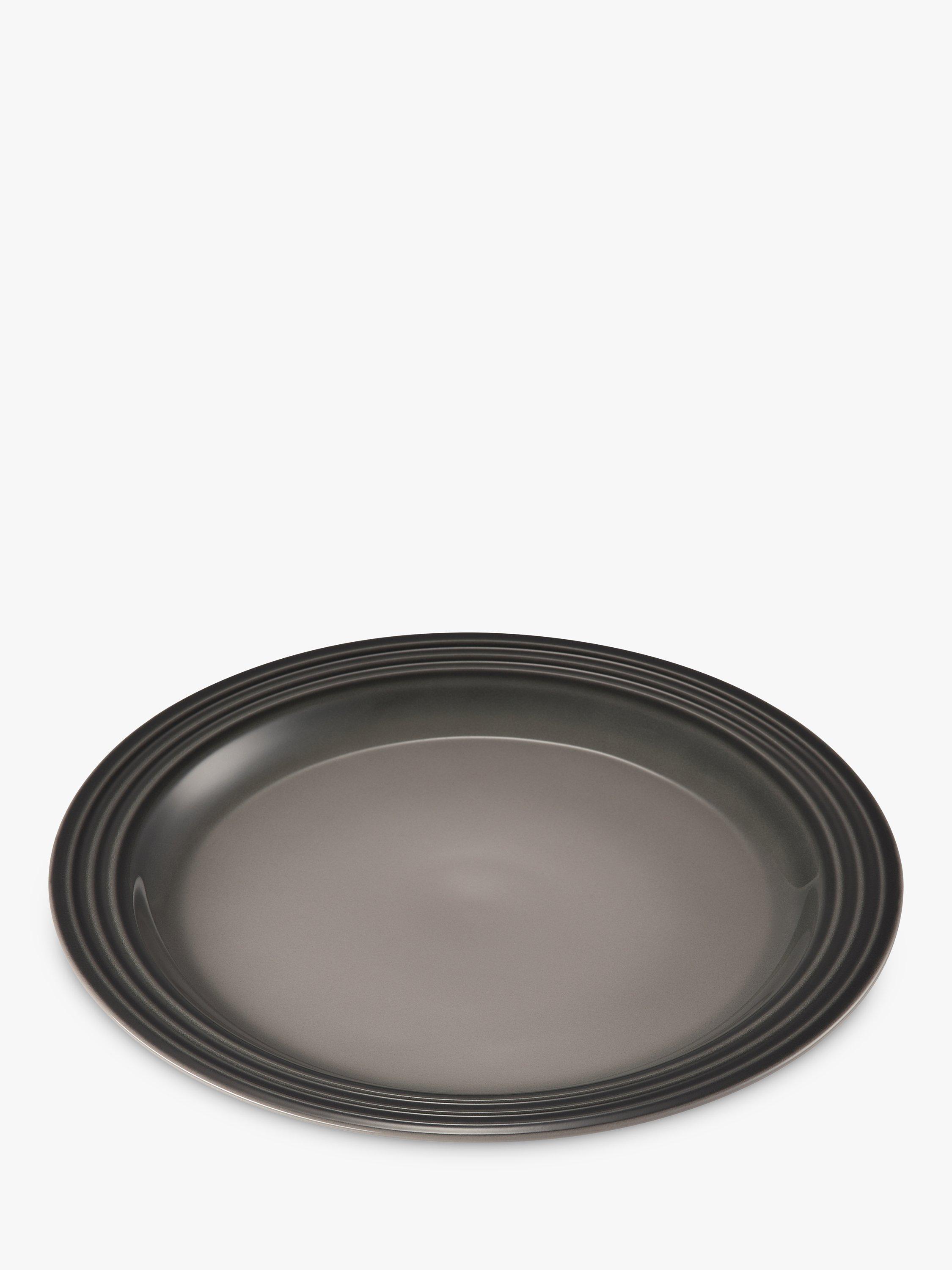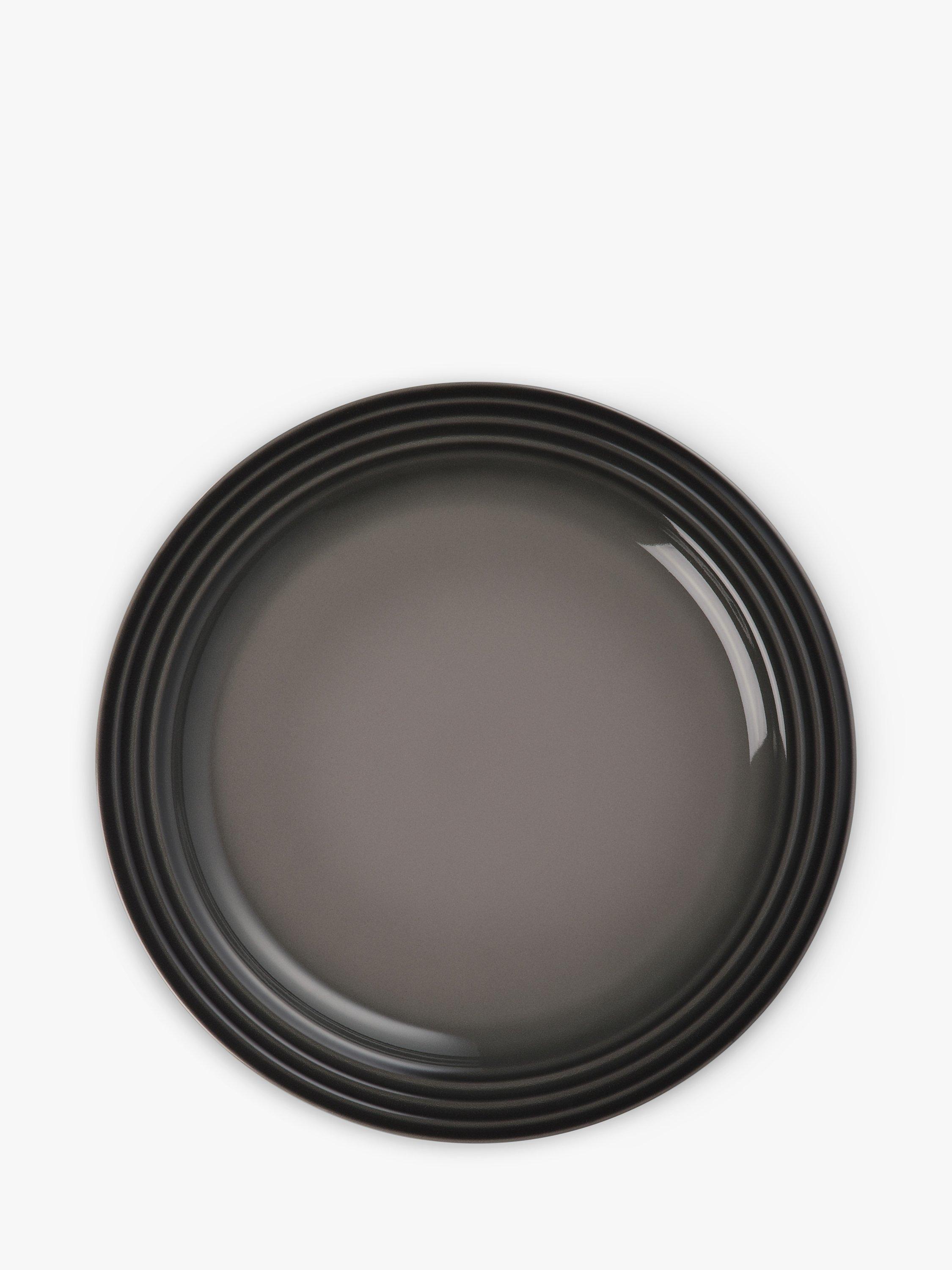 Le Creuset's distinctive three-ring branding on the rim of this dinner plate defines its look. It also has a recessed base to capture liquid.