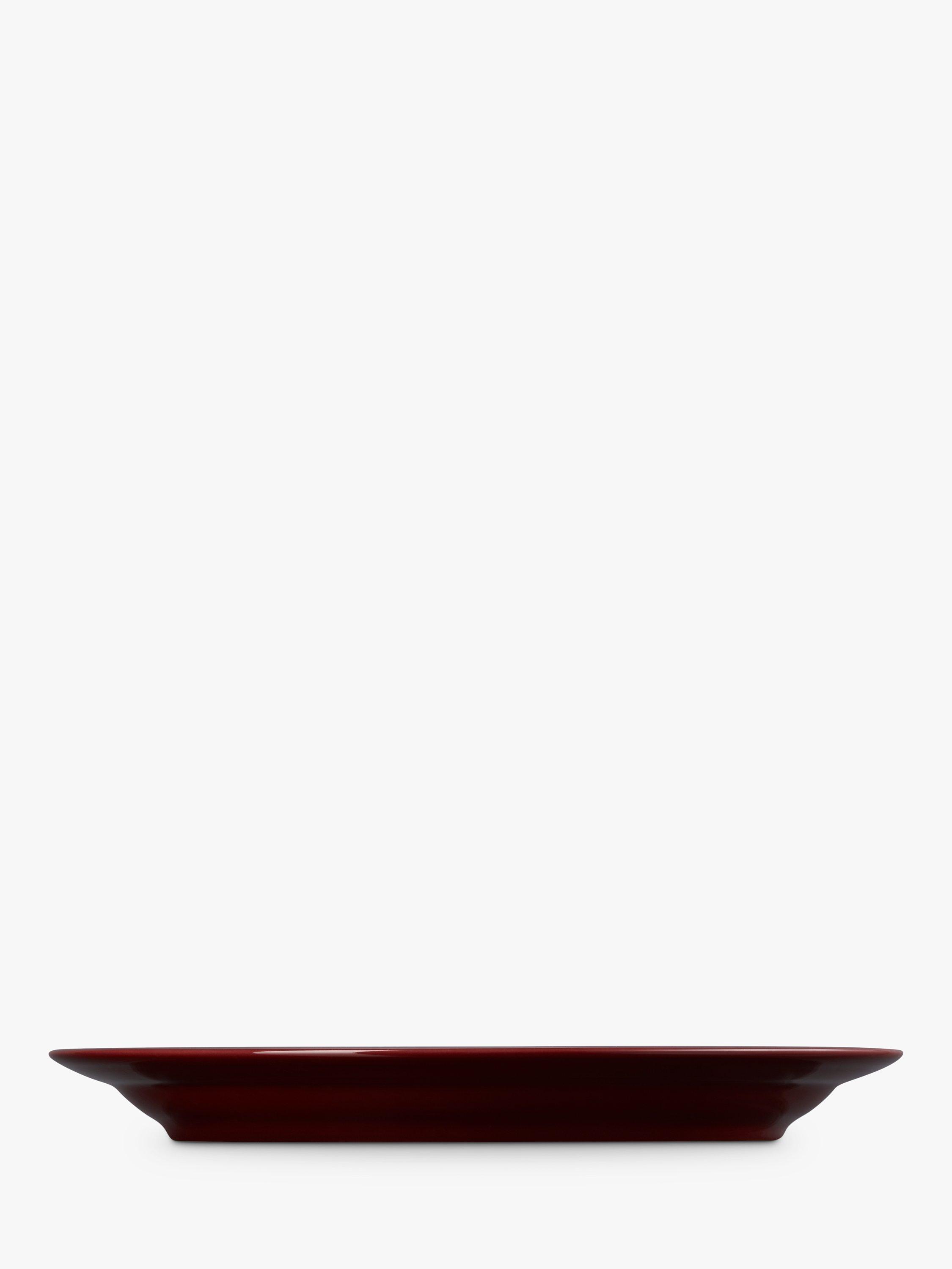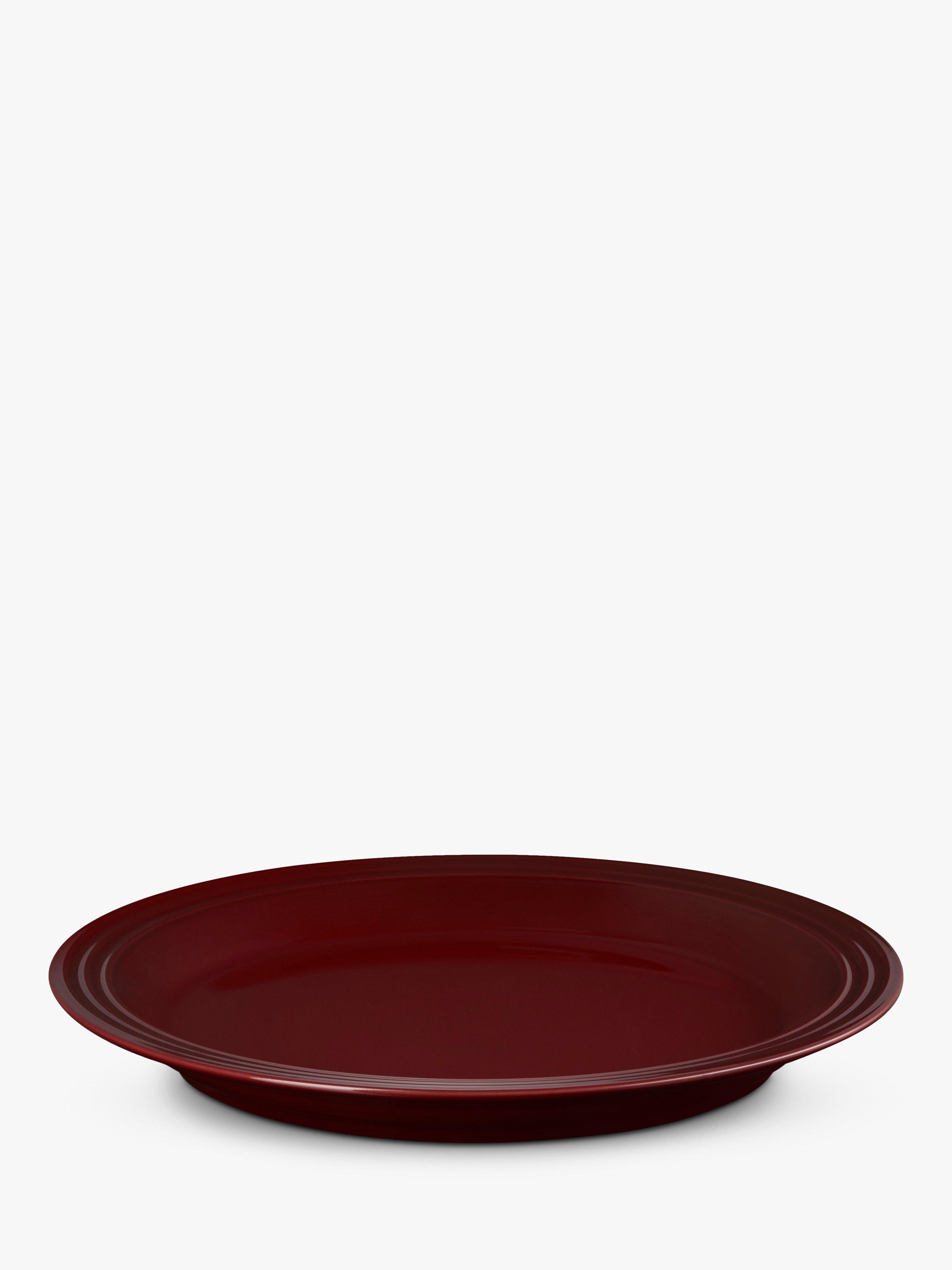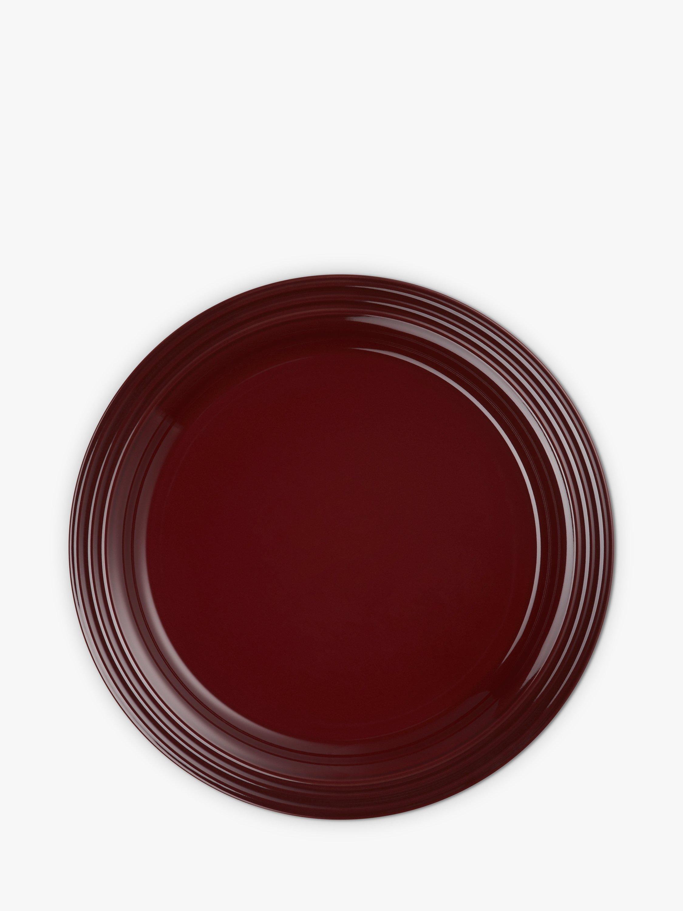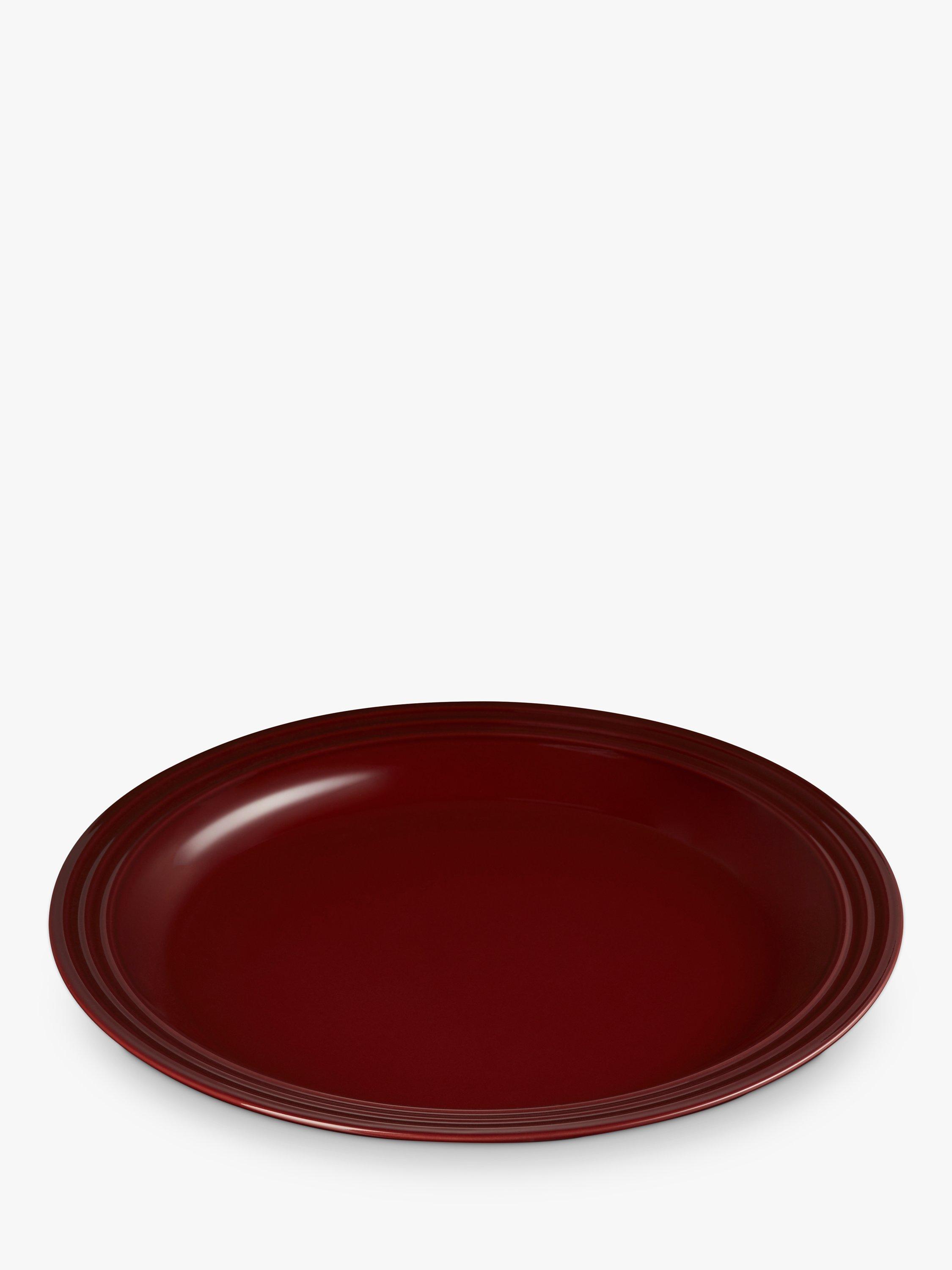 Le Creuset's distinctive three-ring branding on the rim of this dinner plate defines its look. It also has a recessed base to capture liquid.