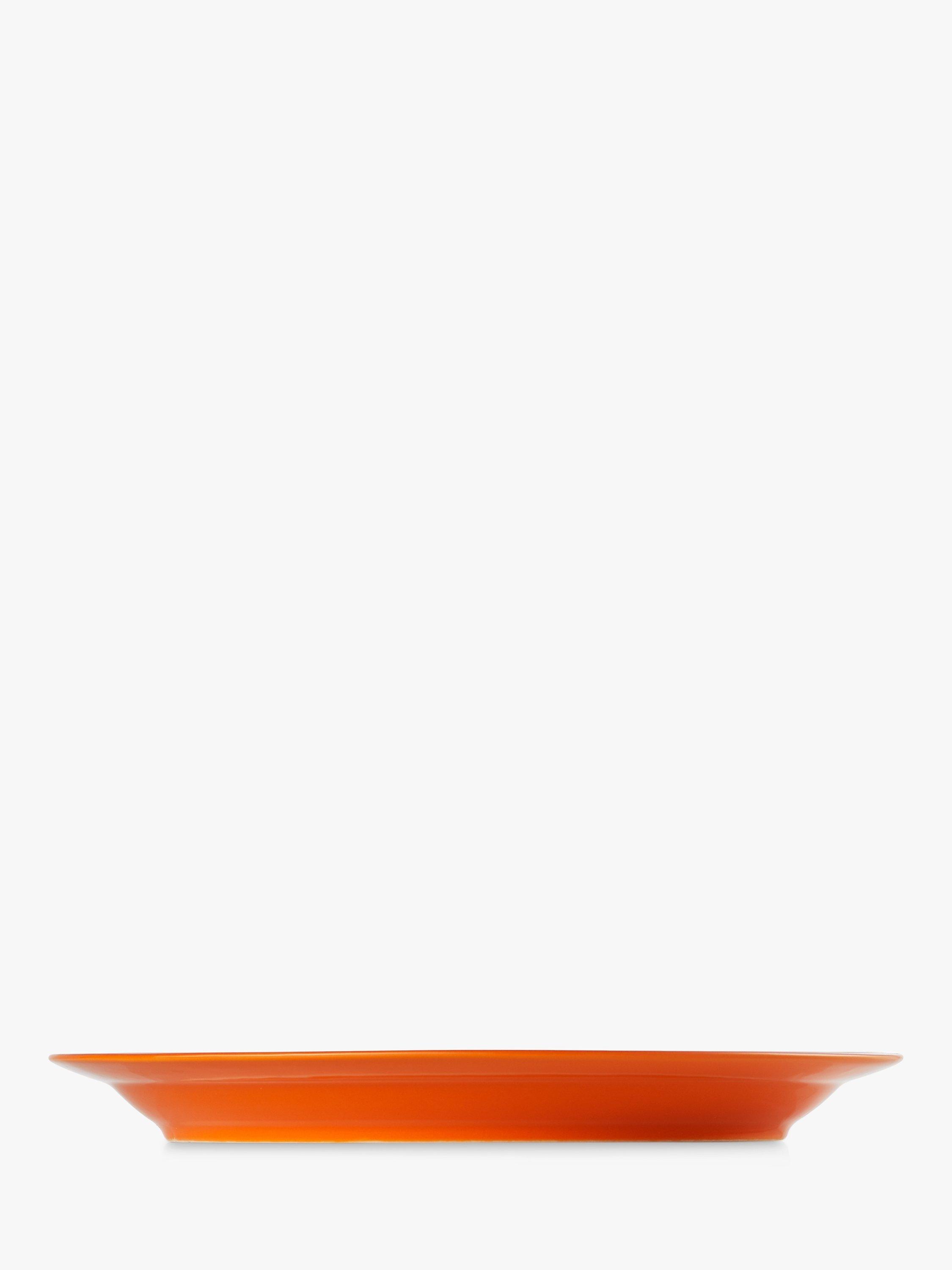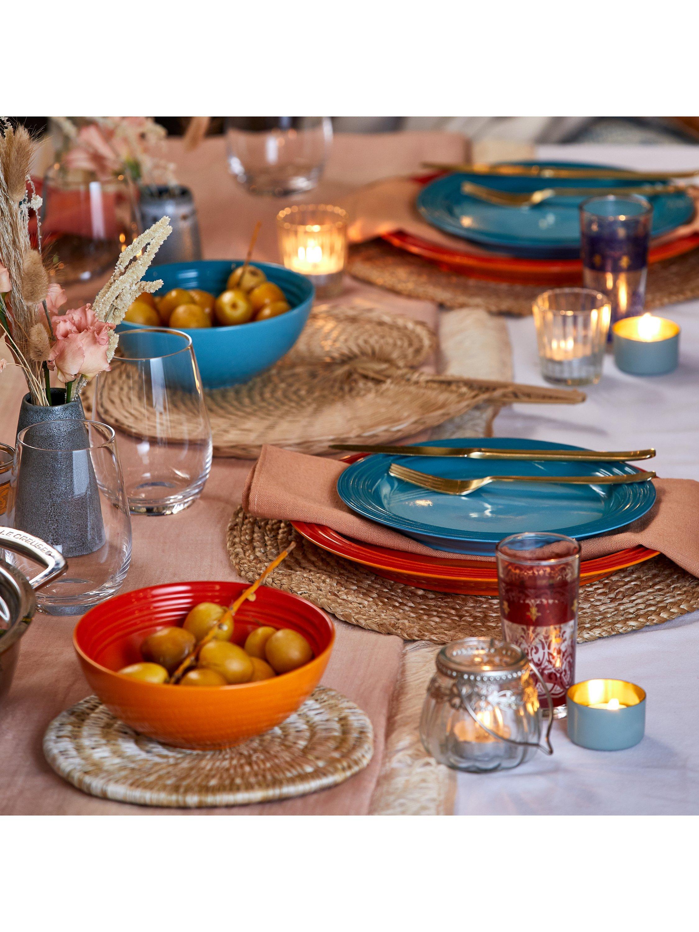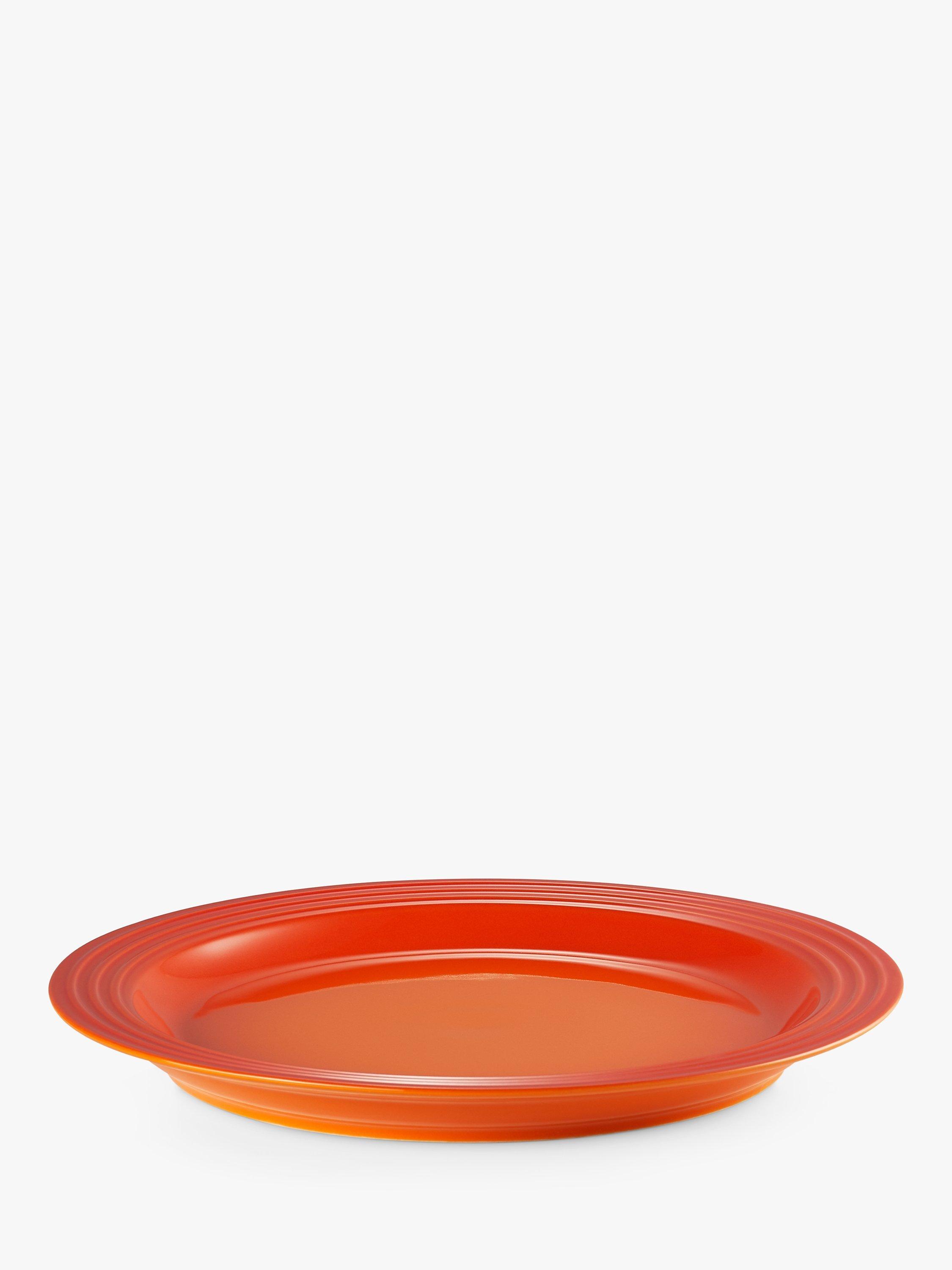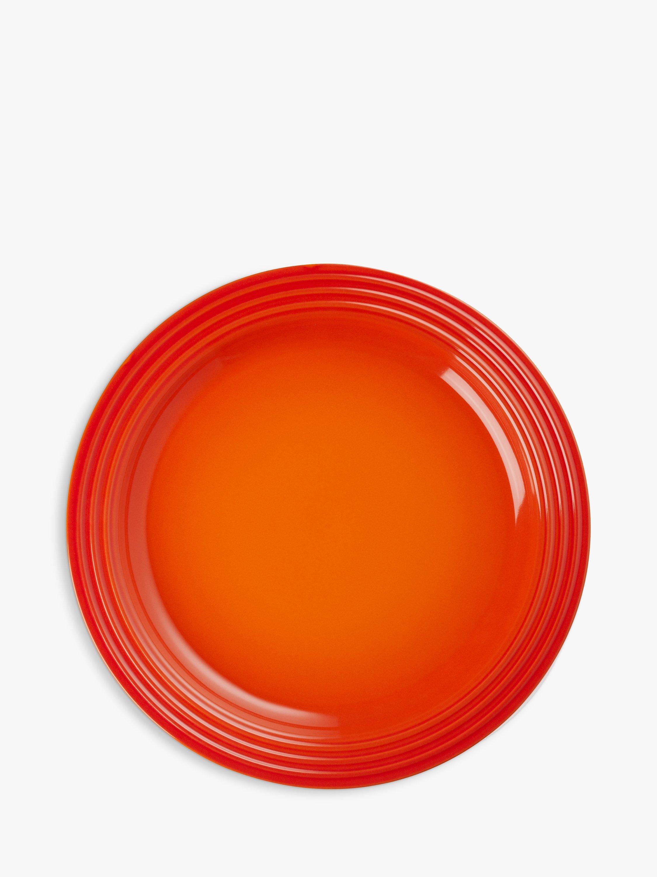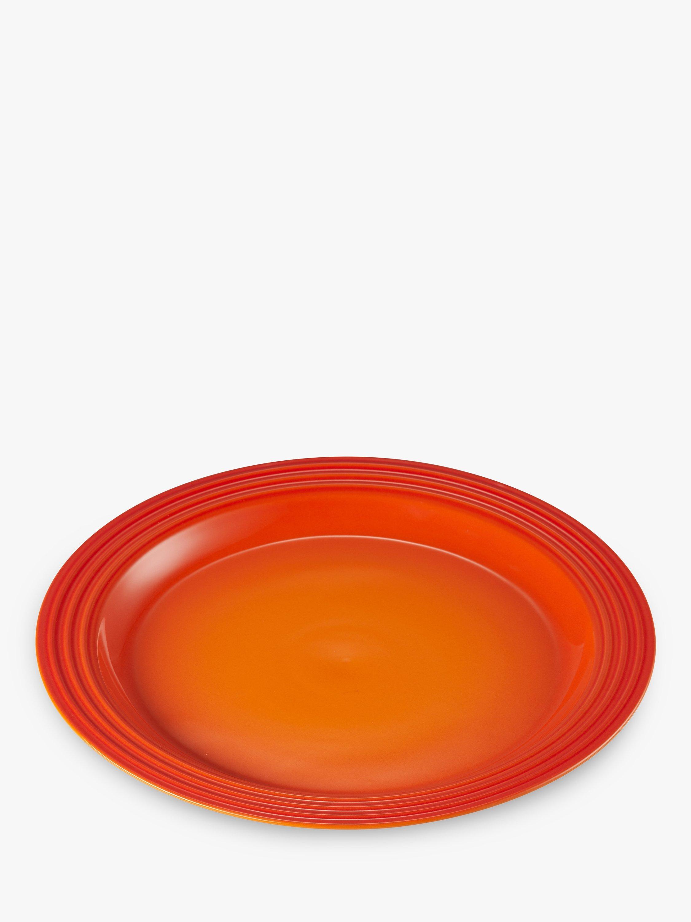 Le Creuset's distinctive three-ring branding on the rim of this dinner plate defines its look. It also has a recessed base to capture liquid.