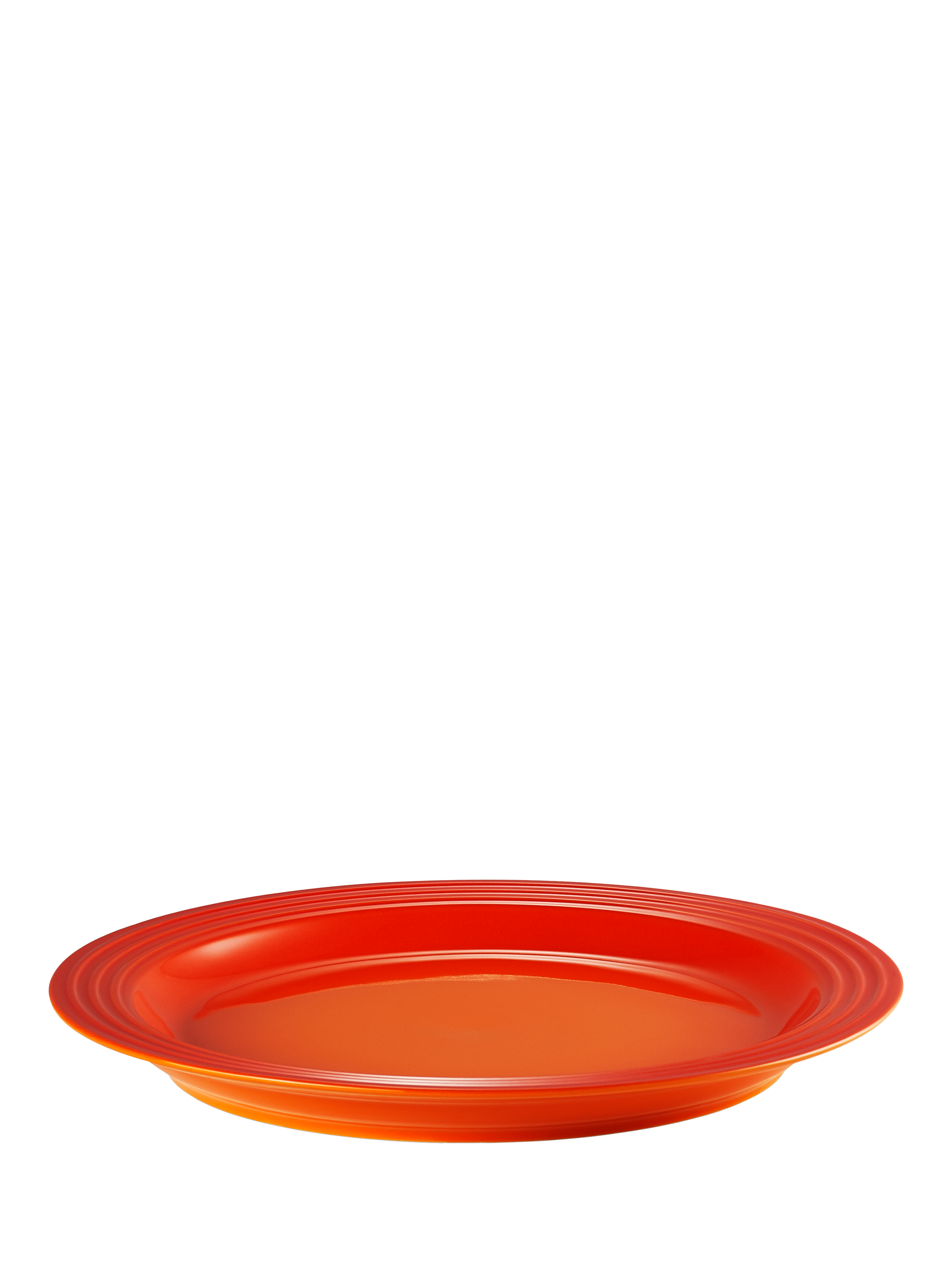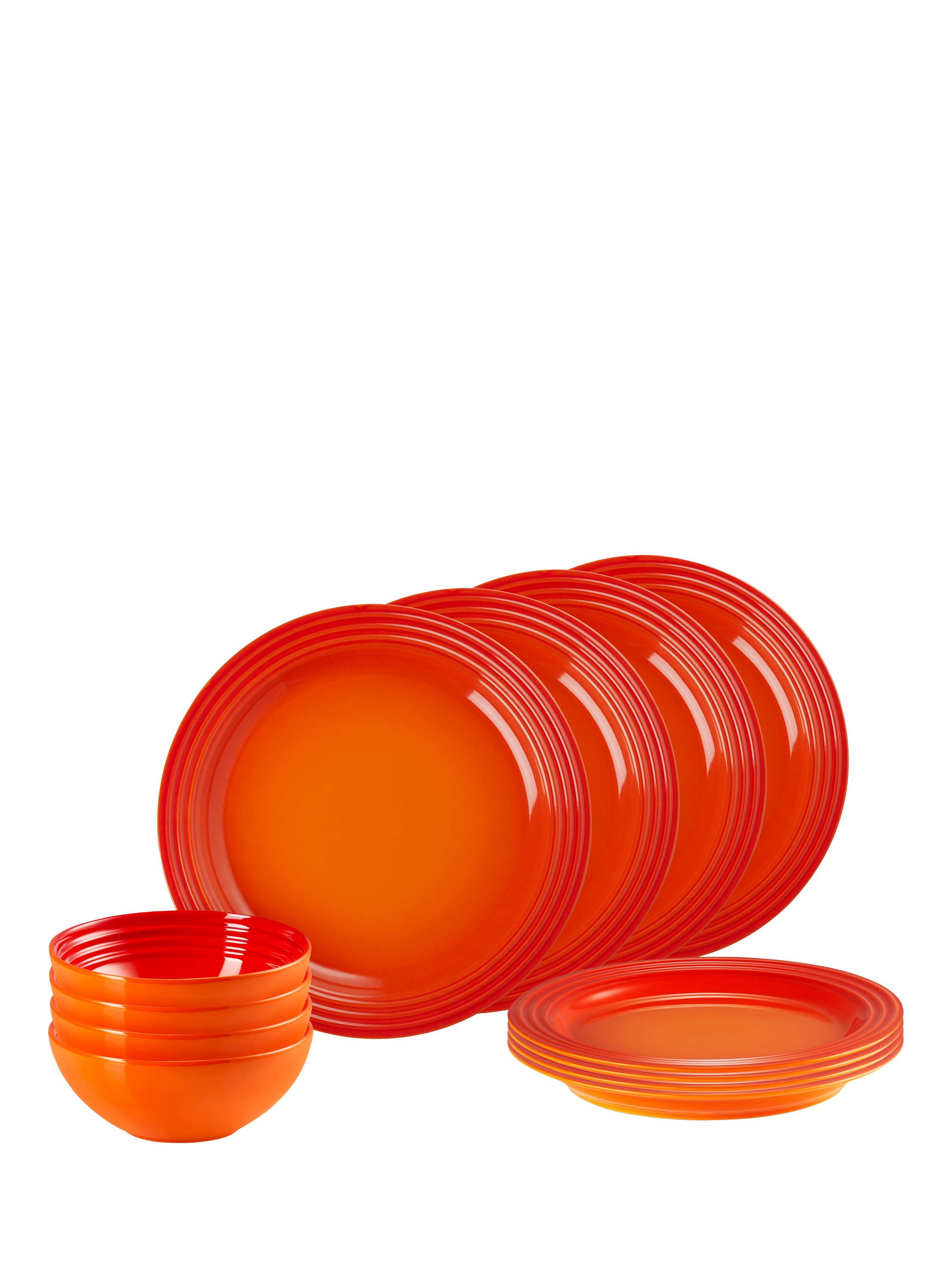 A colourful 12-piece dinnerware set from Le Creuset with distinctive three-ring branding on the rims. The set includes four 27cm dinner plates, four 22cm side plates and four 650ml cereal bowls.