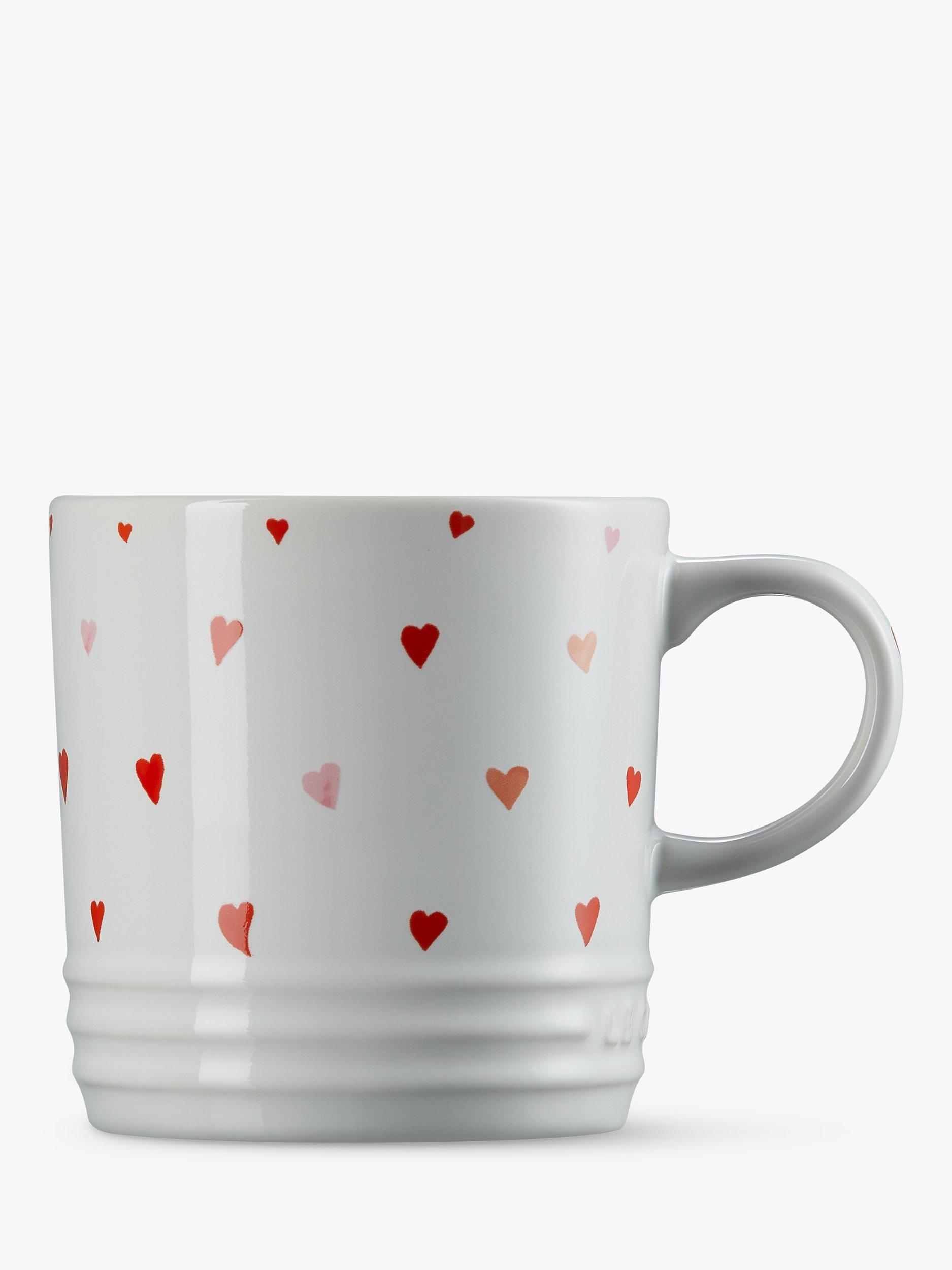 Part of Le Creuset's Heart Decal collection, this giftable stoneware mug is adorned with red and pink hand-painted watercolour-like hearts on a white background.