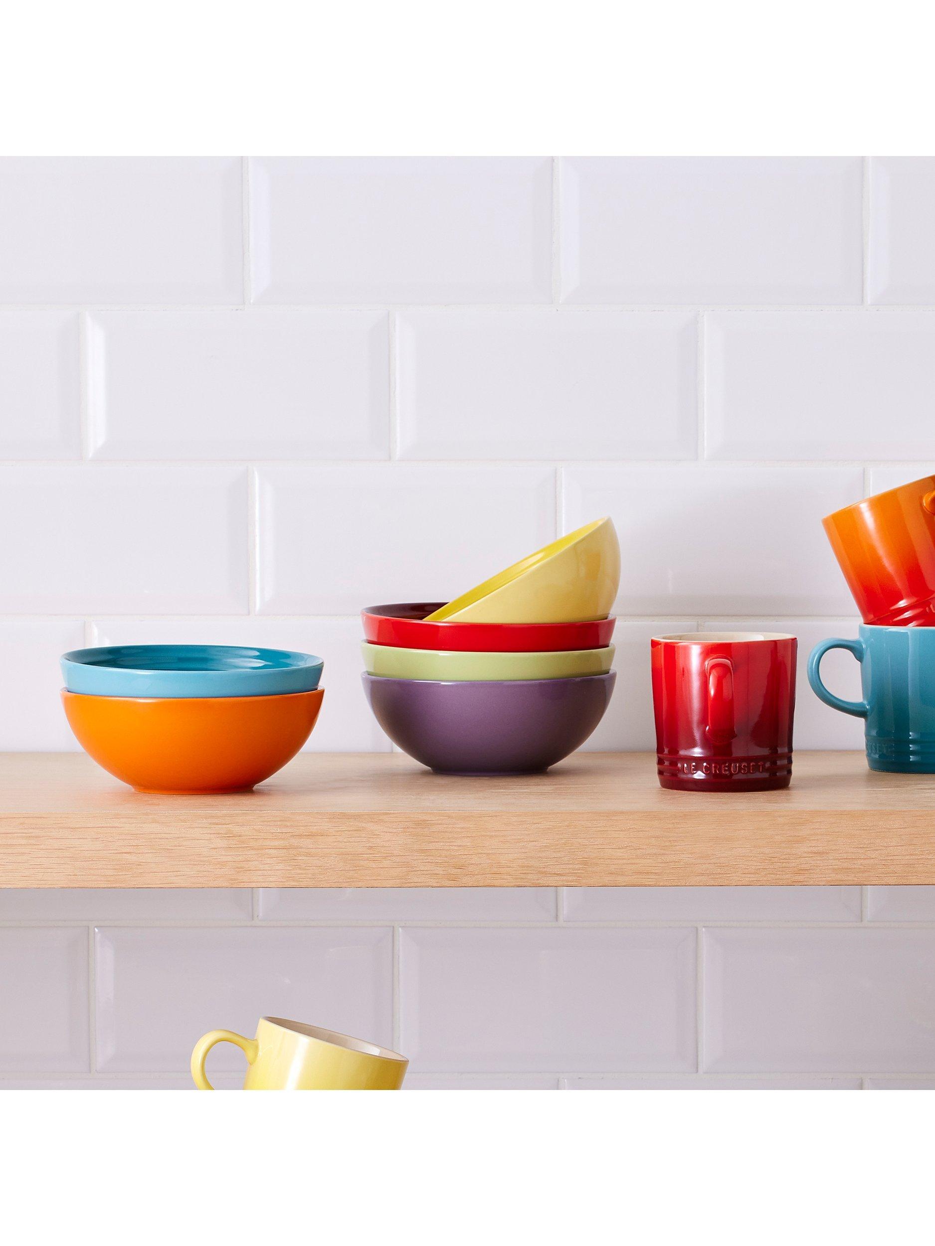 A set of six generously sized breakfast bowls bearing Le Creuset's distinctive three-ring branding on the rim. Ideal for cereal, porridge, soup and more, this rainbow set includes one of each in the Le Creuset colours Cerise, Volcanic, Soleil, Palm, Teal and Ultra Violet.