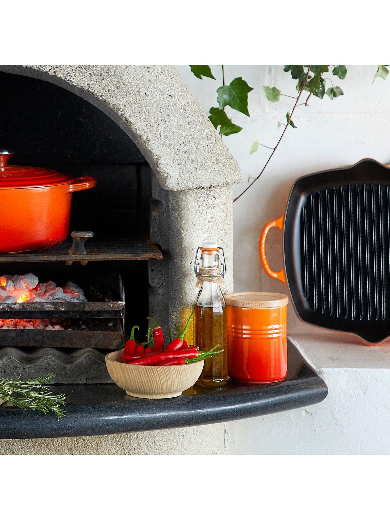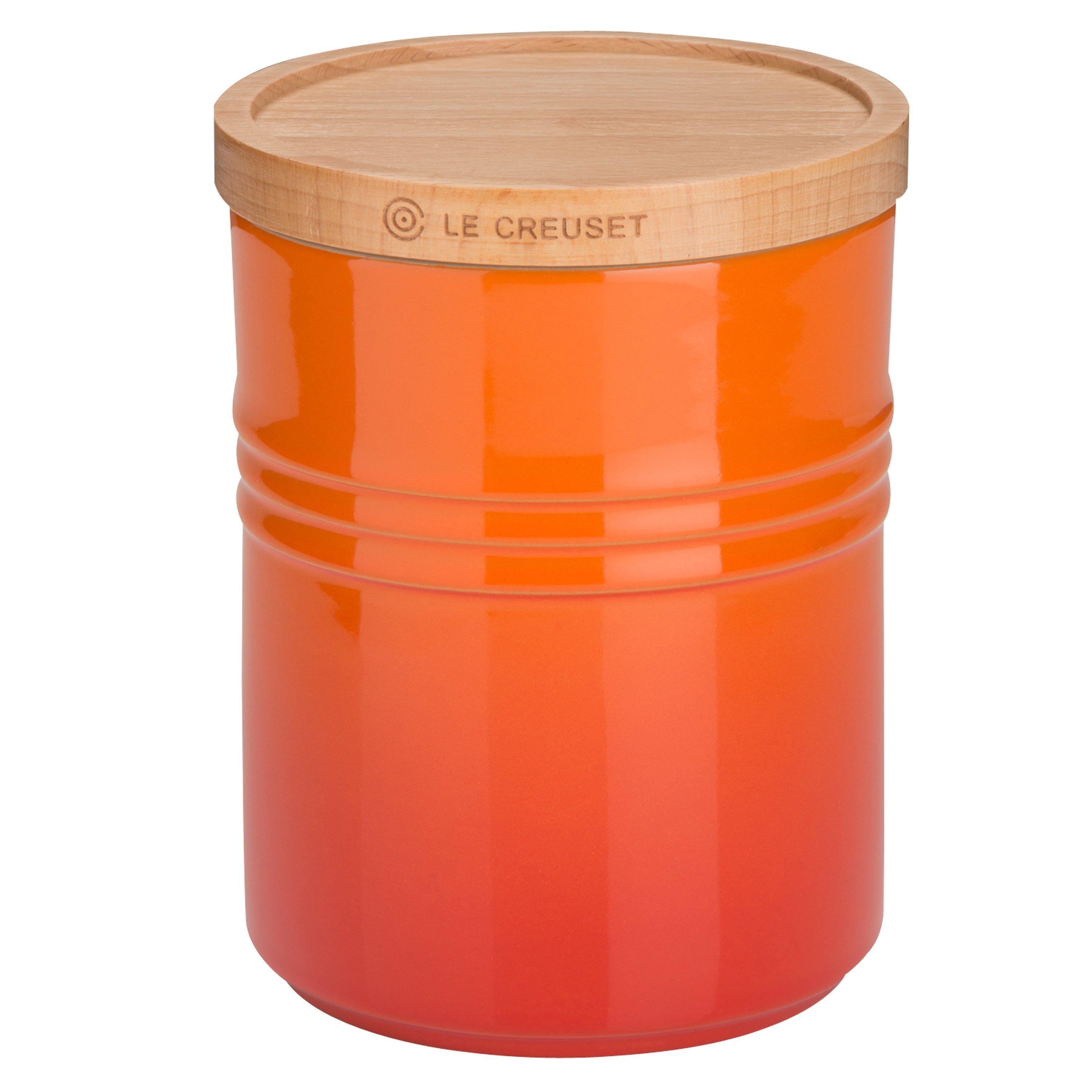 The container is stackable with similar Le Creuset containers for better use of cupboard and shelf space. The wooden lid is designed to perfectly fit and seal the jar. This jar is a wonderful way to add a pop of Le Creuset colour and functionality to your cooking space.
