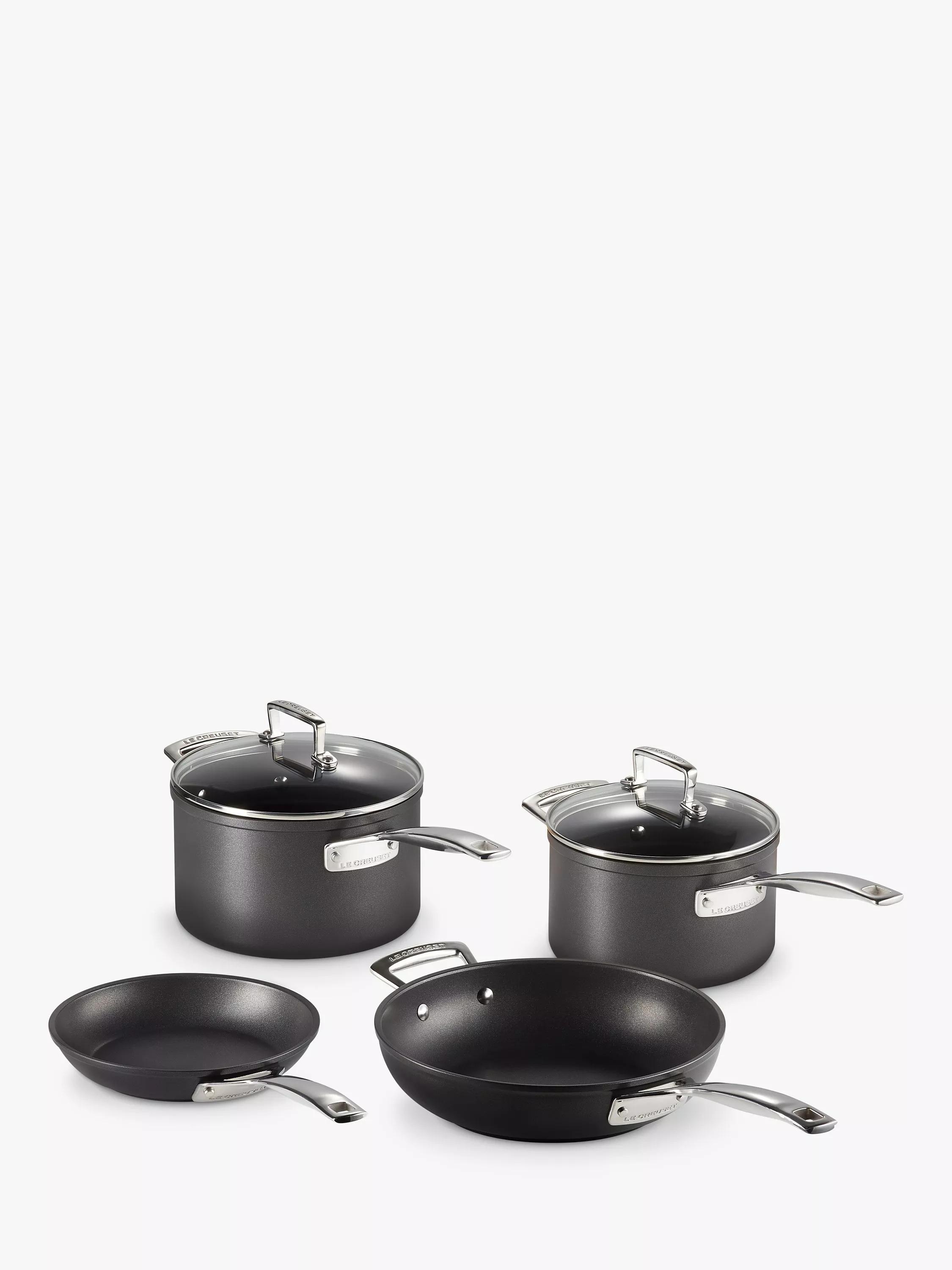 The perfect introduction to the Toughened Non-Stick range from Le Creuset, this four-piece cookware set contains a 20cm shallow frying pan, 26cm deep frying pan, plus 18cm and 20cm saucepans with glass lids.