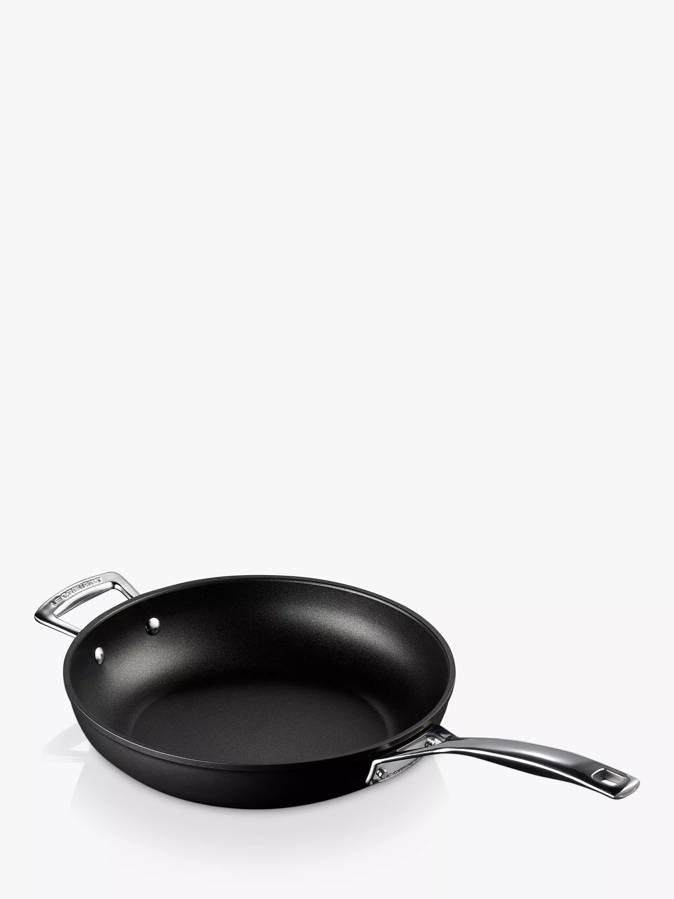A deep frying pan designed with a helper handle, from Le Creuset's Toughened Non-Stick cookware range. The Toughened Non-Stick range boasts innovative technology from its three-layer reinforced non-stick surface to the induction-compatible base. Cookware is made from high-quality, hard-anodised forged aluminium for excellent heat retention and even heat distribution.