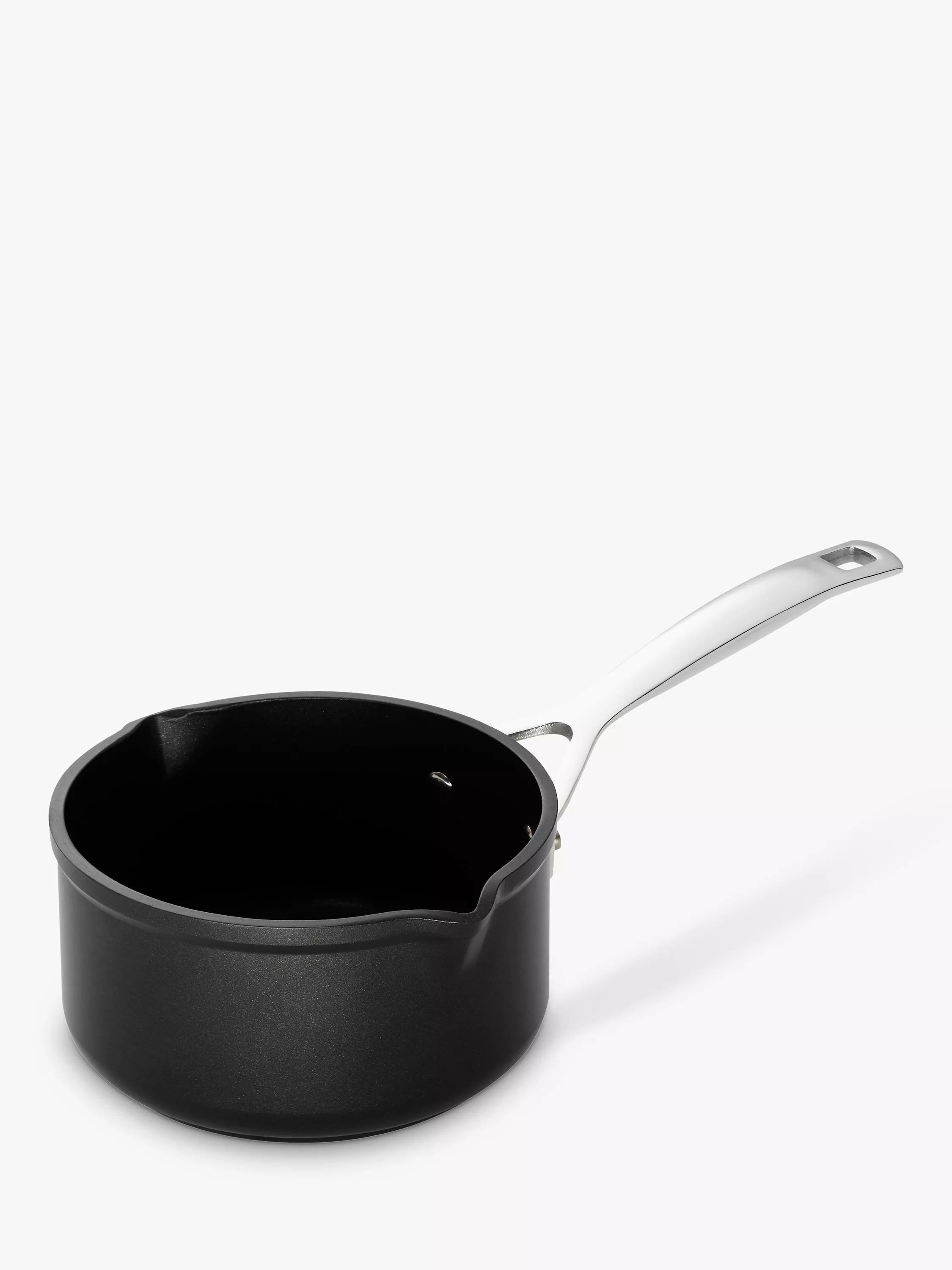 A milk pan from Le Creuset's Toughened Non-Stick cookware range, with two pouring spouts, for right or left-handed use. The Toughened Non-Stick range boasts innovative technology from its three-layer reinforced non-stick surface to the induction-compatible base. The cookware is made from high-quality, hard-anodised forged aluminium for excellent heat retention and even heat distribution.