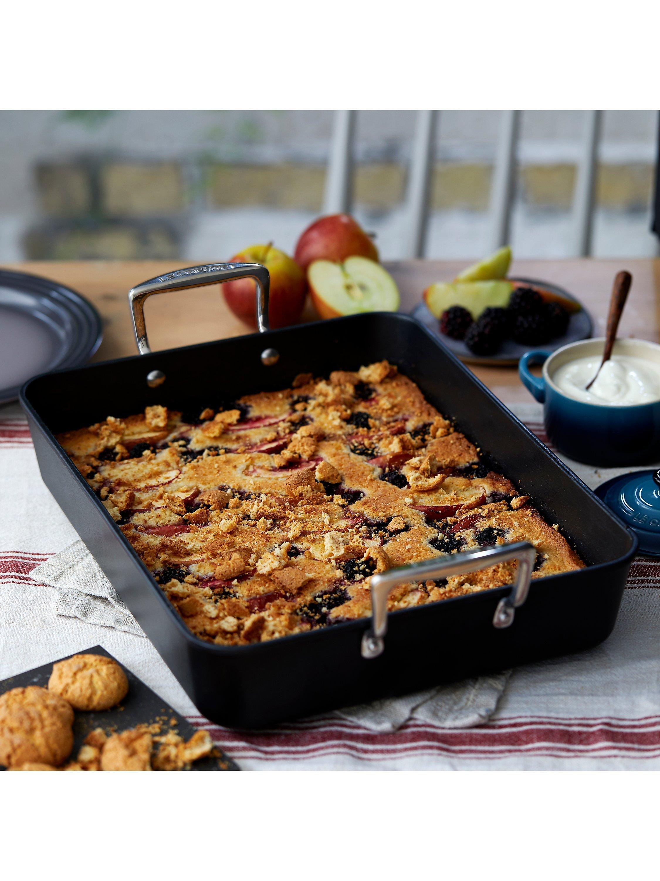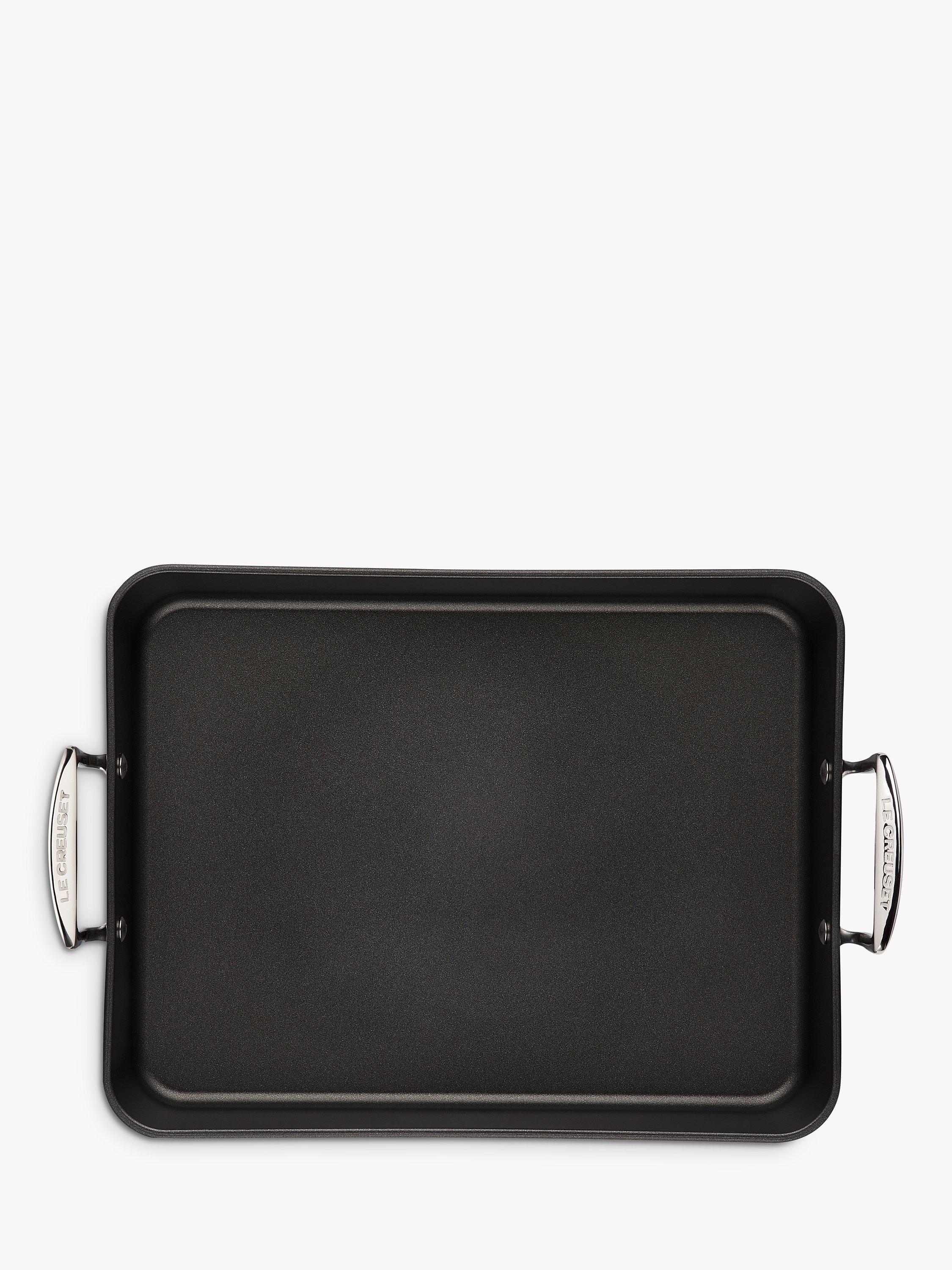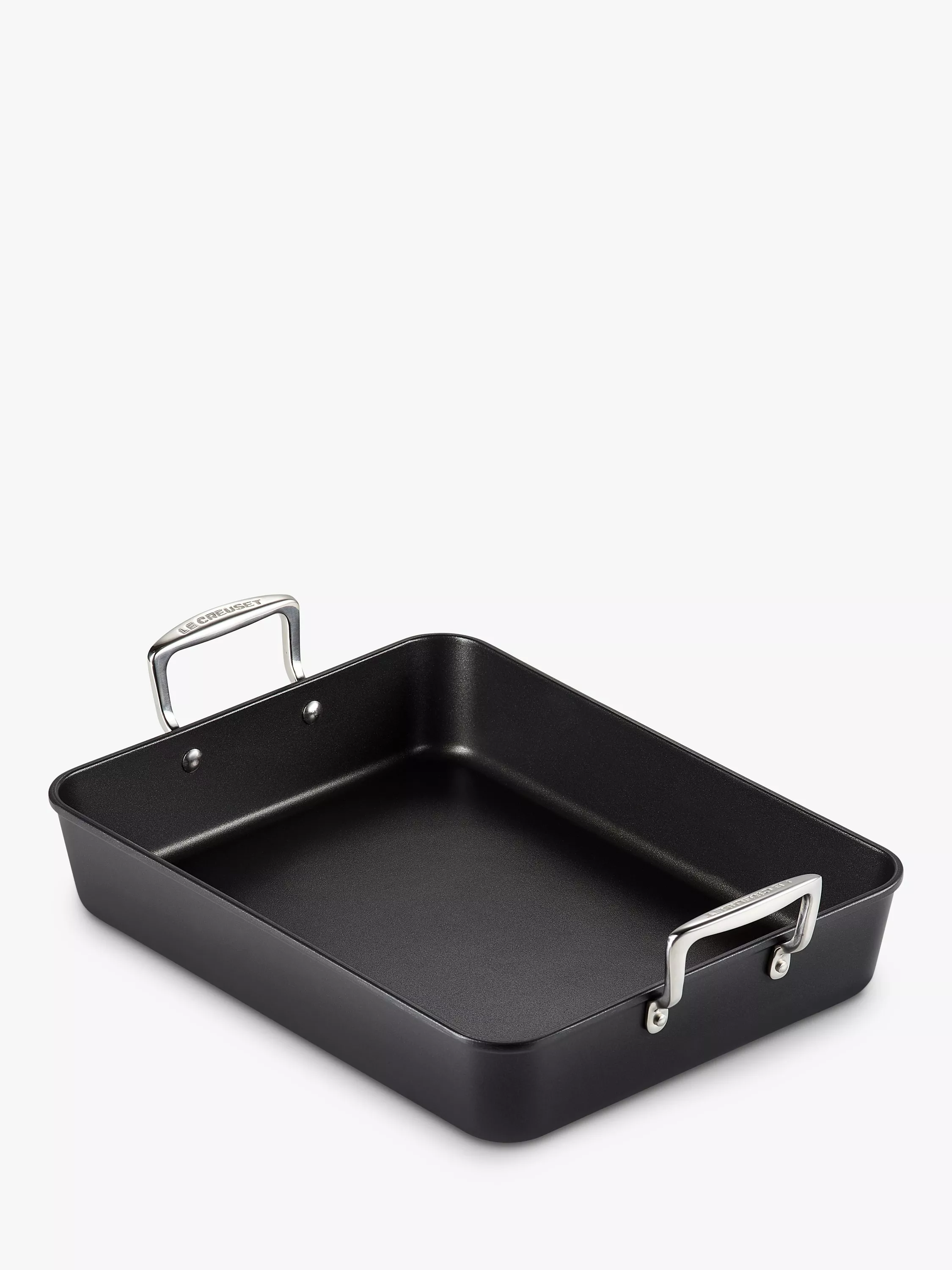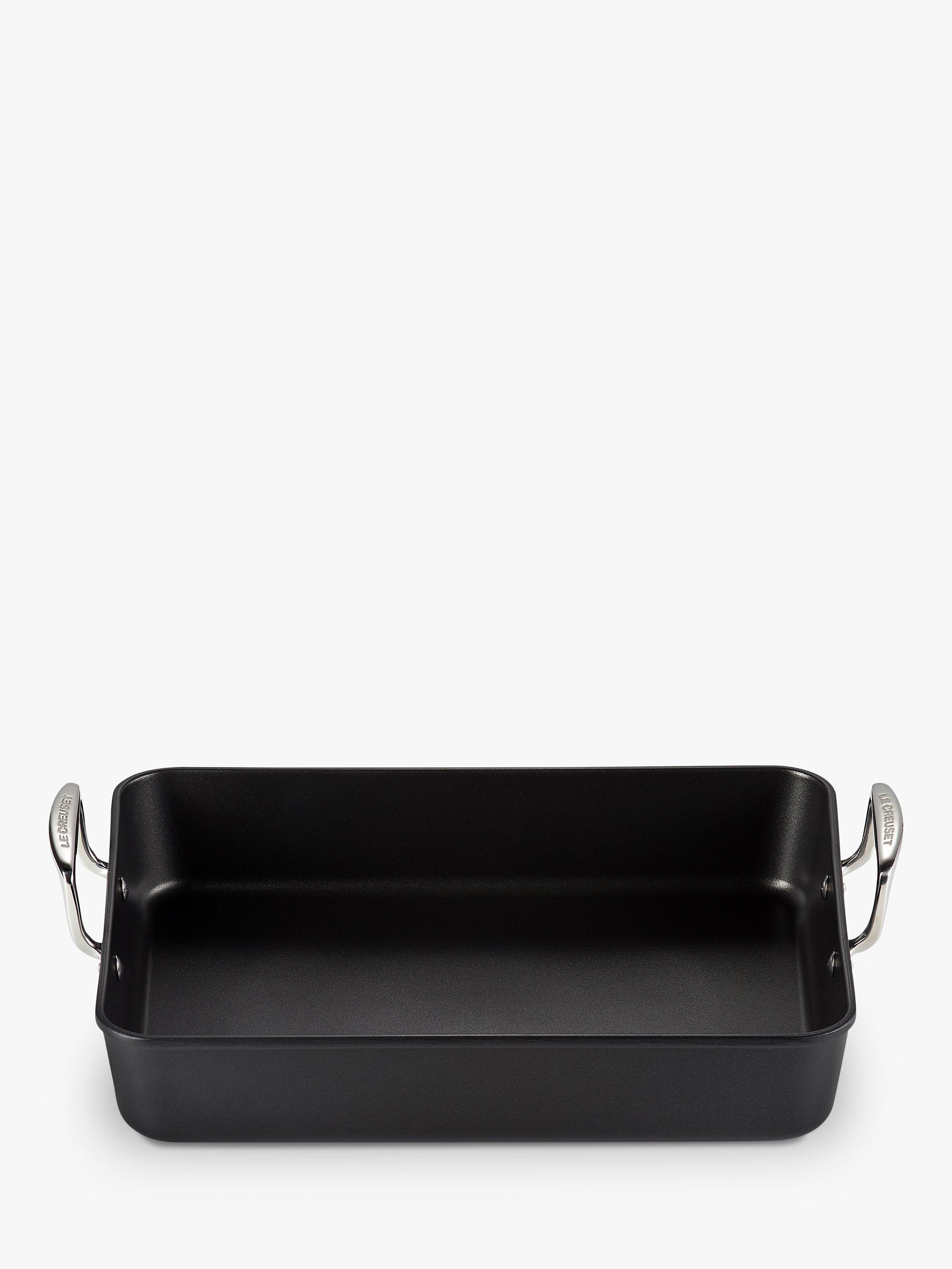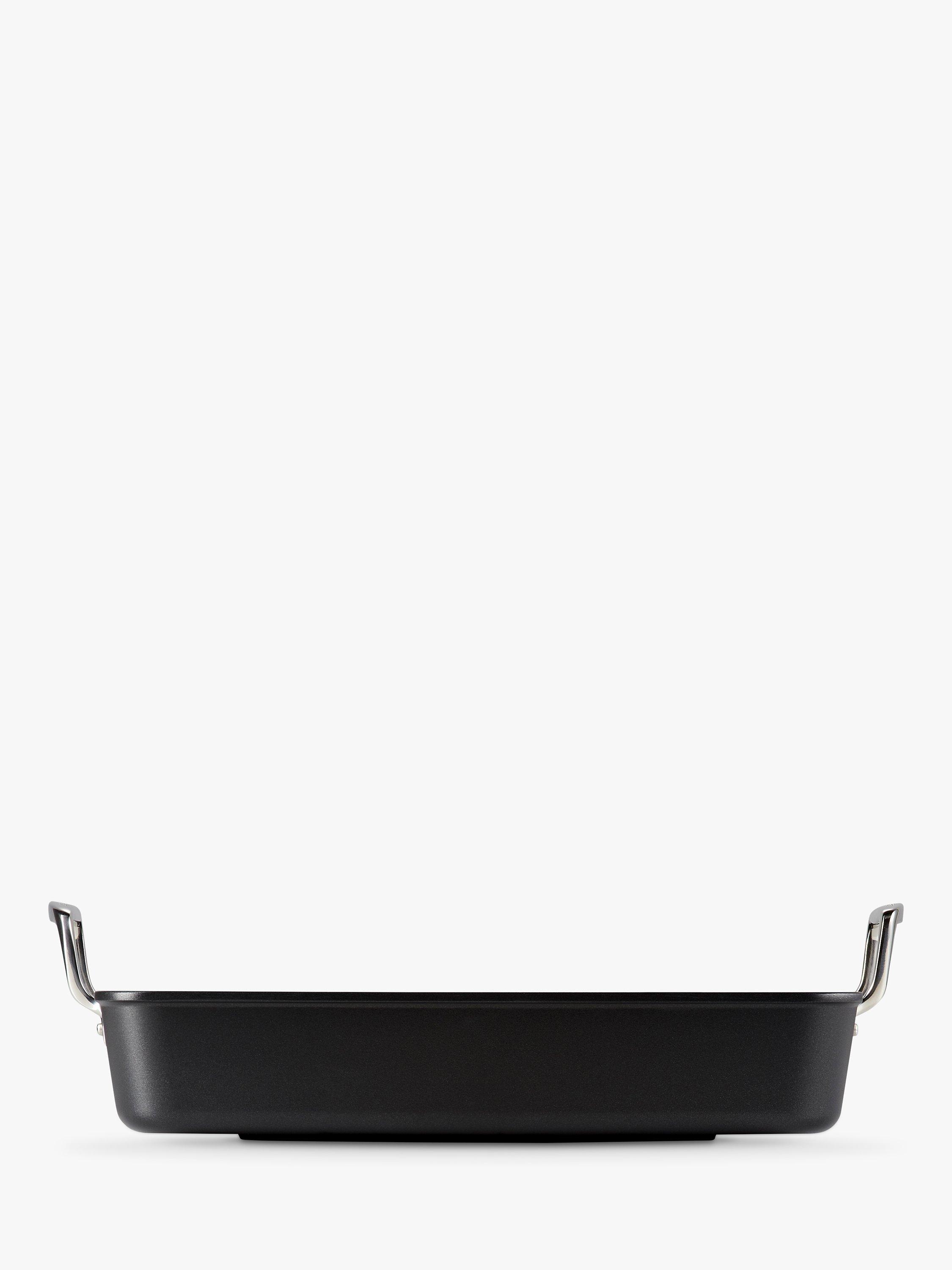 A rectangular roaster from Le Creuset's Toughened Non-Stick cookware range. The Toughened Non-Stick range boasts innovative technology from its three-layer reinforced non-stick surface to the induction-compatible base. Cookware is made from high-quality, hard-anodised forged aluminium for excellent heat retention and even heat distribution.