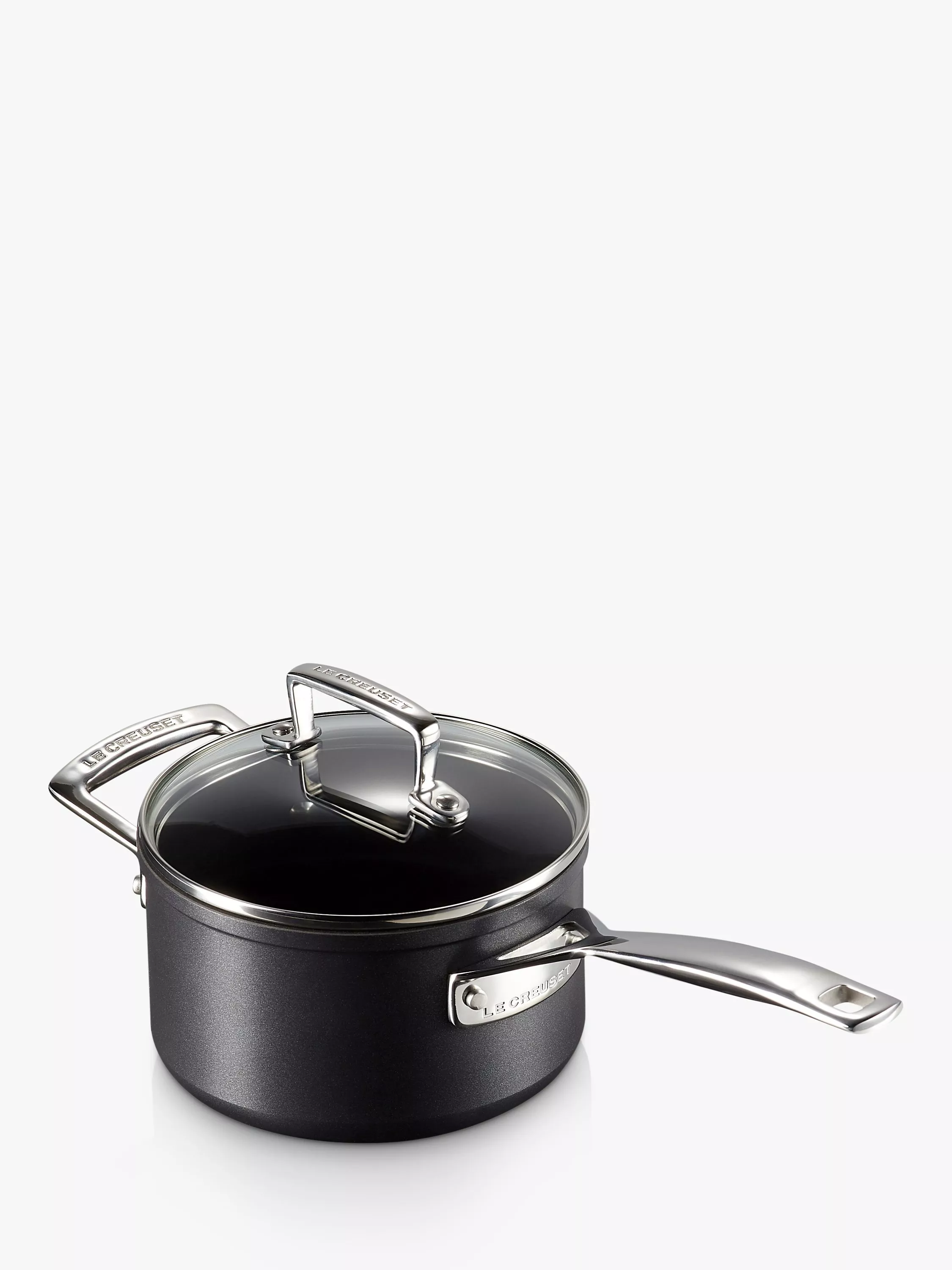 A saucepan with a helper handle and lid, from Le Creuset's Toughened Non-Stick cookware range. The Toughened Non-Stick range boasts innovative technology from its three-layer reinforced non-stick surface to the induction-compatible base. The cookware is made from high-quality, hard-anodised forged aluminium for excellent heat retention and even heat distribution.