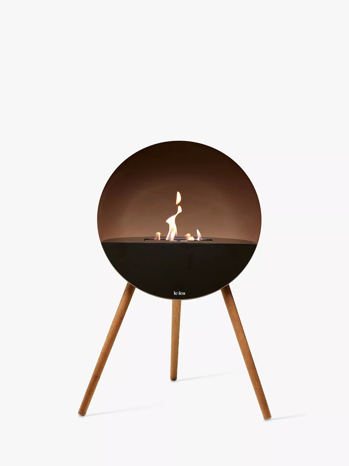 Le Feu Eye fireplace, a statement freestanding design for the home and to enjoy from every angle as the fire gives a room a cosy, warm and dynamic atmosphere. An effective heat output with a metal dome and wooden legs in a complementary tone.