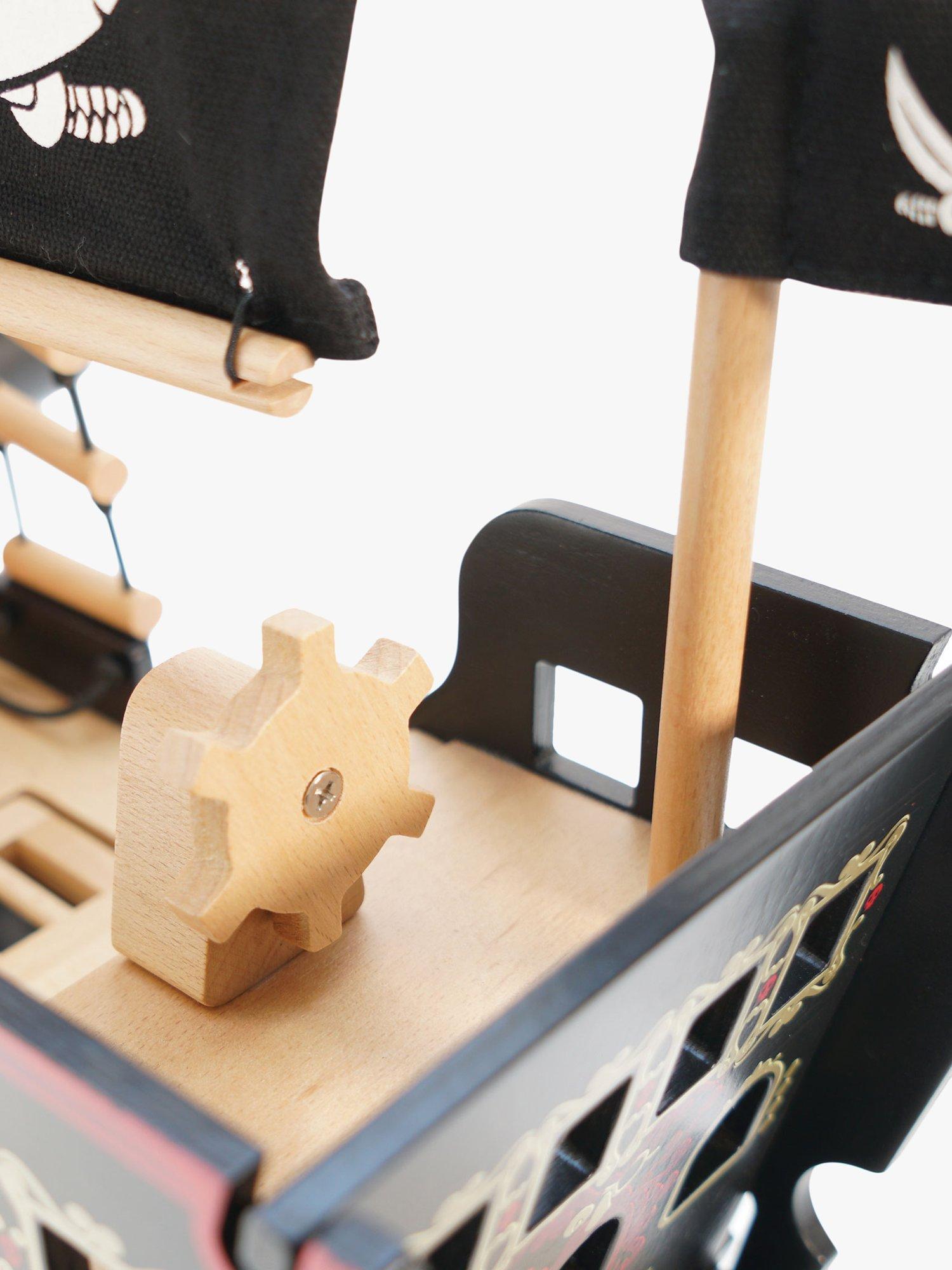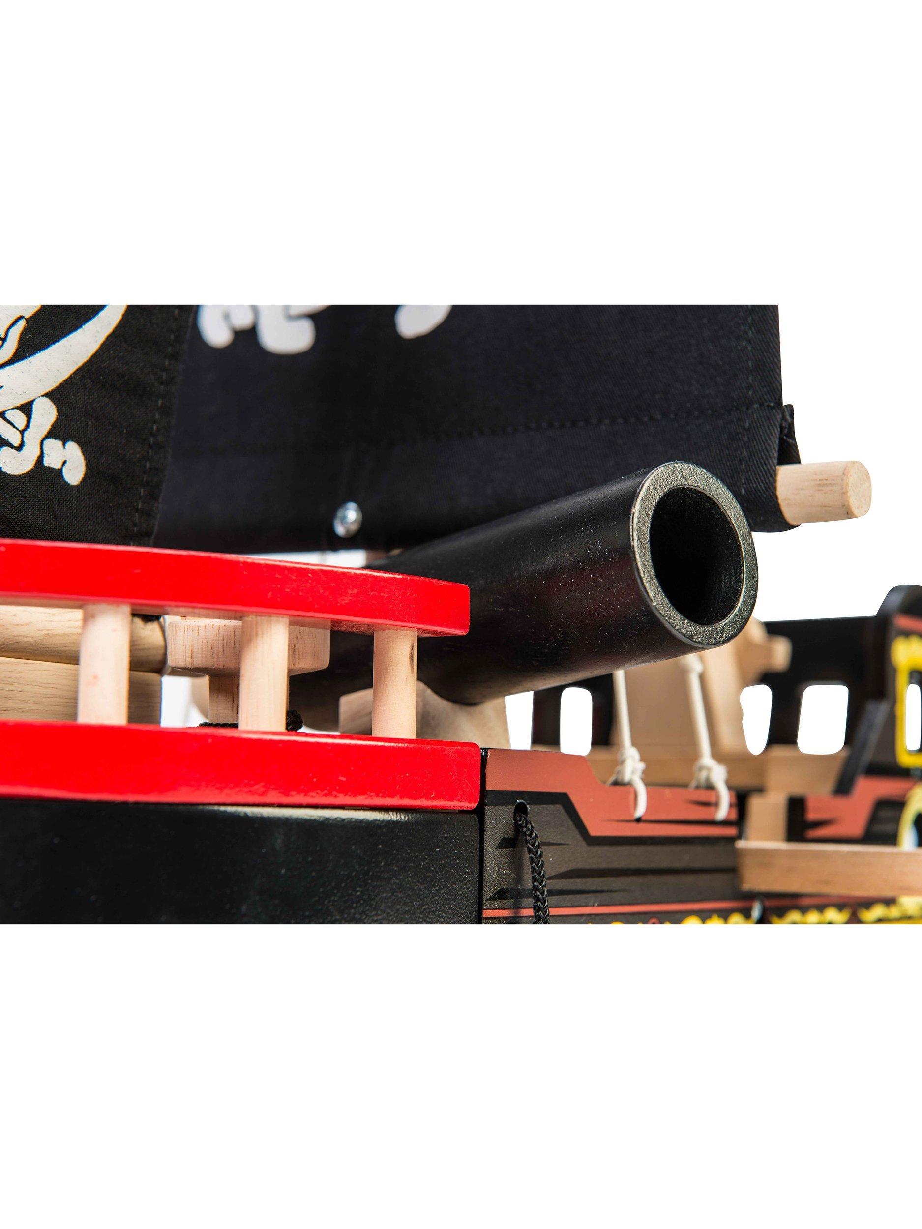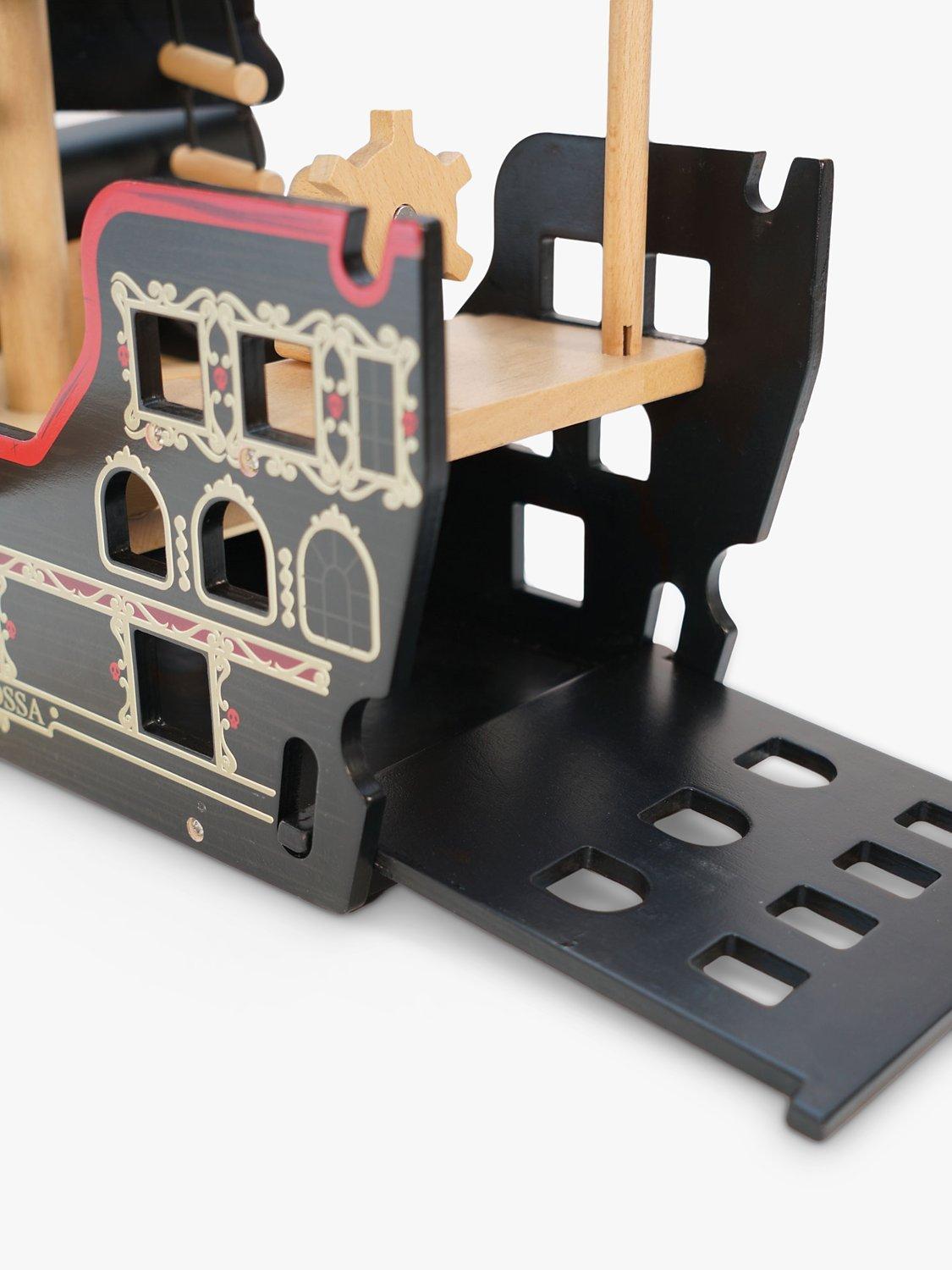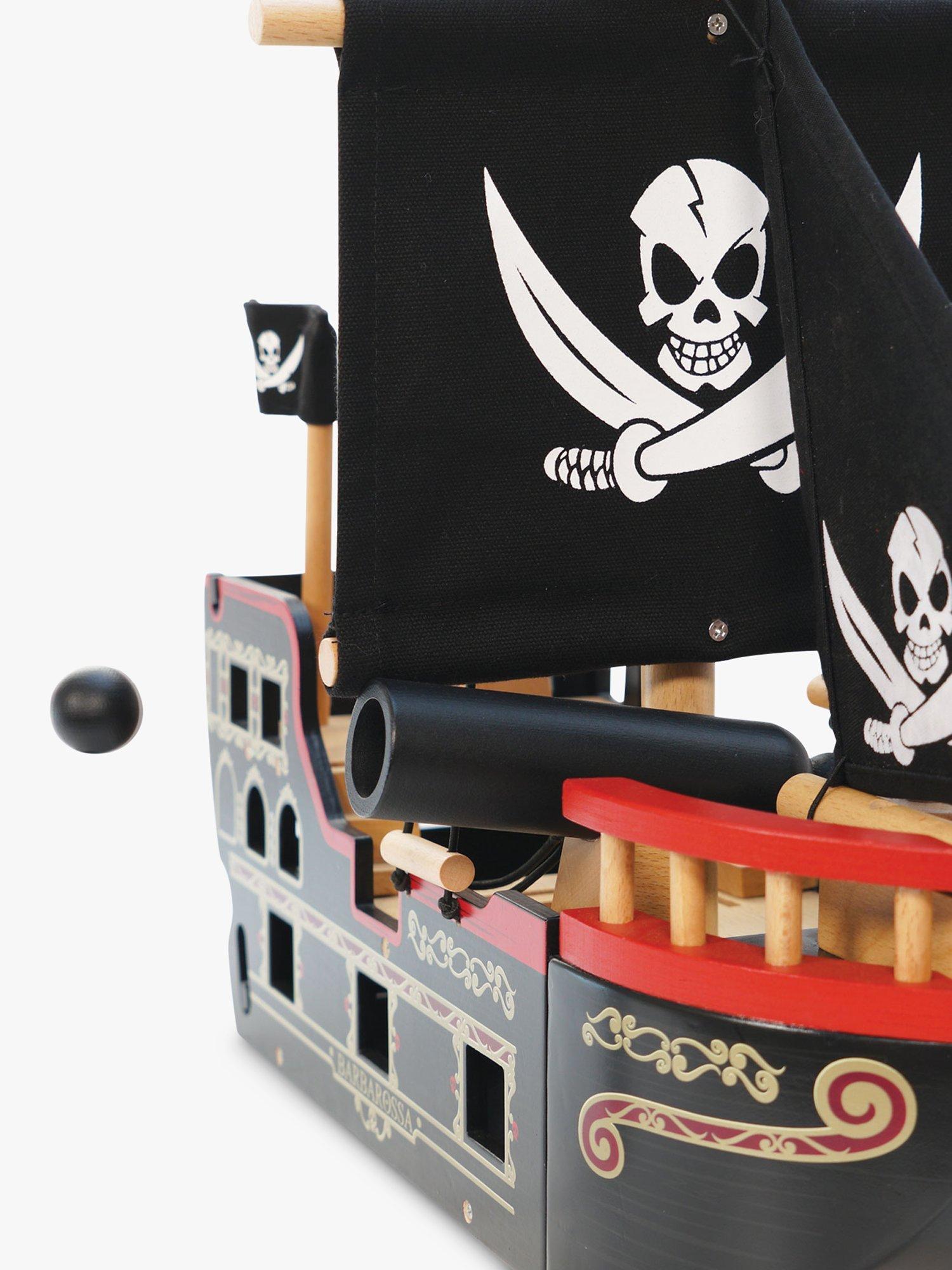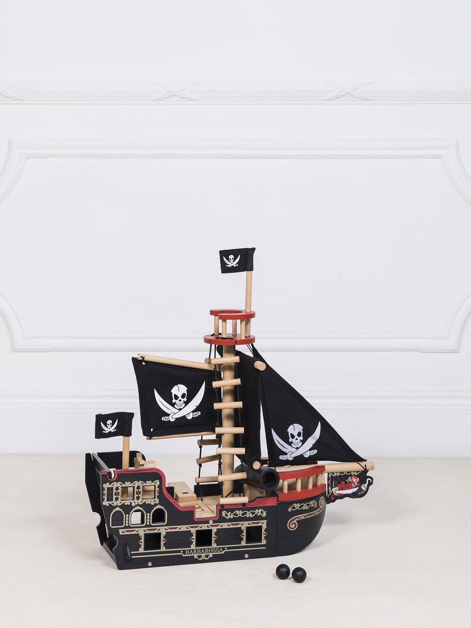 Sail the seven seas with the Barbarossa Pirate Ship from Le Toy Van. The classic black-painted wooden pirate ship with a skull and crossed swords motif on the fabric sails. Features include; a crow's nest, a 'walk-the-plank', rigging, a spring-loaded firing cannon with cannonballs, a wind-up anchor, a deck trap-door, a helm, a Barbarossa figurehead and a rear opening stern for access. Perfectly scaled for Budkins characters and any other figurines around 10cm tall. Figures are sold separately. Won the Right Start Toy Award.