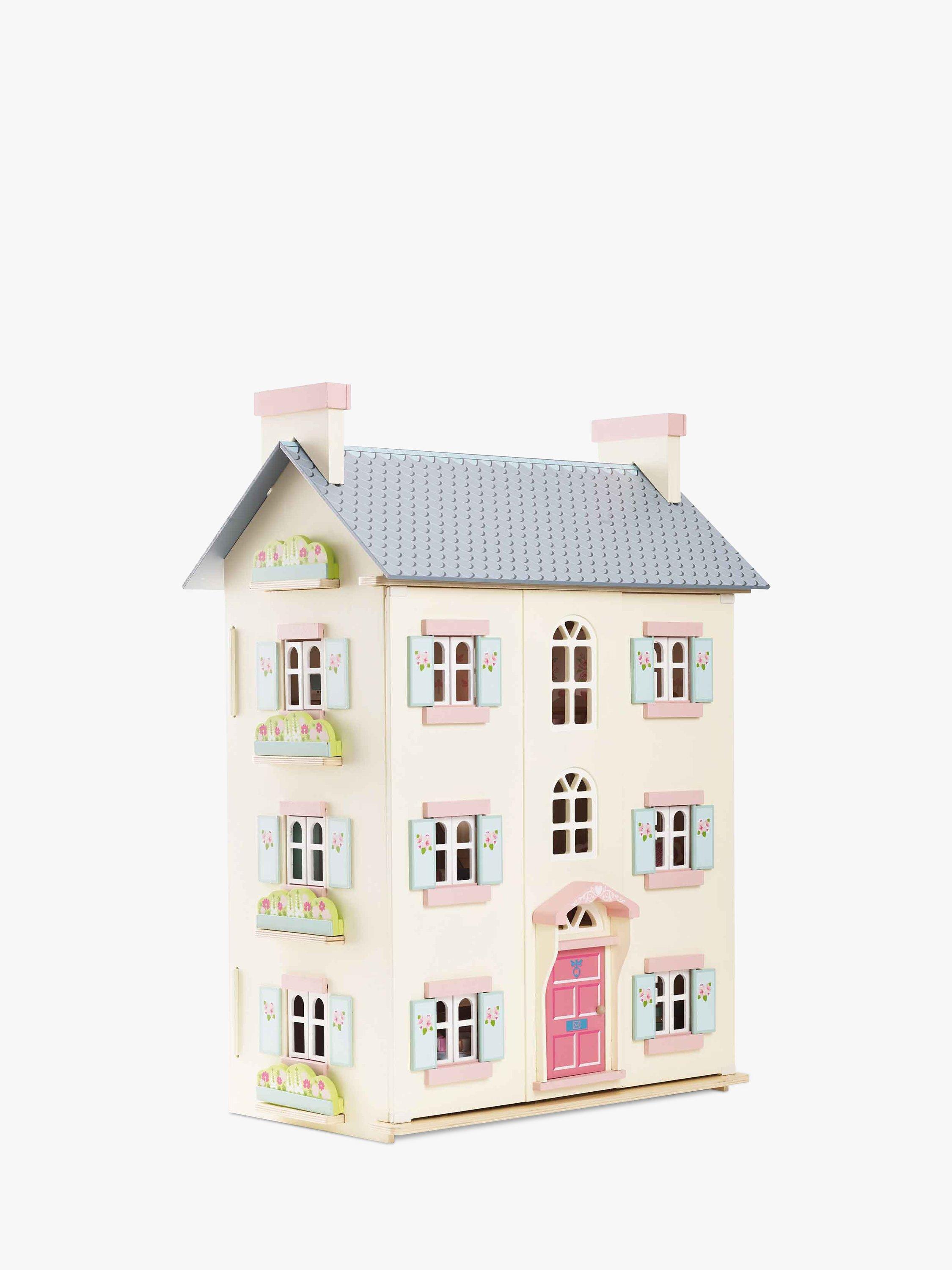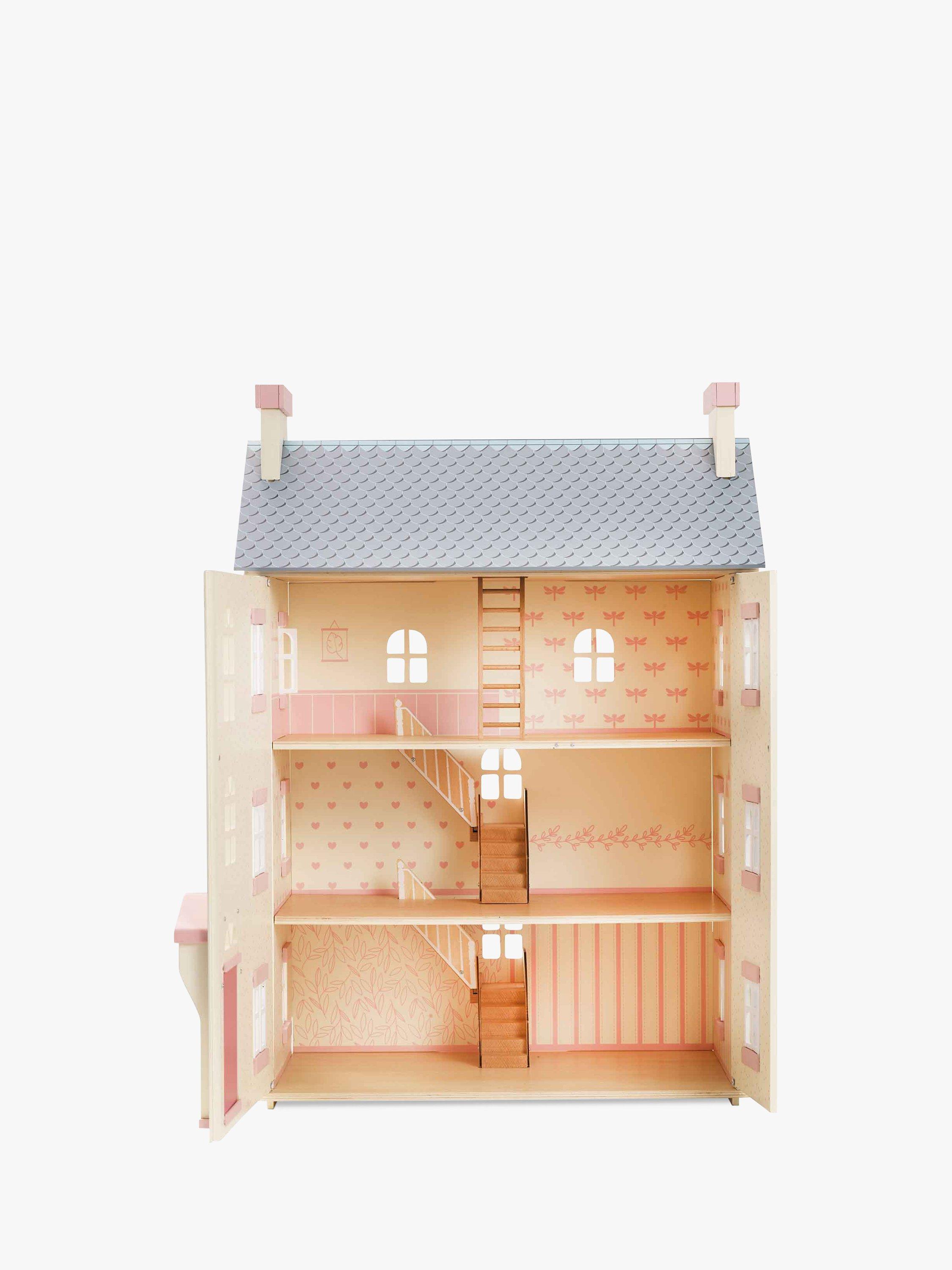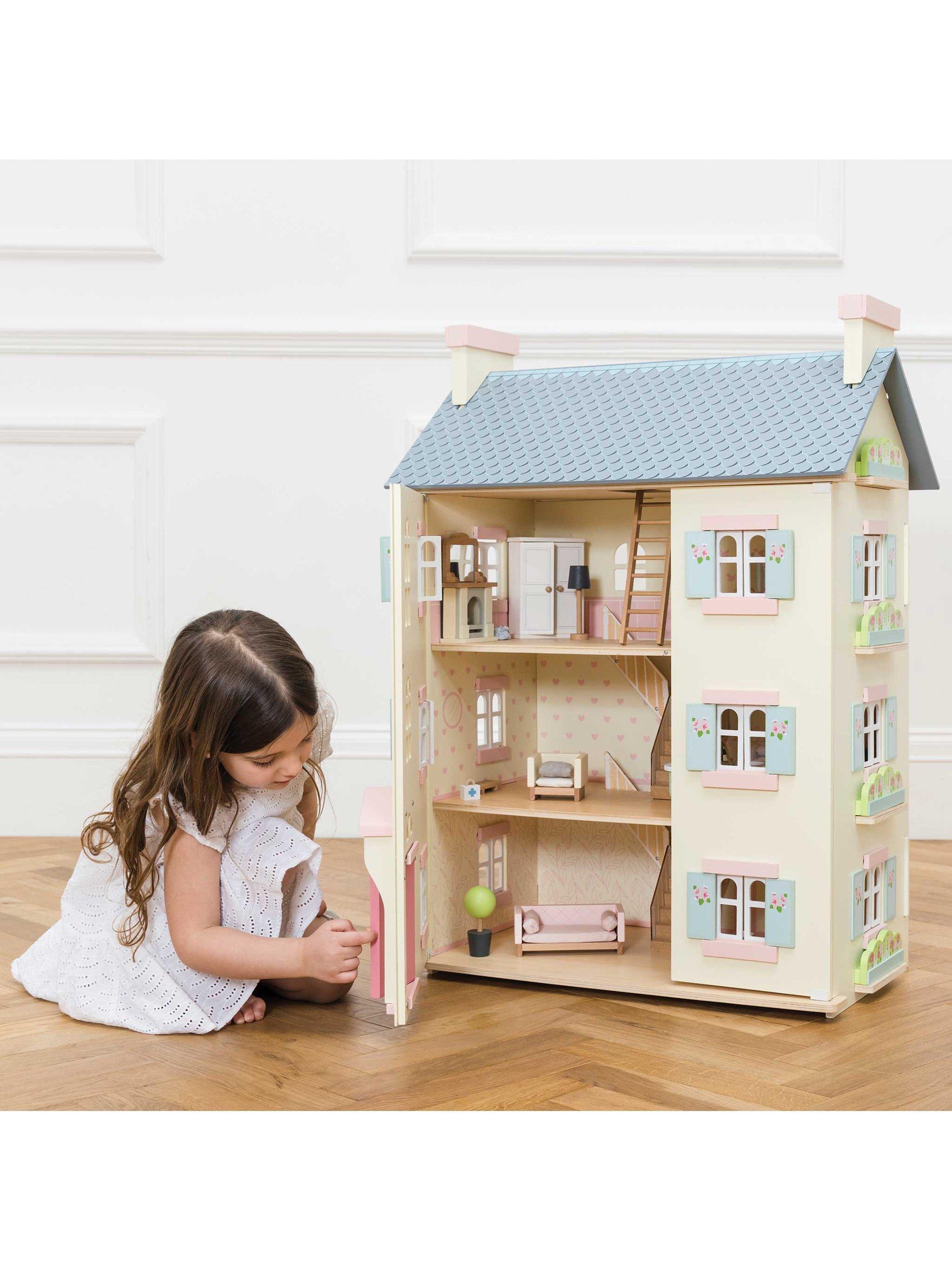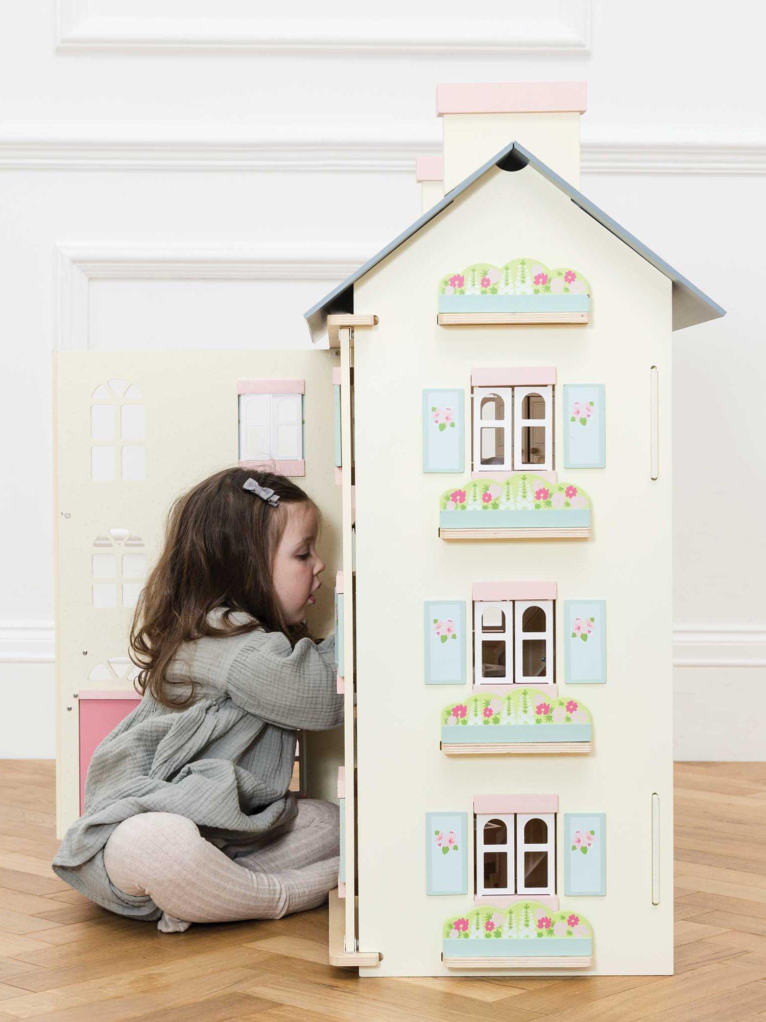 Role play fun adventures await with this toy doll house, fitting for any miniature lord or lady. Full of exquisite details, this home is fully painted in soft creams with pink and blue accents and sweet flower motif detailing.