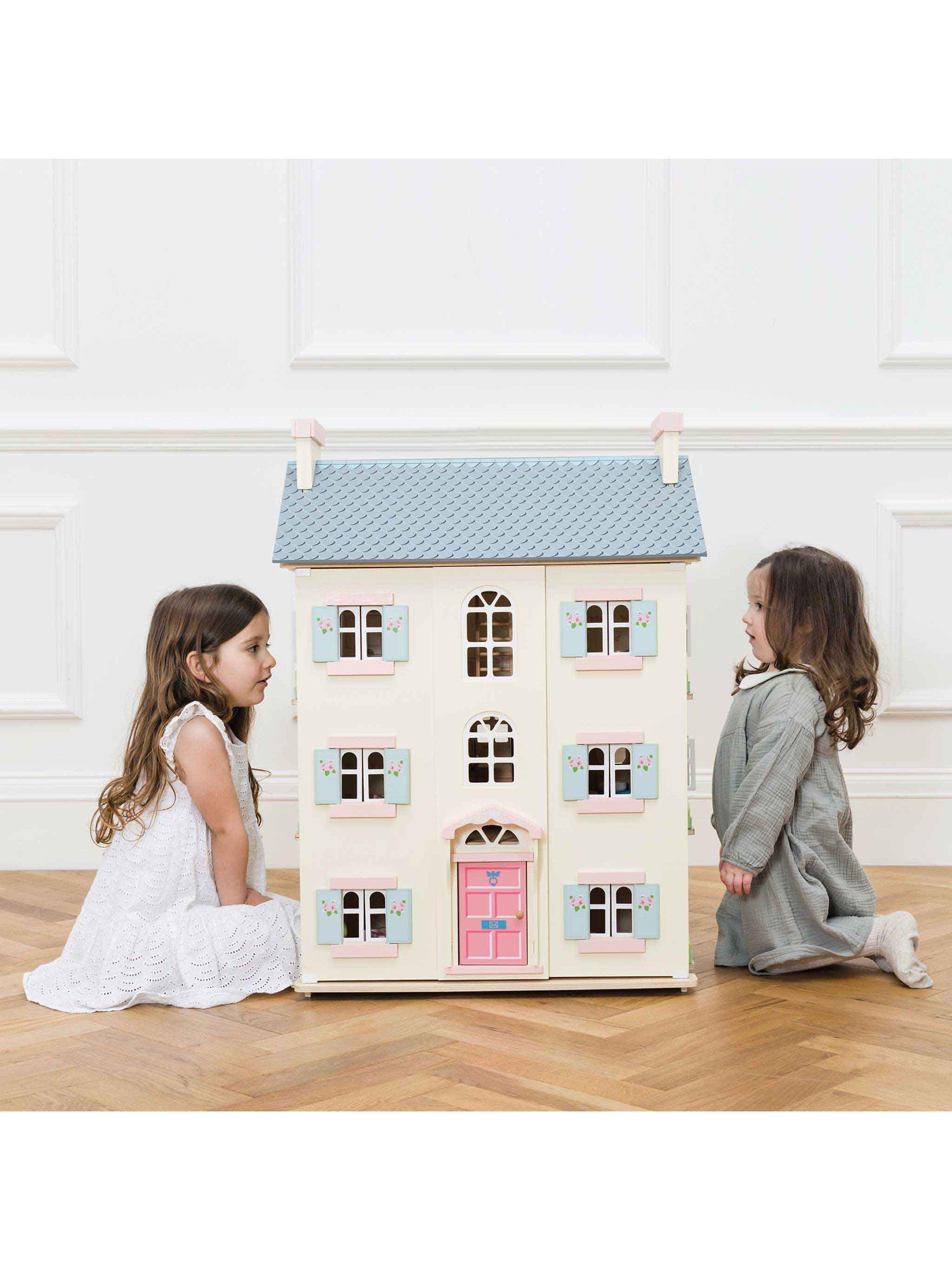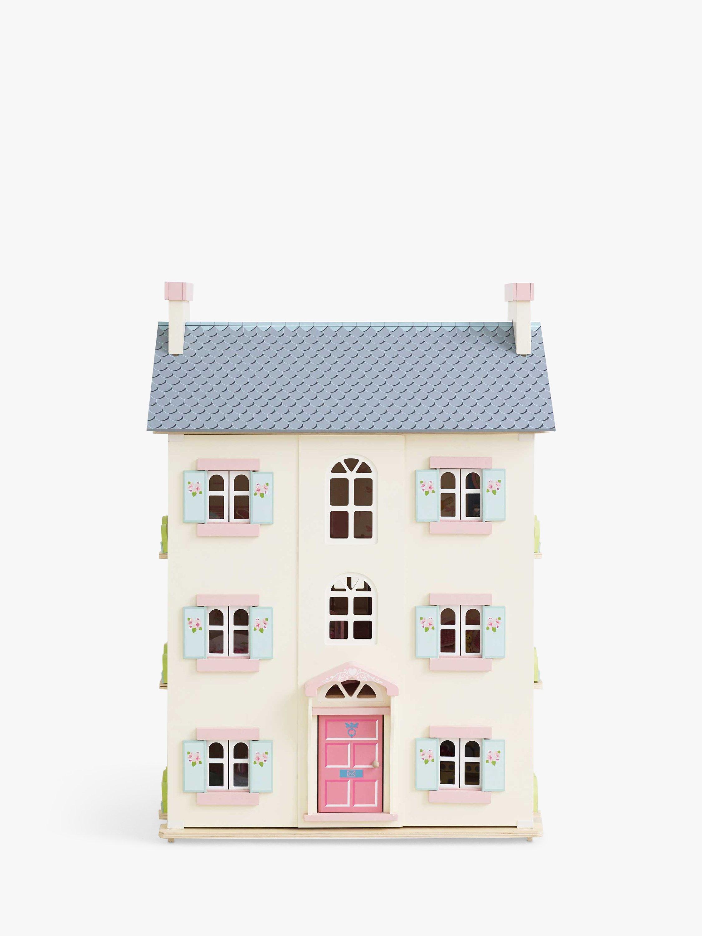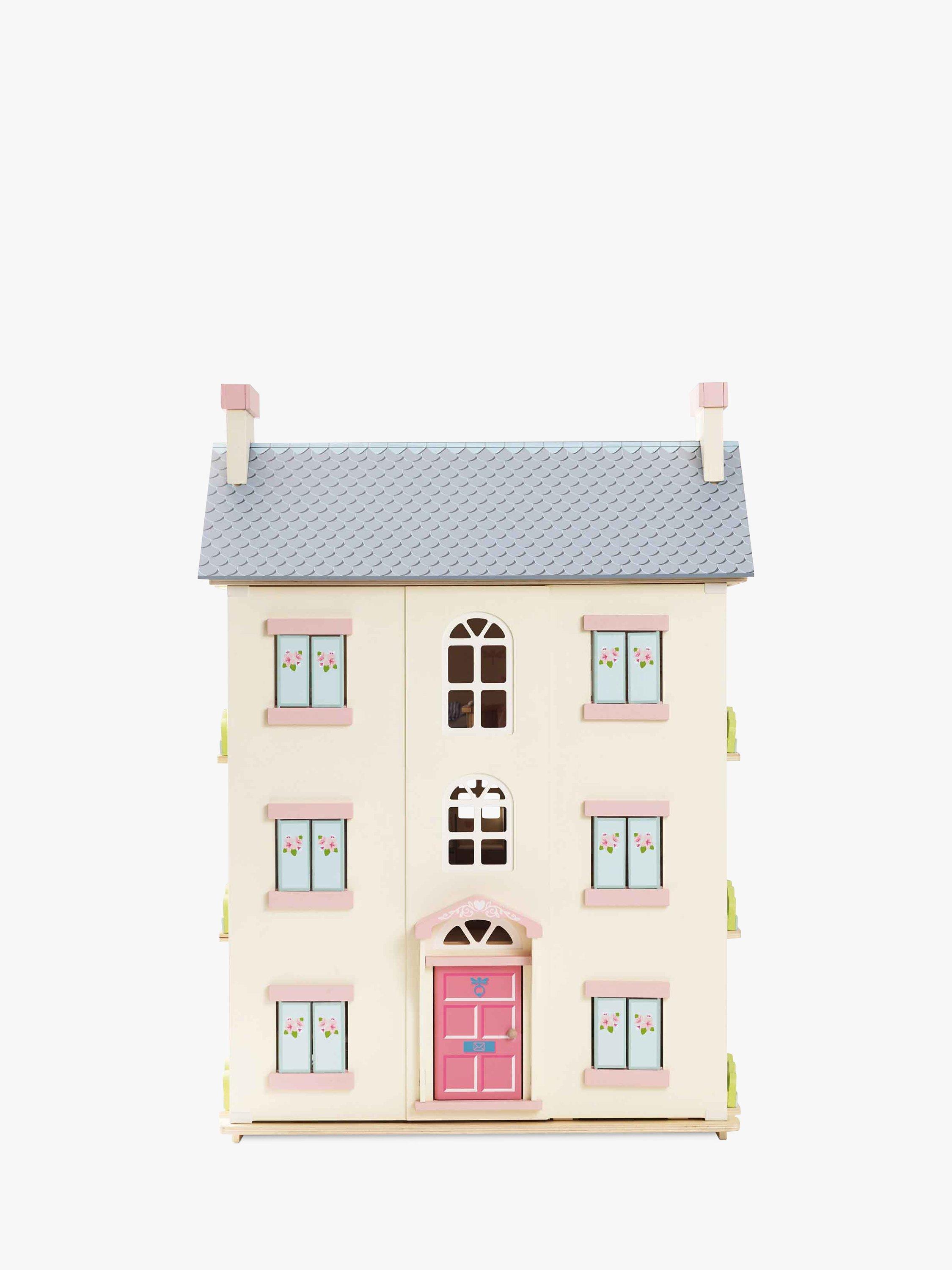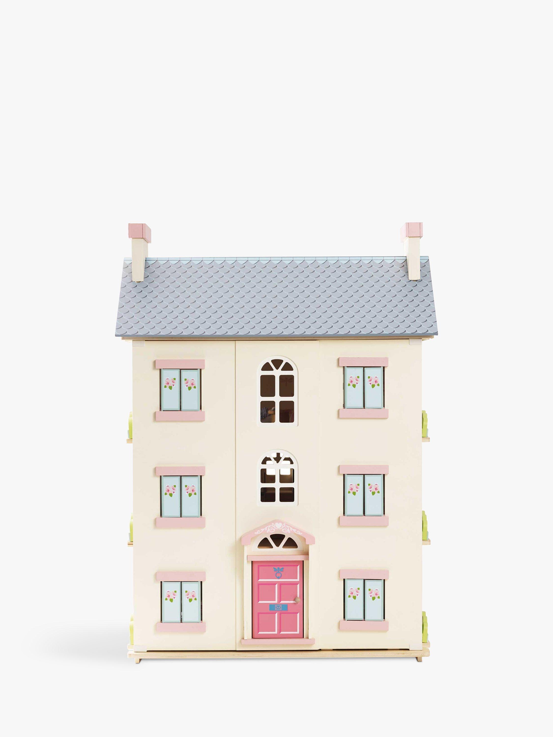 Role play fun adventures await with this toy doll house, fitting for any miniature lord or lady. Full of exquisite details, this home is fully painted in soft creams with pink and blue accents and sweet flower motif detailing.