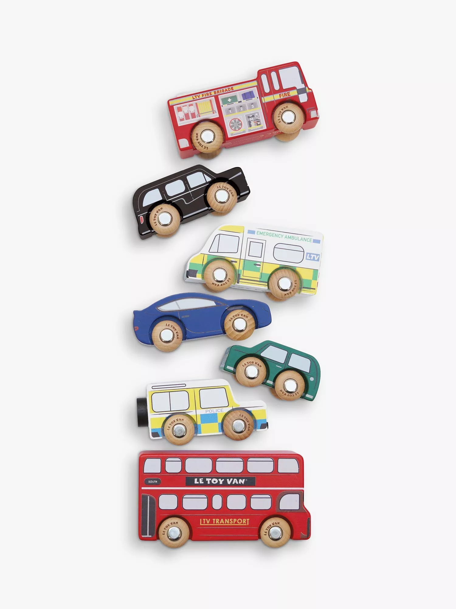 Made from FSC-certified wood, this sustainable London Toy Car set comprises of iconic London vehicles with innovative wooden wheels; a double-decker bus, black taxi, fire engine, police van, ambulance and 2 sporty cars (compatible with all standard woodentrain tracks). Inspire creativity with this delightful, plastic-free toy, perfect for all their small-world play adventures.