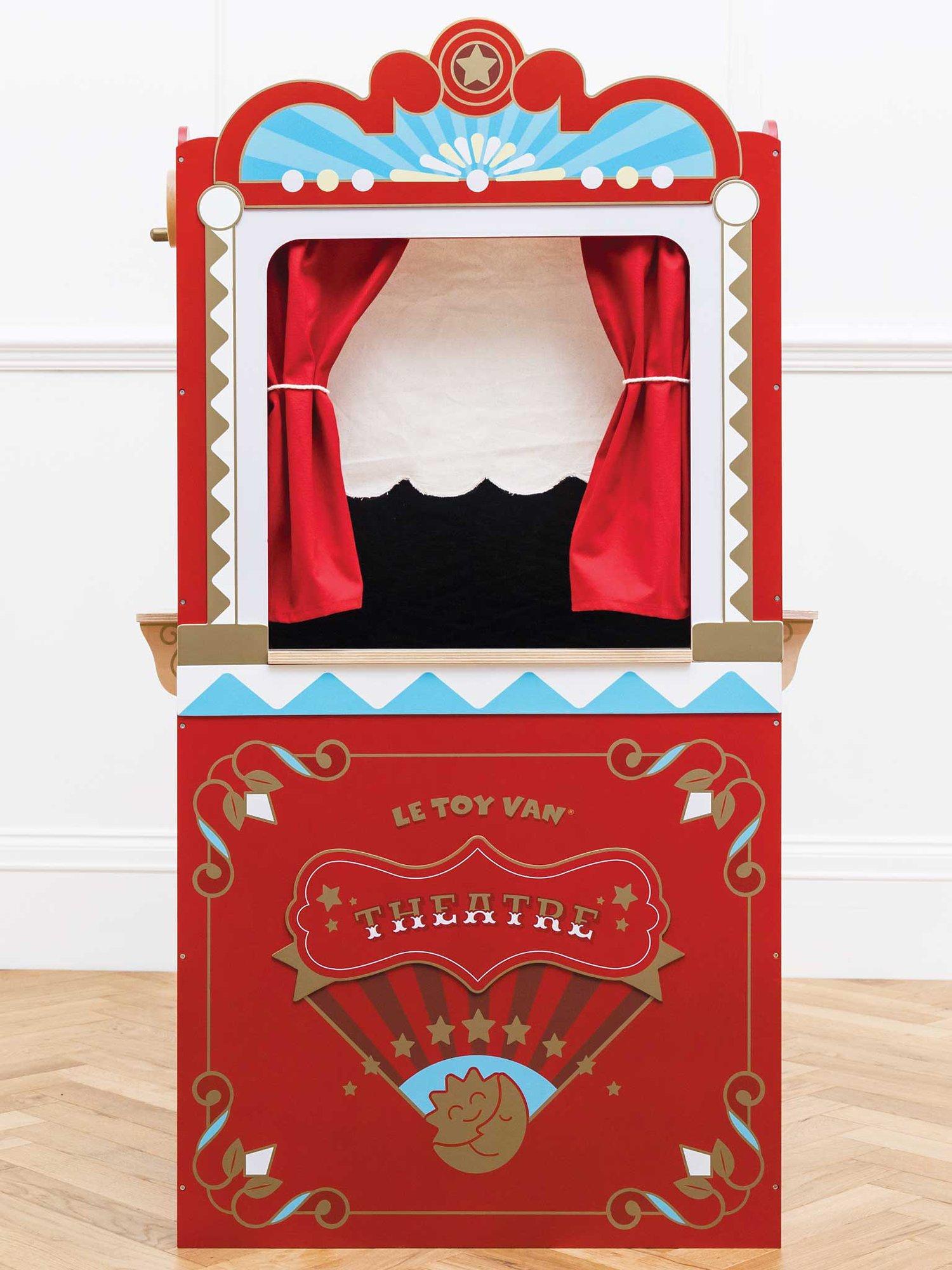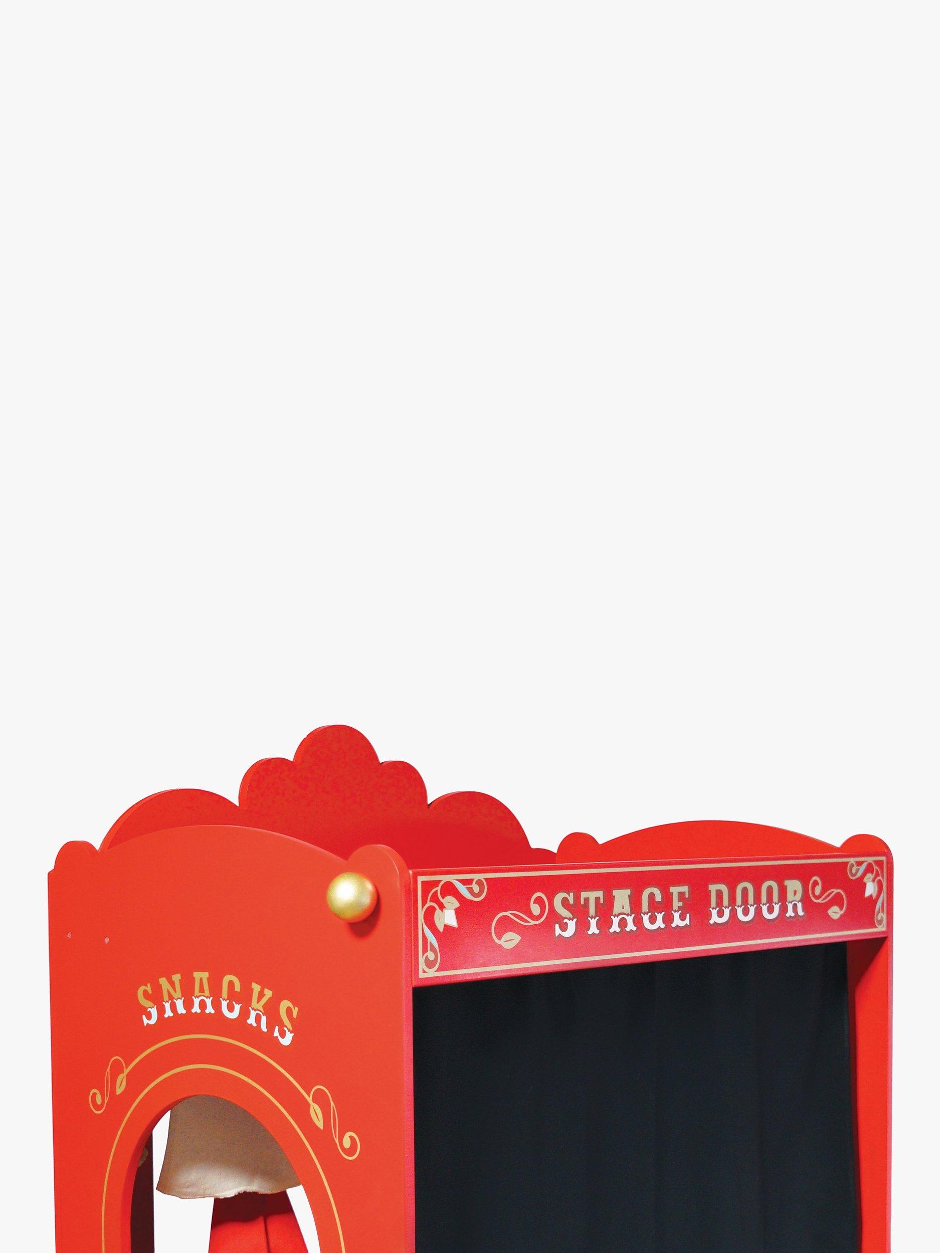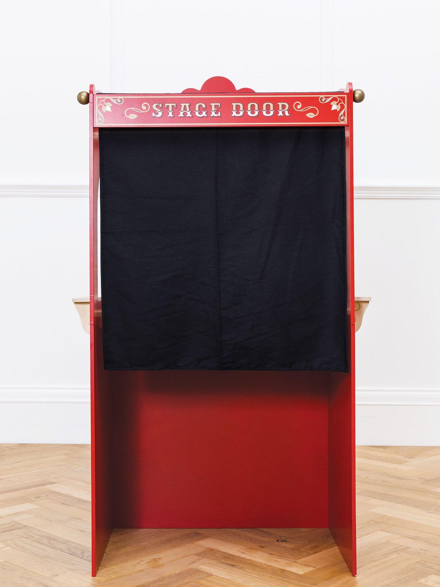 This wooden puppet theatre features a live and interval reversible sign, a stage door and two chalkboards. The theatre is finished with theatre curtains including red stage drapes, a black backdrop curtain and a winding act curtain.