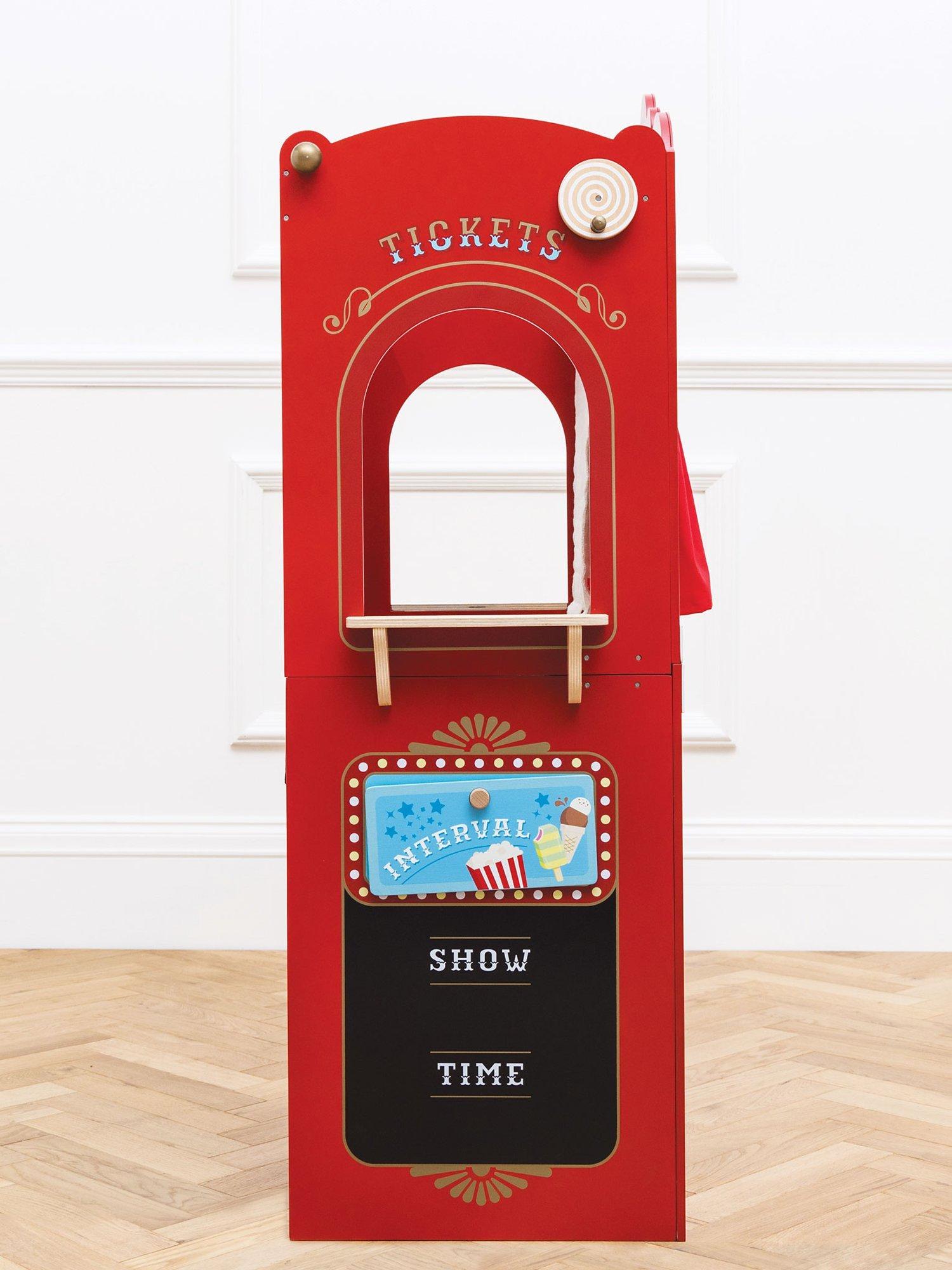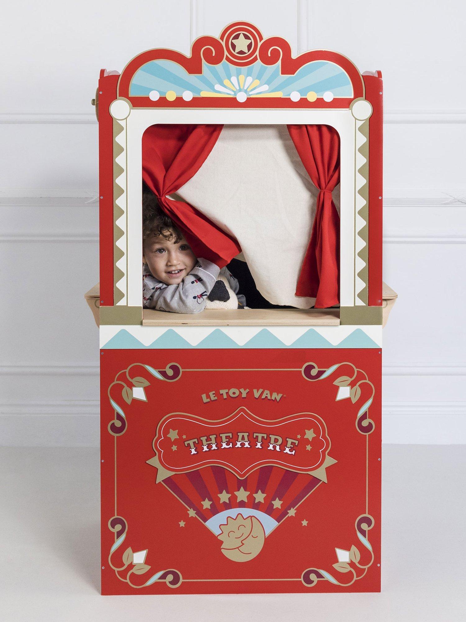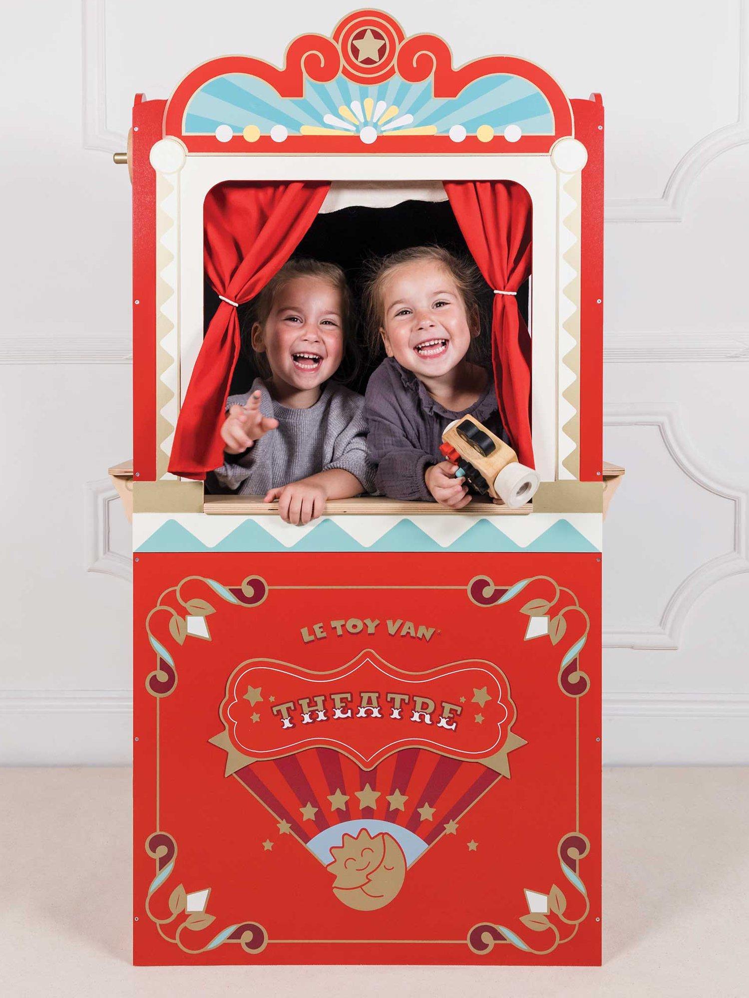 This wooden puppet theatre features a live and interval reversible sign, a stage door and two chalkboards. The theatre is finished with theatre curtains including red stage drapes, a black backdrop curtain and a winding act curtain.