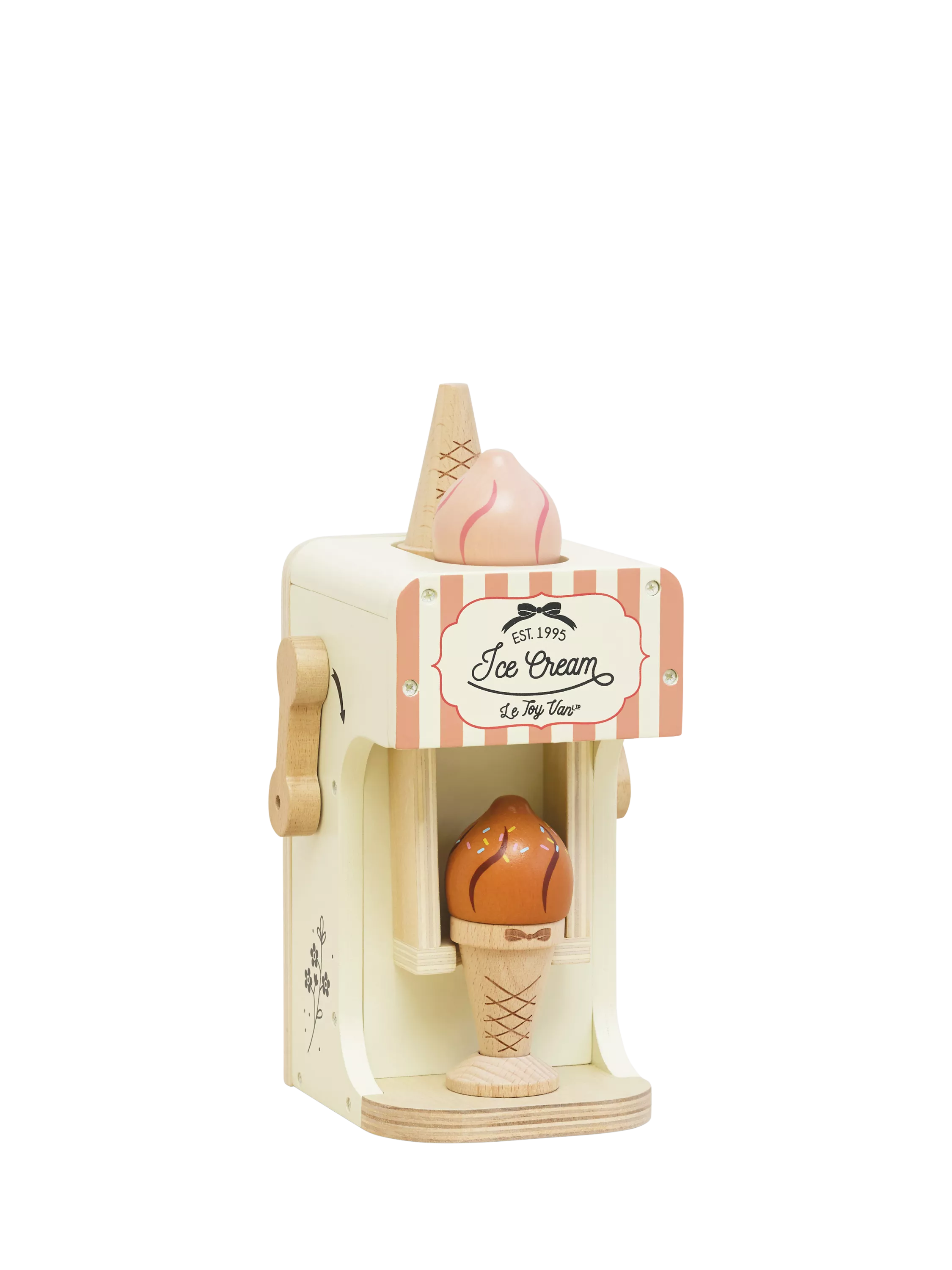 With their very own machine, tempting iced treats are on tap! Decorated in pretty pastel shades and a sprinkling of gold paint, all finished off with sweet illustrations for a nostalgic feel. Little learners will love placing the cone on the holder and selecting a flavour using the switch feature. The clever pull-down lever adds an extra element for fun, realistic play. This cute set comes complete with 2 magnetic cones and 2 ice creams.