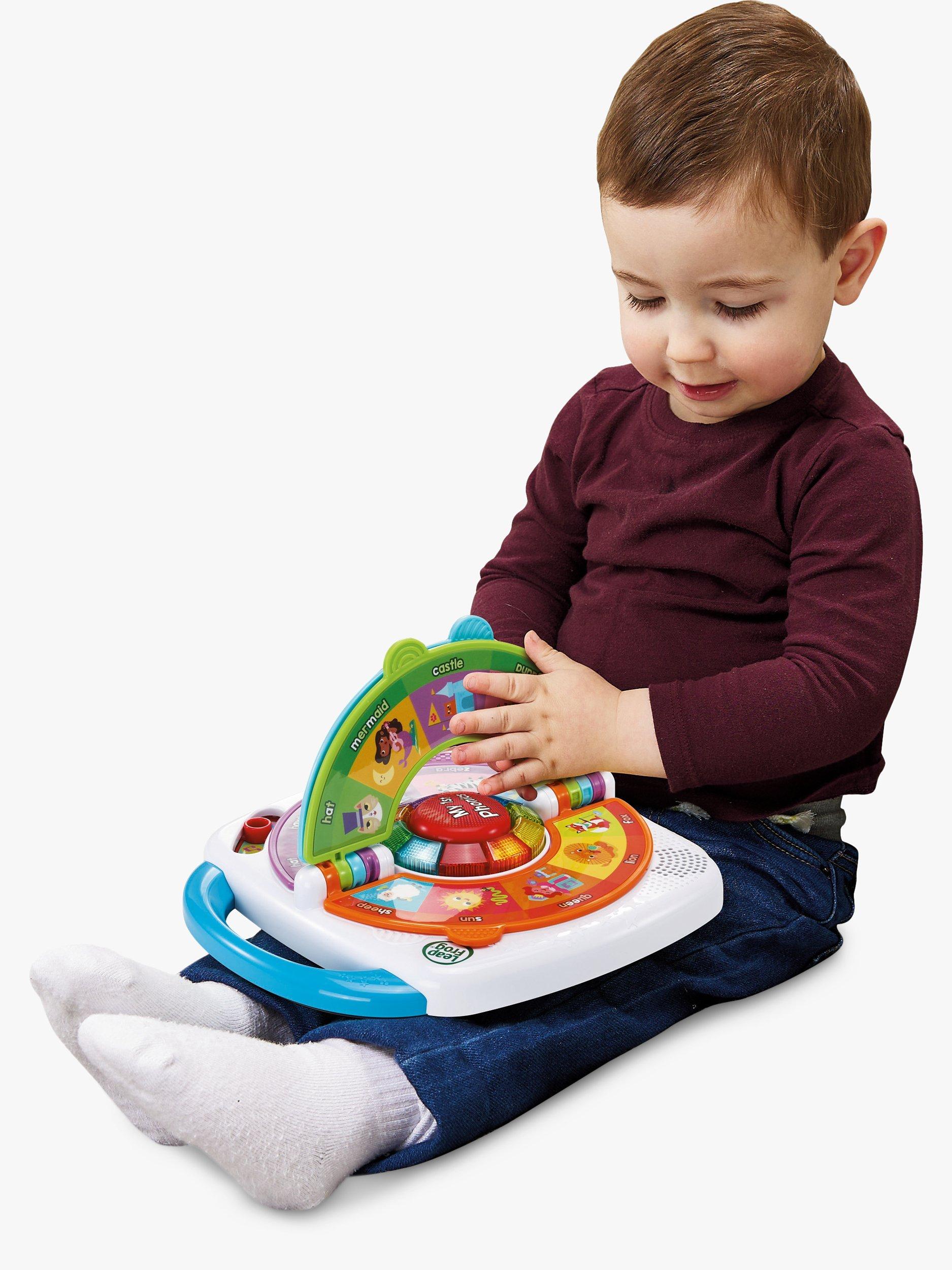 Kids can press the 10 light-up buttons to explore each picture, learning the word, and highlighted letter sound or they can press the big red button in the middle to see the lights swirl around for random learning.