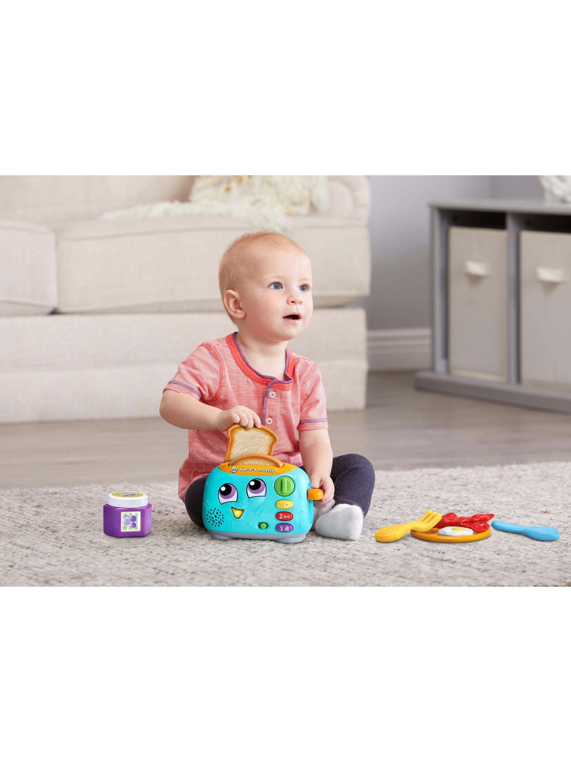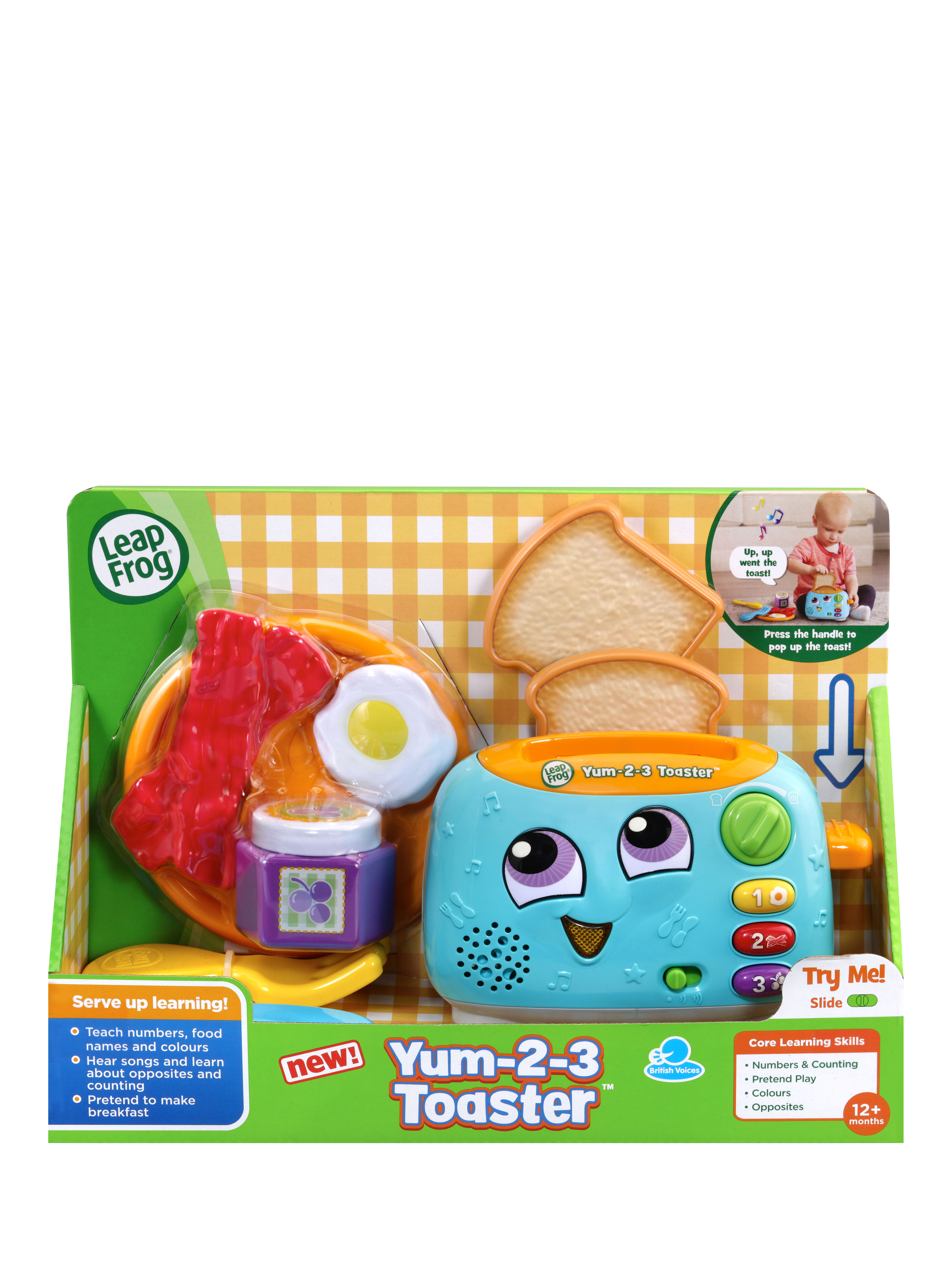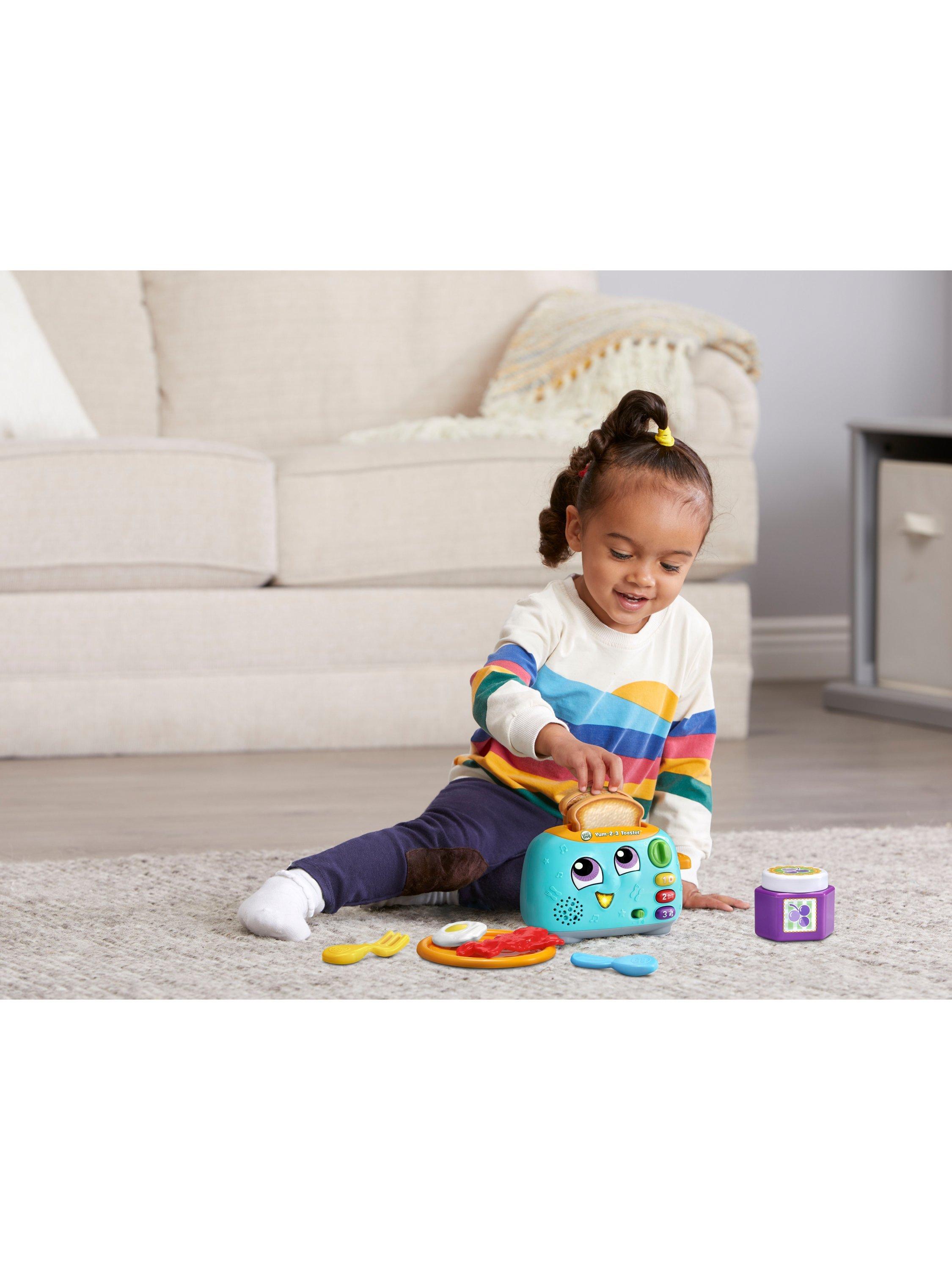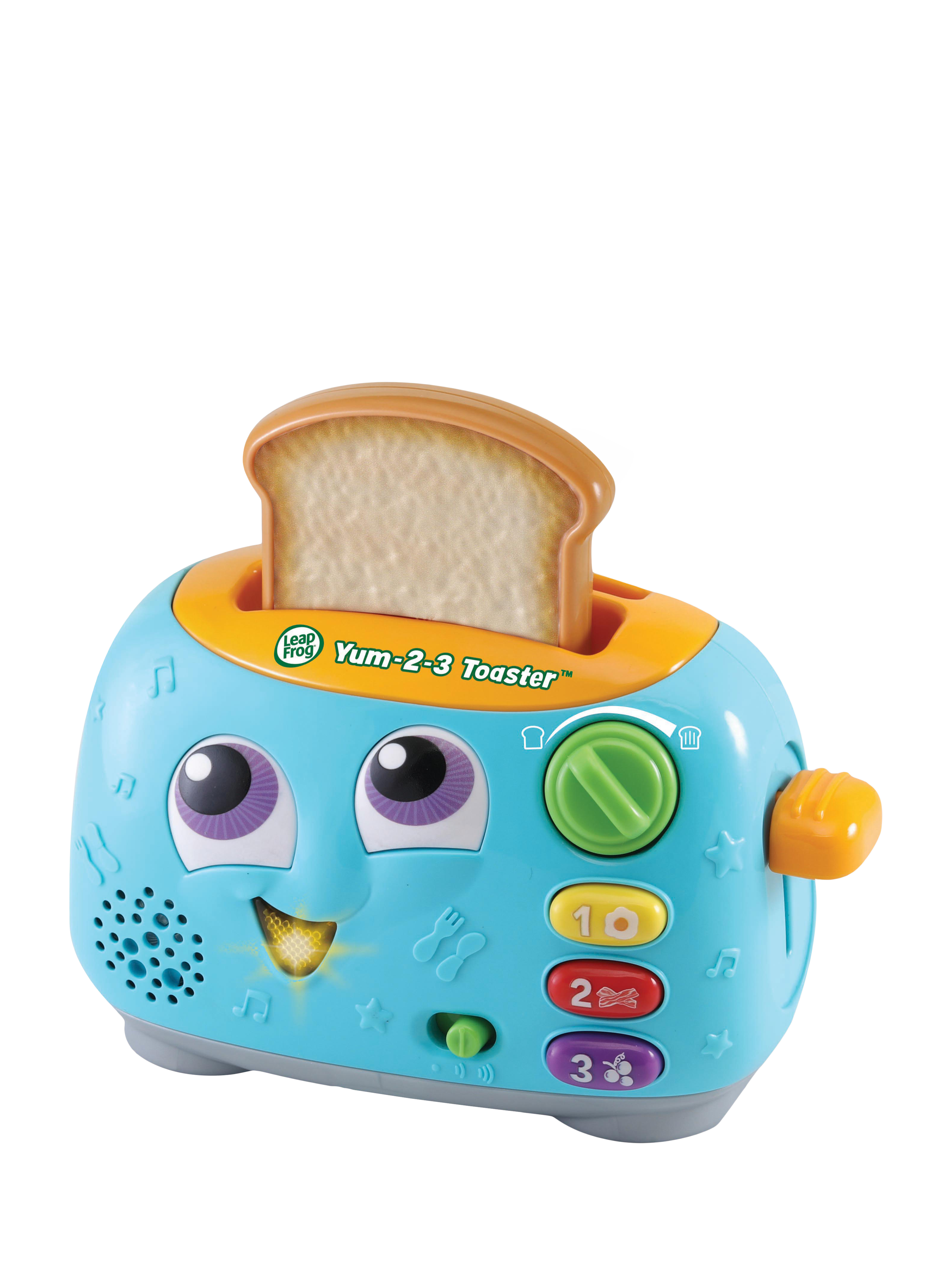 Use the handle to pop up the toast while being introduced to opposites. Turn the dial to choose whether you would like light or dark toast and press the three breakfast food buttons to learn numbers 1 to 3, colours and foods. The toaster mouth lights up for phrases and five sing-along songs.