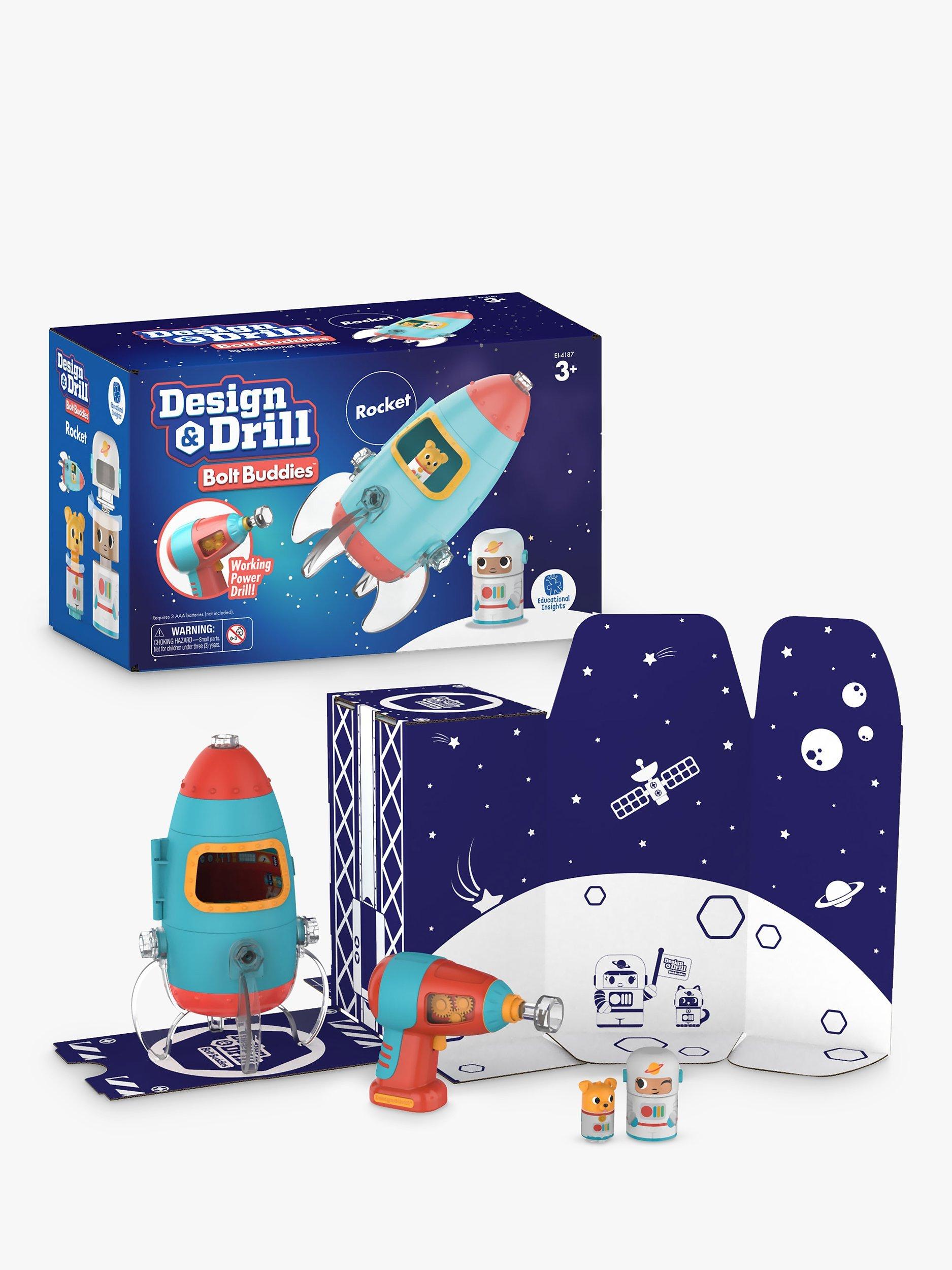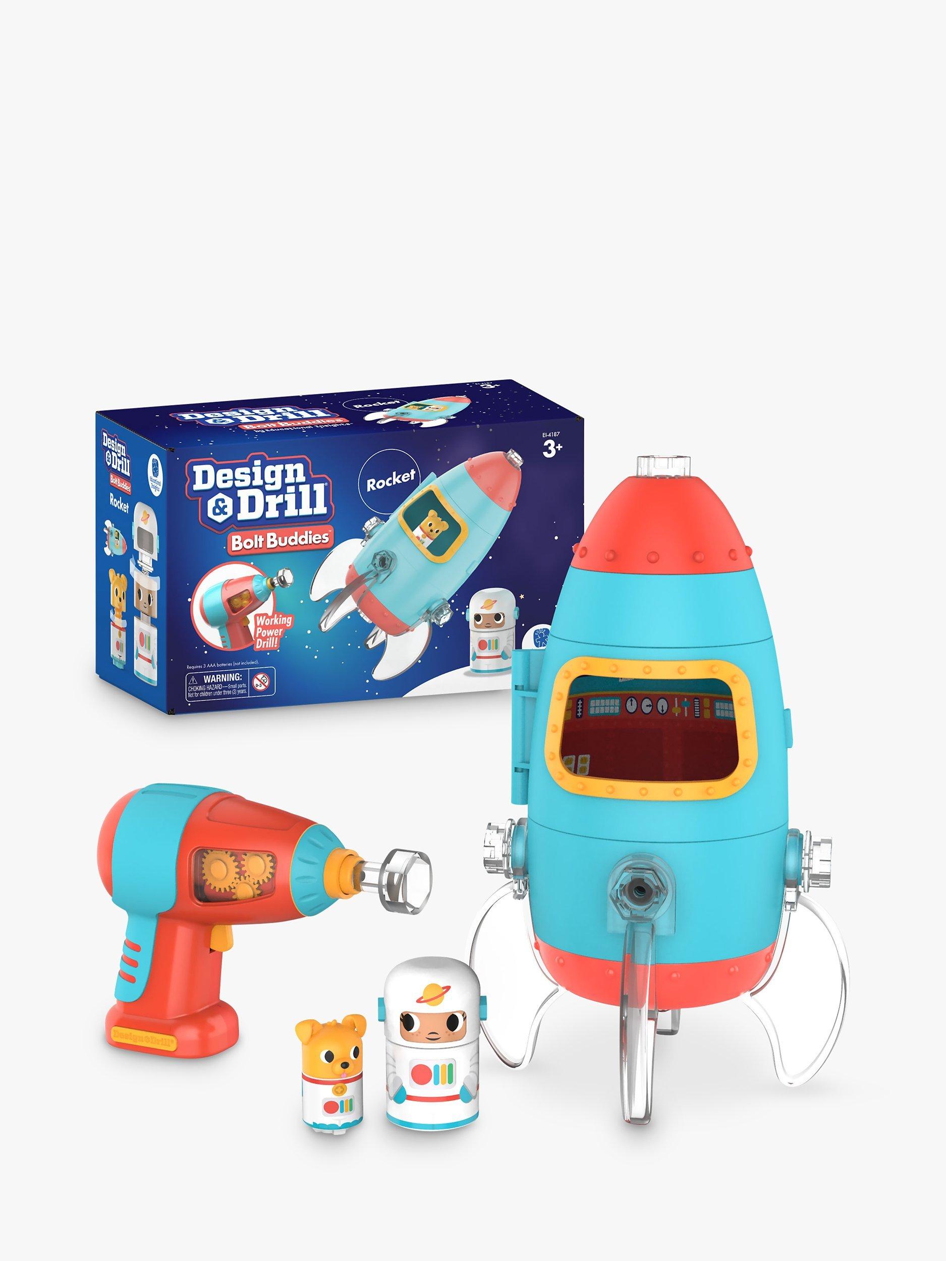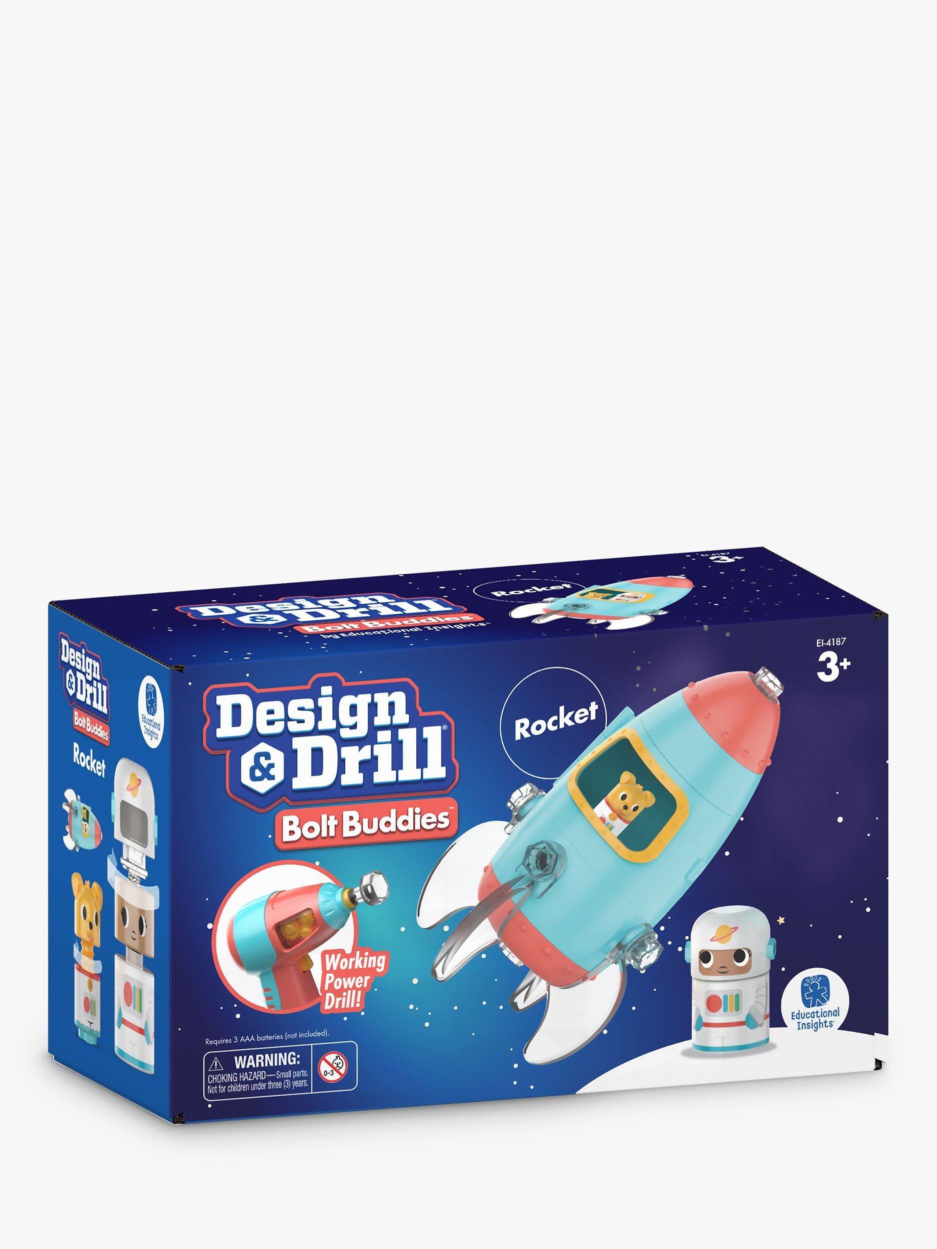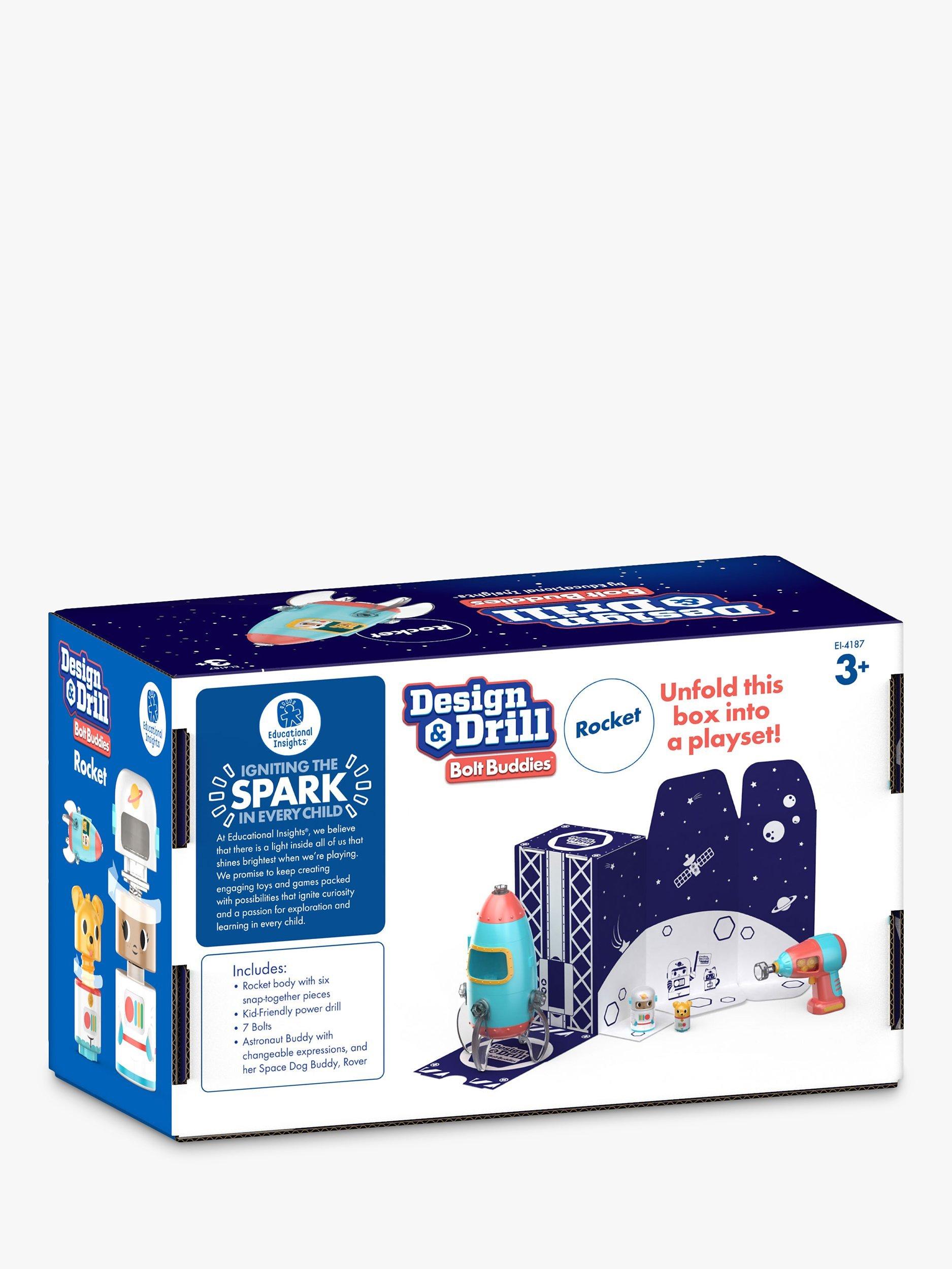 With so many ways to build and play, the Design & Drill Bolt Buddies will keep your little builder busy, busy, busy. Kids use a real, working, kid-safe drill to build the Rocket, then drop the Bolt Buddy astronaut and her and puppy pal into the cockpit and blast off into pretend play fun. Keep the box! Each Bolt Buddies package unfolds to become a unique reusable playset for even more imaginative play fun.