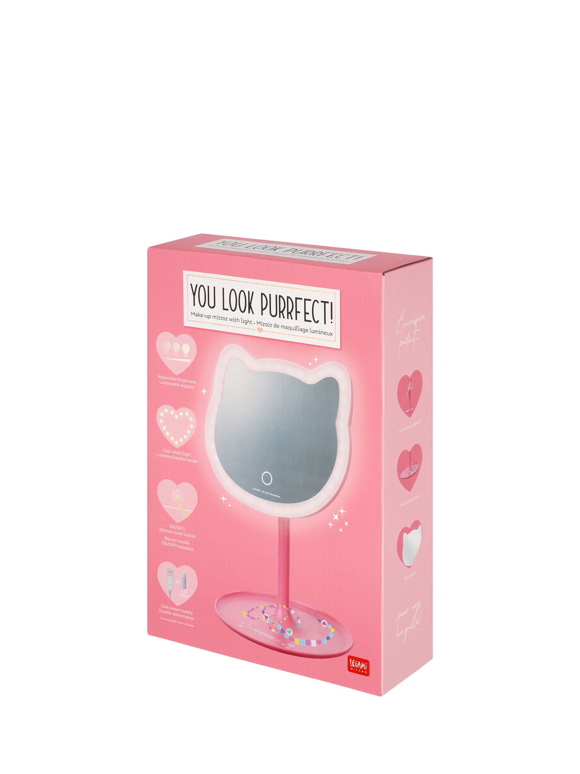 Look at yourself like you'd look at a kitten wanting a cuddle! Embrace your kittenish charms with the Make-up Mirror with Light - You Look Purrfect! from Legami. Illuminate your features with the light, place your jewellery and make-up on the handy tray at the base and get ready to purr!