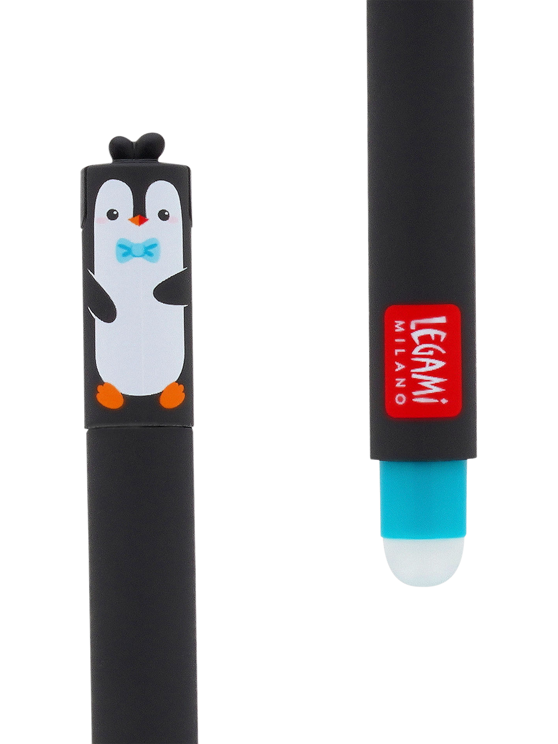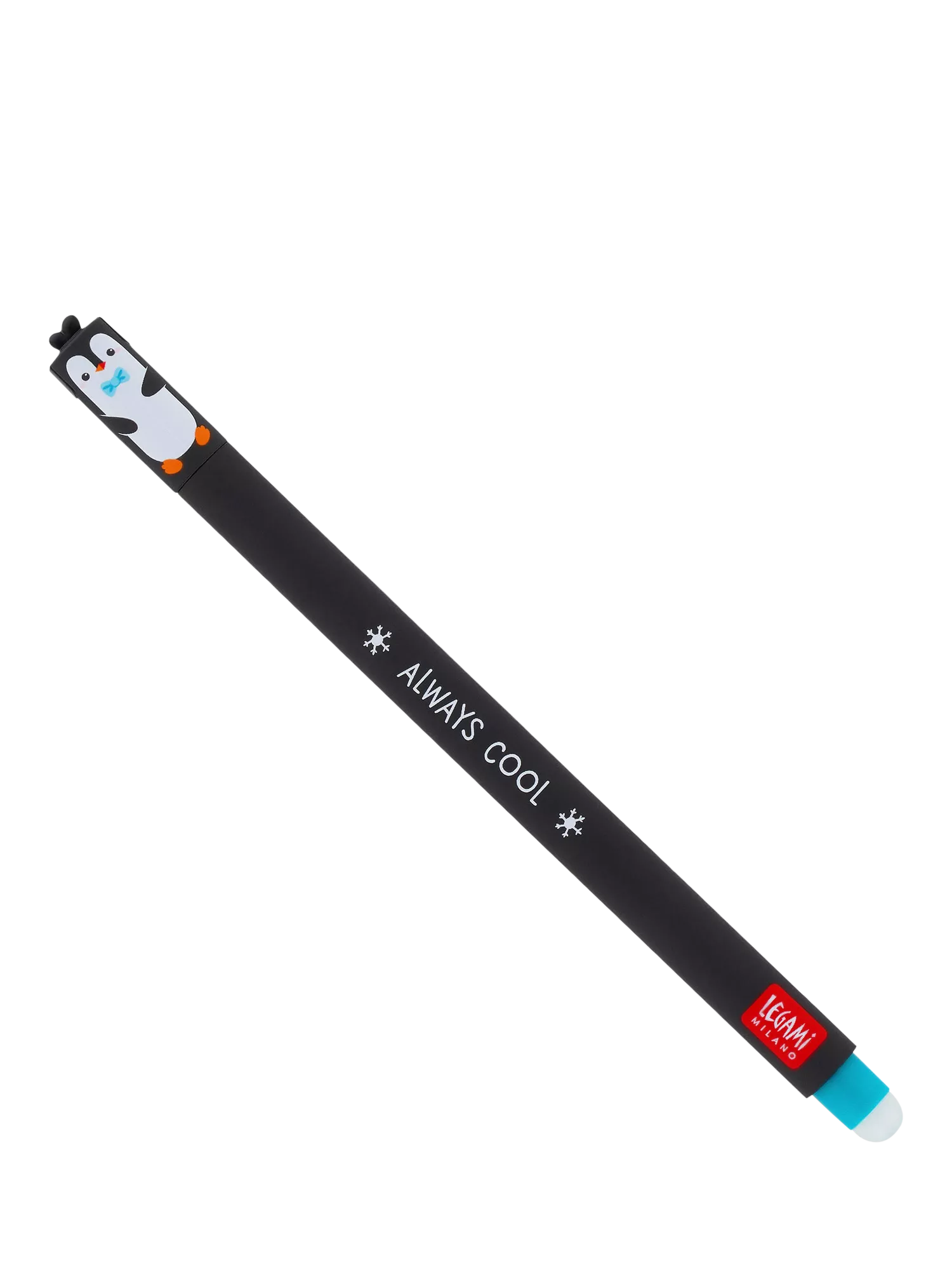Write, rub out, and start again! The newest Legami Erasable Gel Pen - Penguin lets you correct mistakes effortlessly. Its special rubber tip removes heat-sensitive ink without damaging the paper. Featuring a charming penguin design with the "Always Cool" slogan, this pen adds a fun touch to your stationery collection. Equipped with a turquoise refill to match its playful style, it's perfect for both kids and professionals alike.