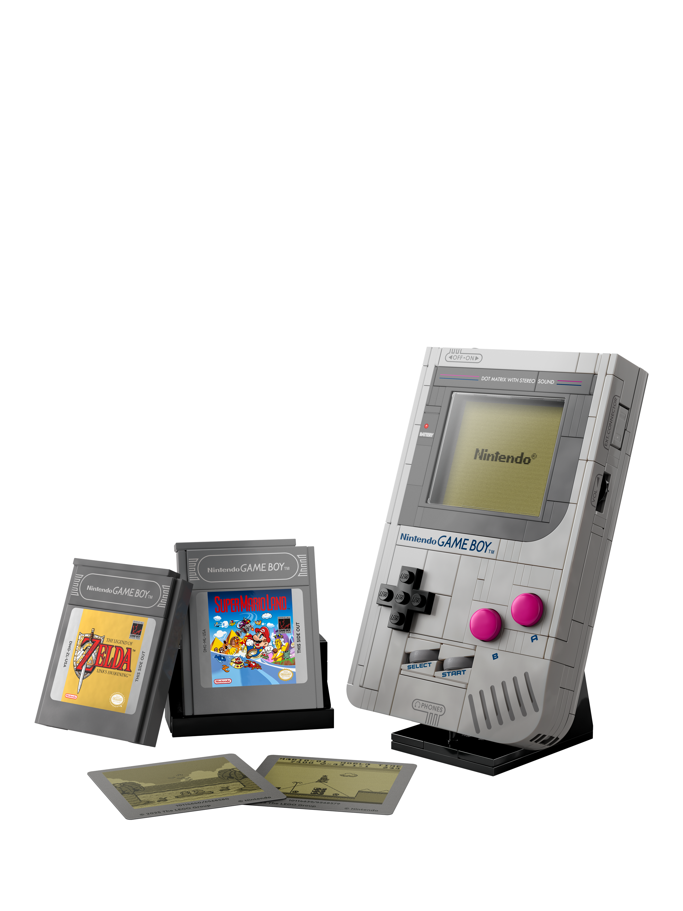 A fun, nostalgic gift for men and women who are fans of Nintendo video games, the collectable building set features a near 1:1 scale brick-built replica of the original Game Boy handheld game system from Nintendo. Press the +Control Pad, A and B Buttons, and SELECT and START, just like on the real system. The model also has other iconic Game Boy details, including the contrast adjustment and volume dial and the Game Pak slot. Customise your display with interchangeable, brick-built The Legend of Zelda: Link's Awakening or Super Mario Land Game Boy Game Paks and corresponding lenticular screens (or a Nintendo start screen). Place your creation on the buildable display stand to complete a nostalgic home or office desk decor display.