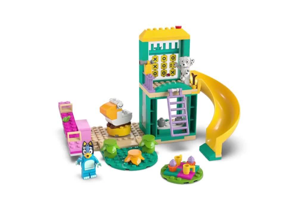 This versatile playground building toy features LEGO minifigures of popular TV dogs Bluey and Chloe in a vibrantly coloured playground, complete with seesaw, slide, jungle gym and rotating pelican ride. There are also 3 LEGO plants included in the Bluey toy for the characters to jump between, a tower with a telescope and a picnic area with drinks and cakes.