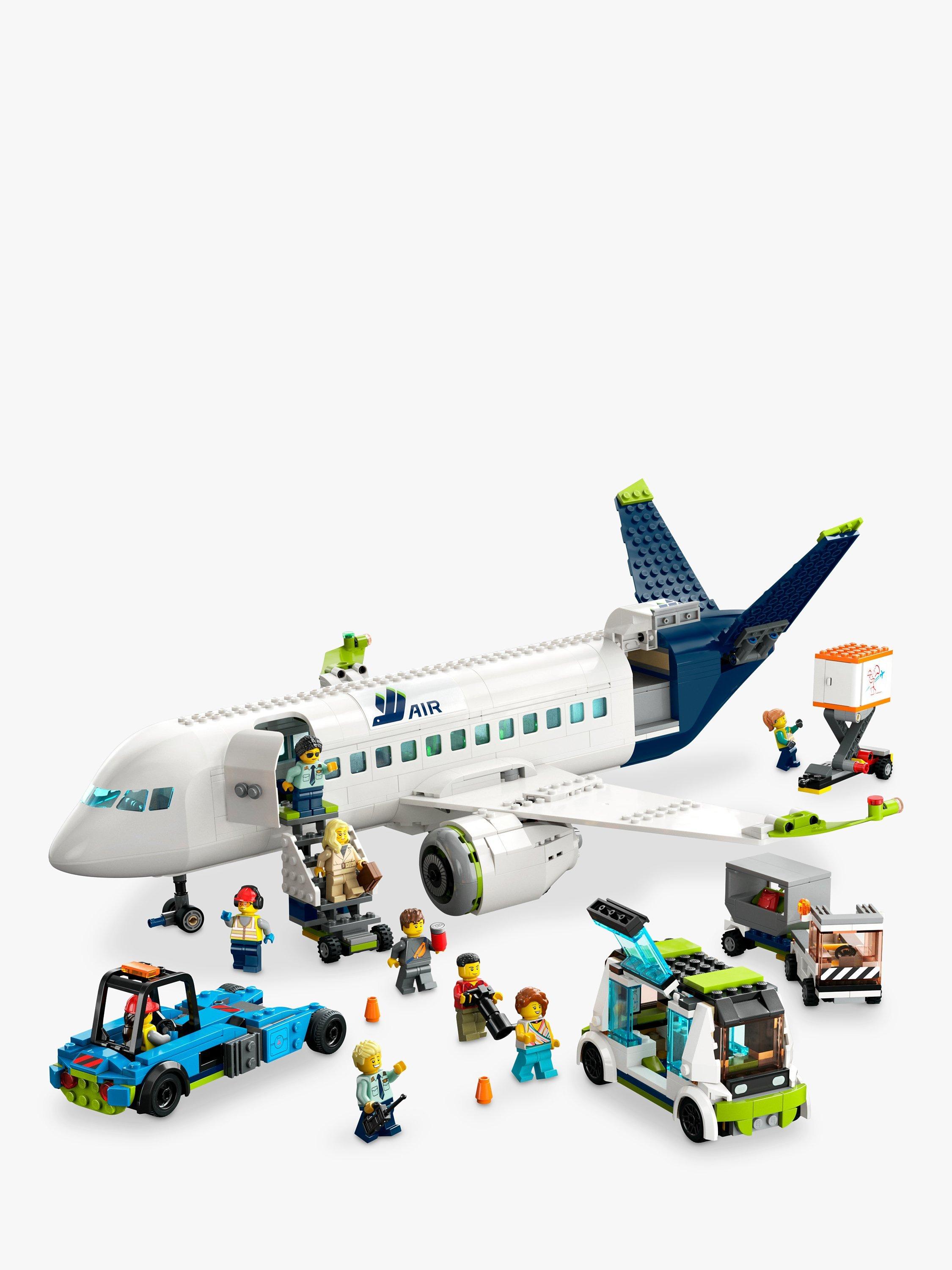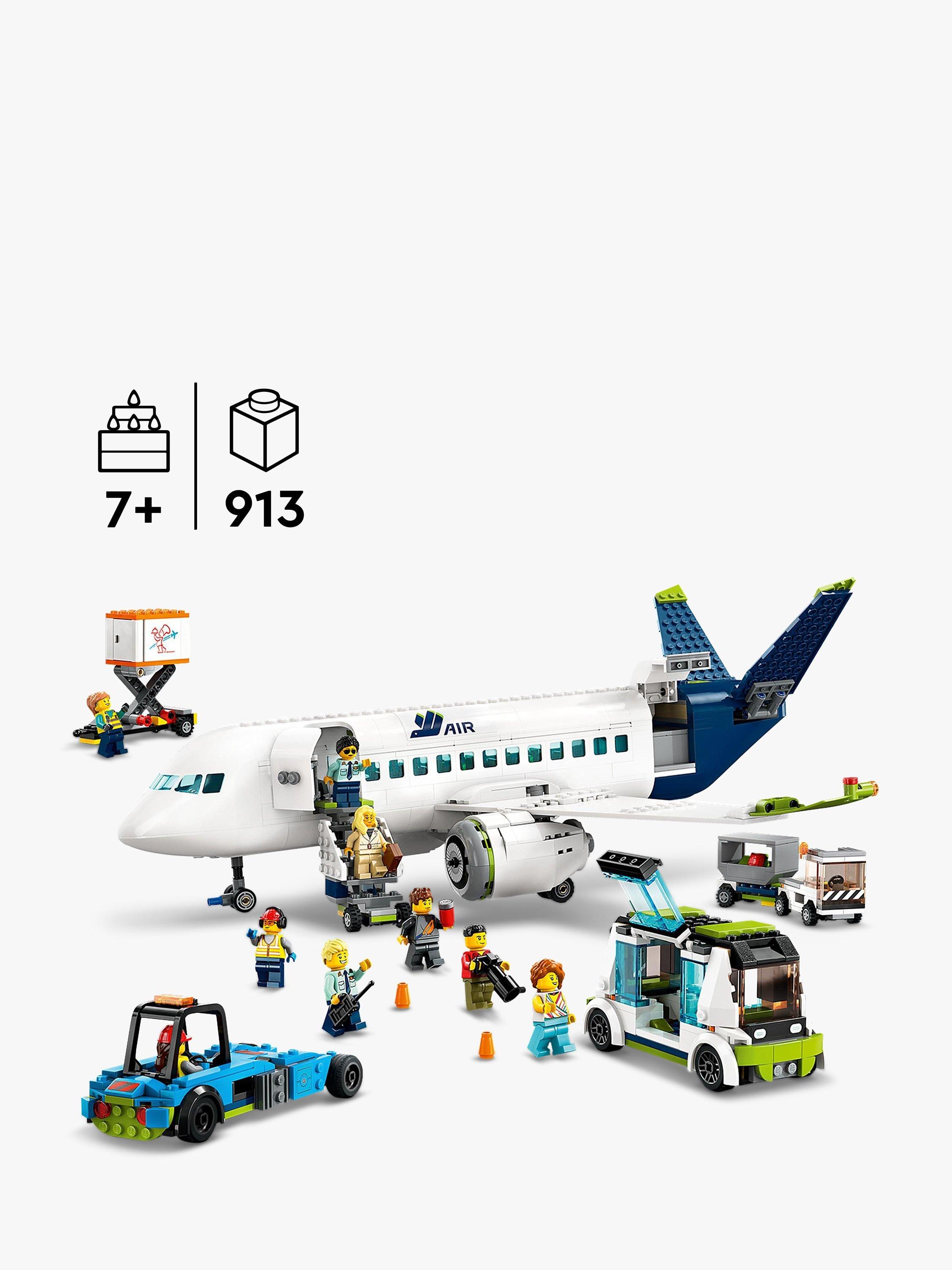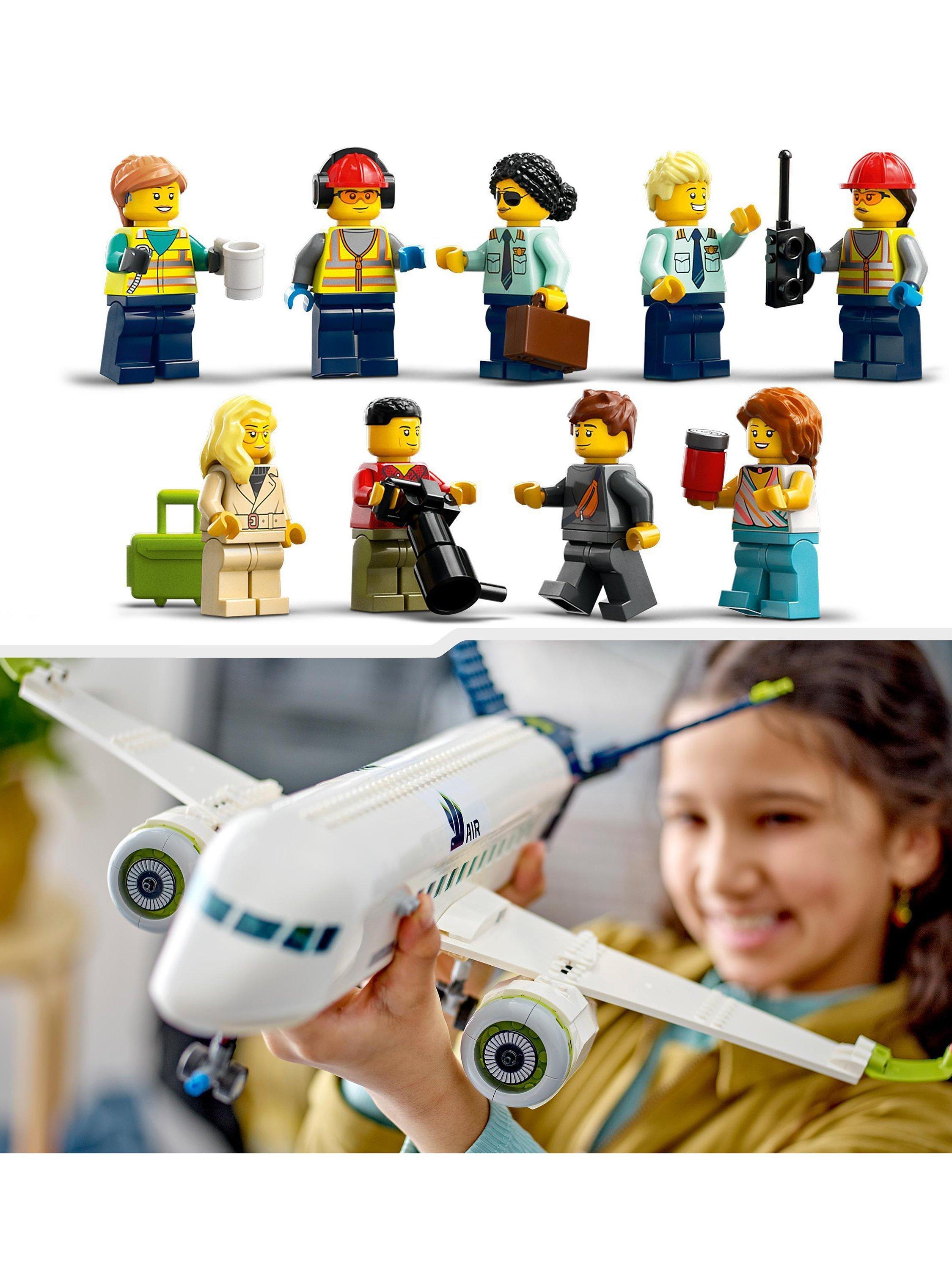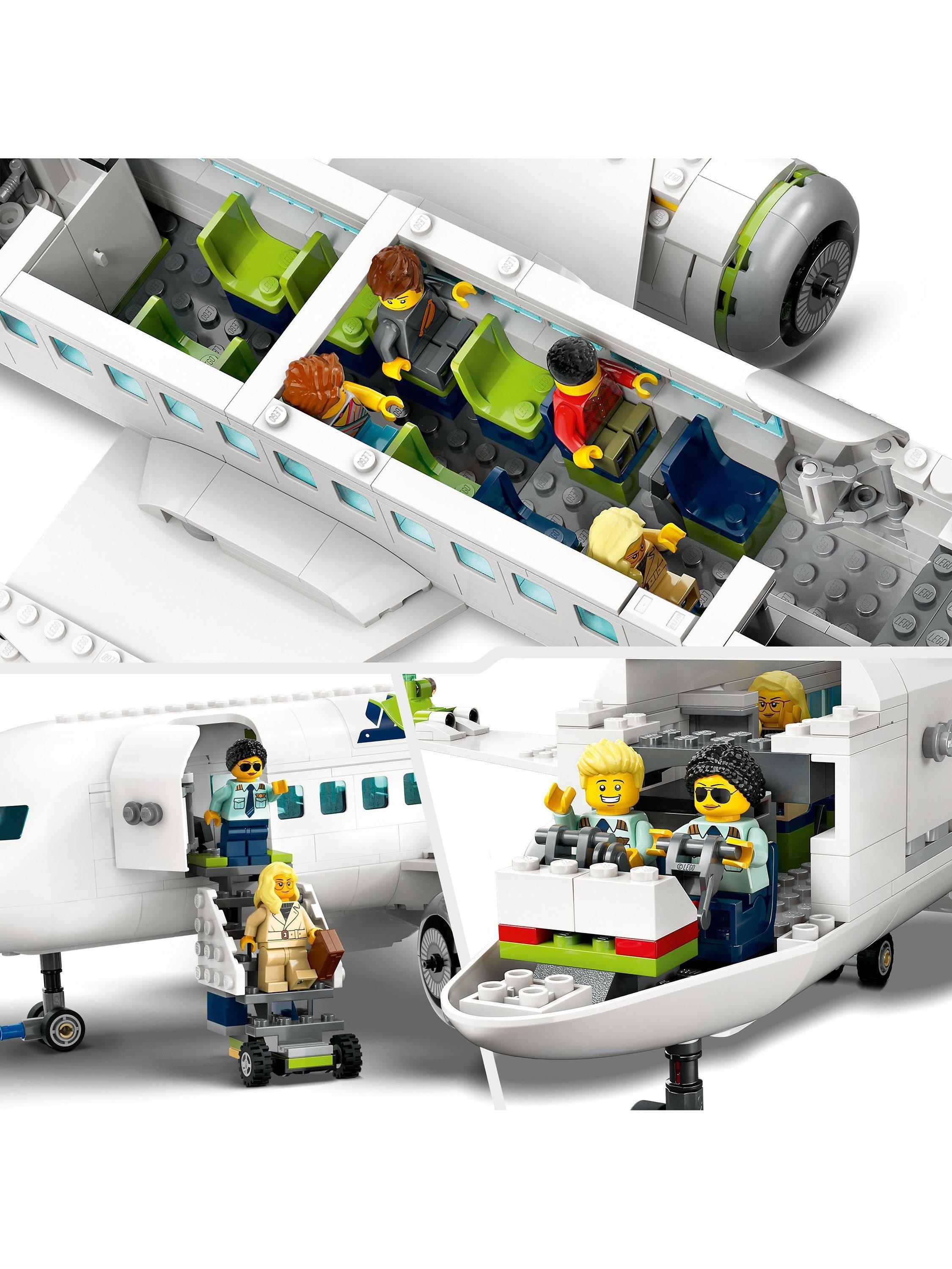 The LEGO® City Passenger Airplane is due for departure. The apron bus is on its way and it's time to position the airstair to board the passengers. A catering truck is loading up food and drinks, the baggage handlers have arrived and the pushback tug is ready to wheel out the aircraft. On board, the aisle is clear, and the seats and toilet are clean and ready. Prepare for takeoff!