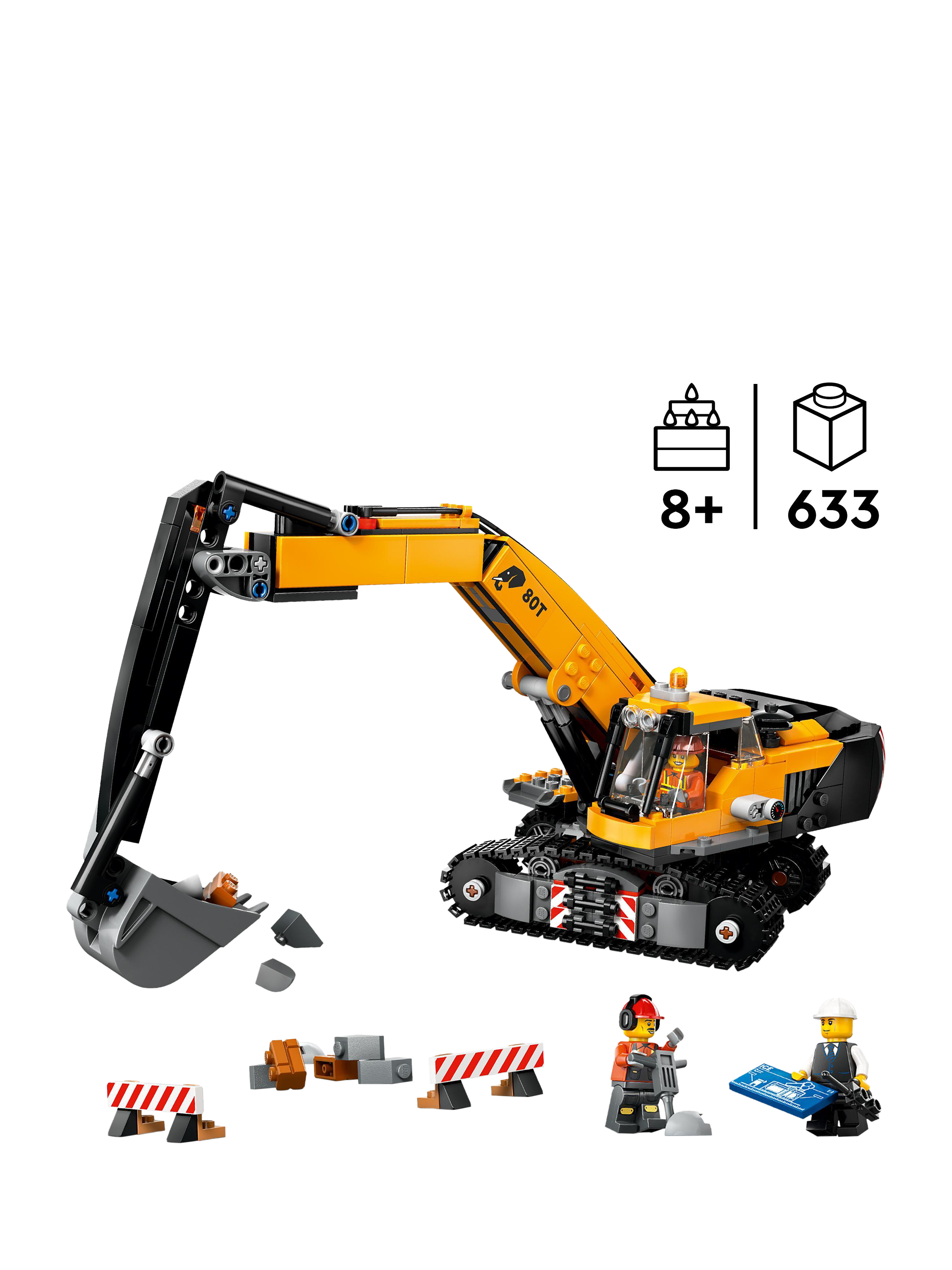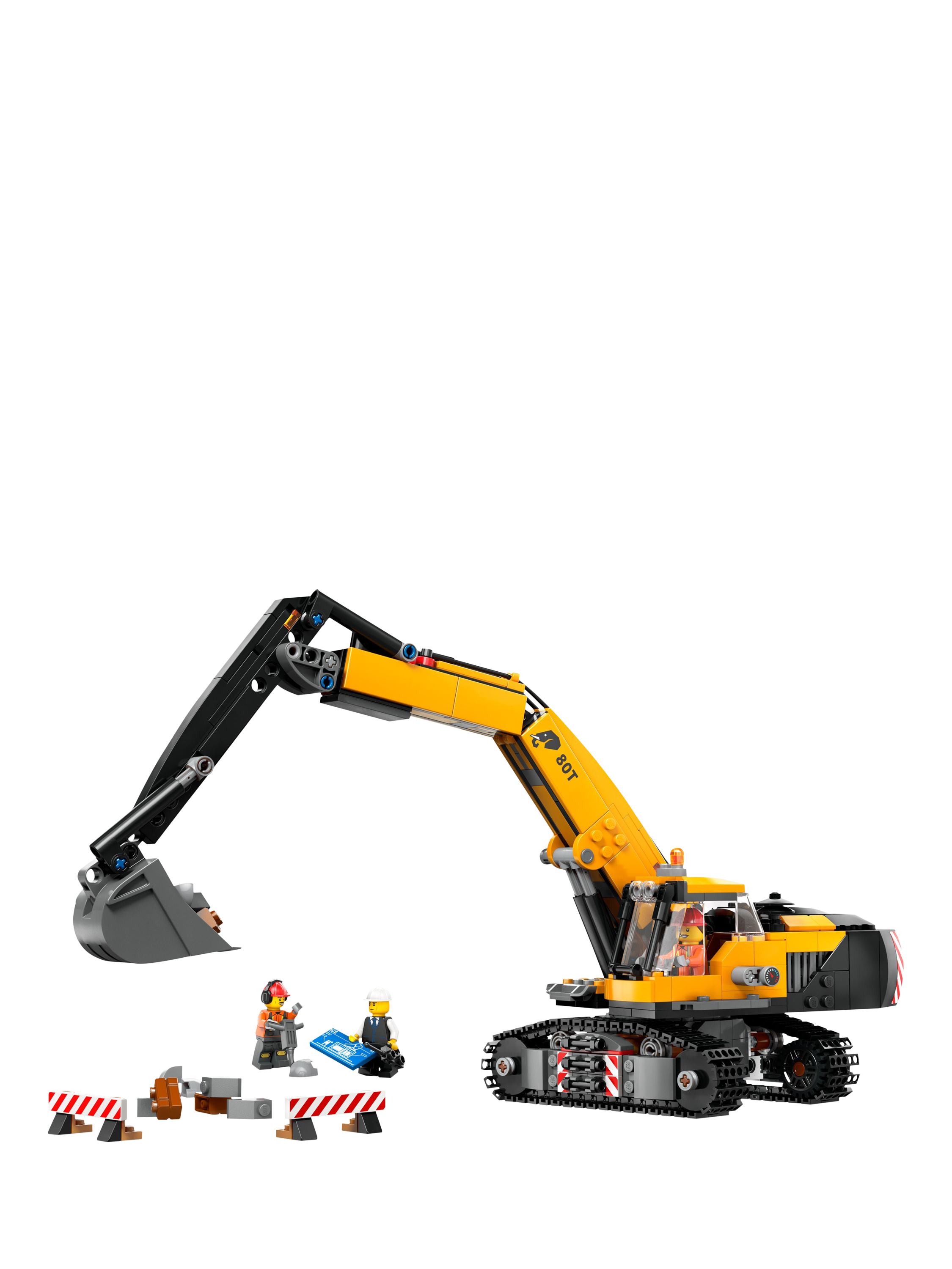 This mammoth machine rolls on huge ground-gripping tracks for access to rugged construction sites. Use the barriers to cordon off your work zone, then hop aboard and take control of the super versatile boom. Spin the cab 360° and use the bucket to dig, lift and transport massive loads. Get ready for hours of epic building fun!