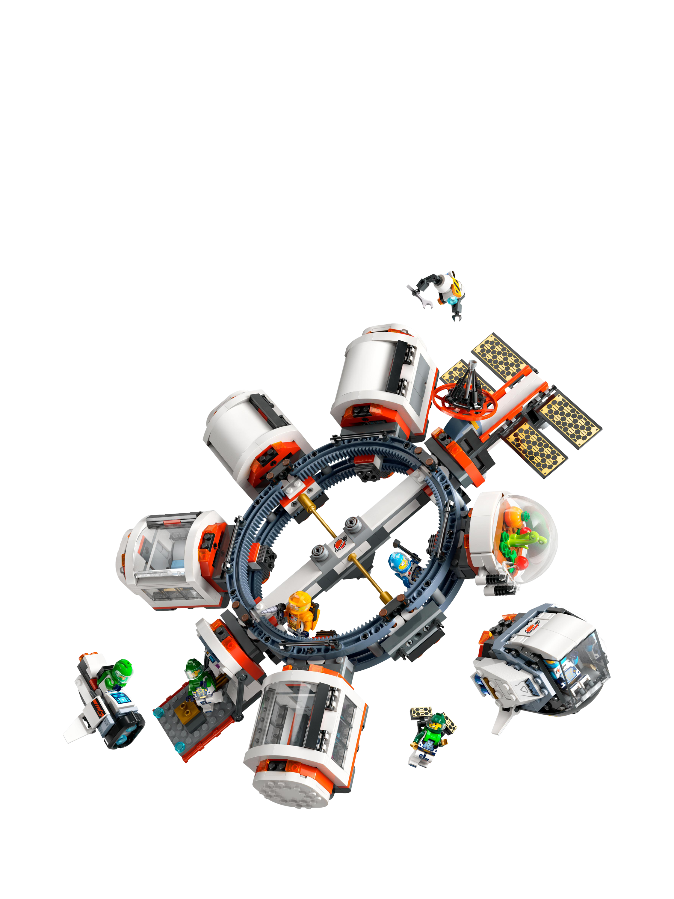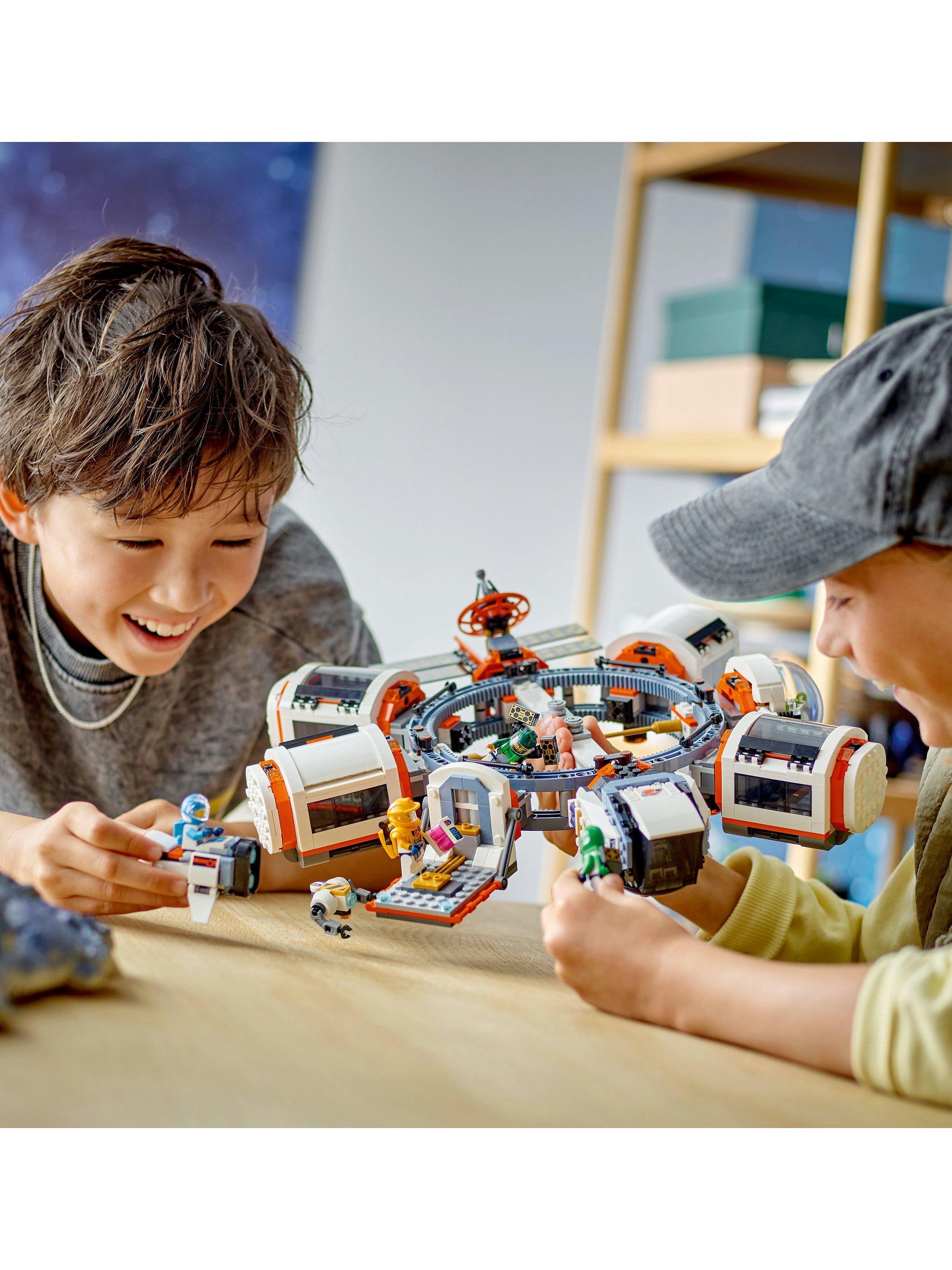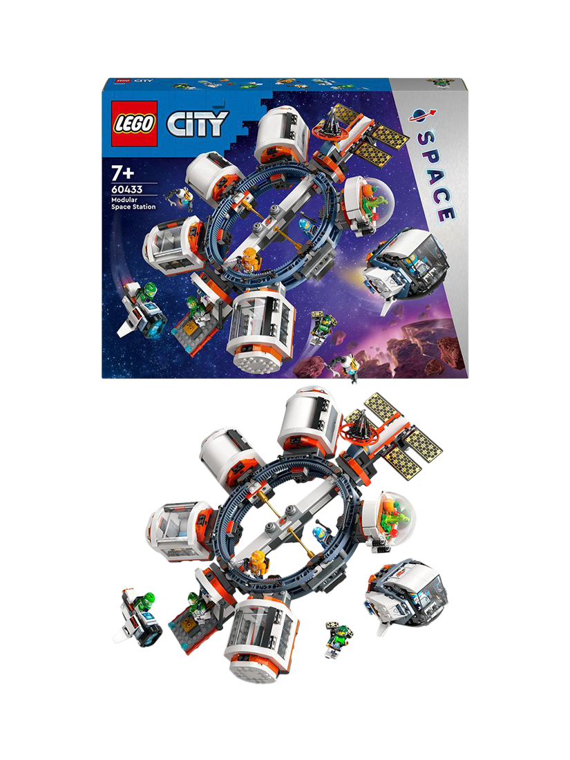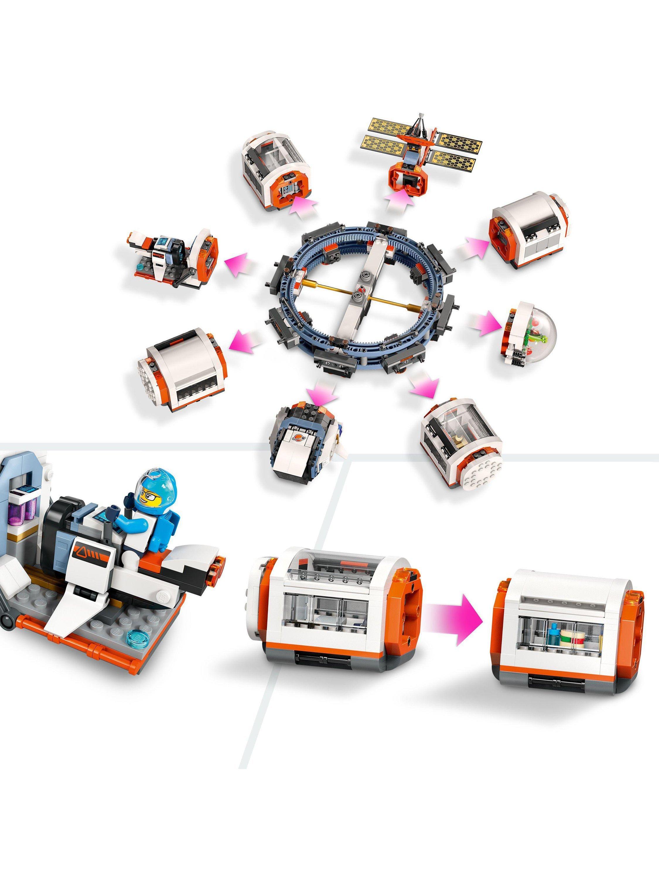 Join the space crew aboard the LEGO® City Modular Space Station. This futuristic space ring is an orbiting anchor for docking spacecraft and room pod modules, including a satellite, space bike, shuttle, science lab, repair workshop, kitchen, sleeping quarters and a biodome. Switch the modules around to create your own space station design or join them to the shuttle to form a cool space train!