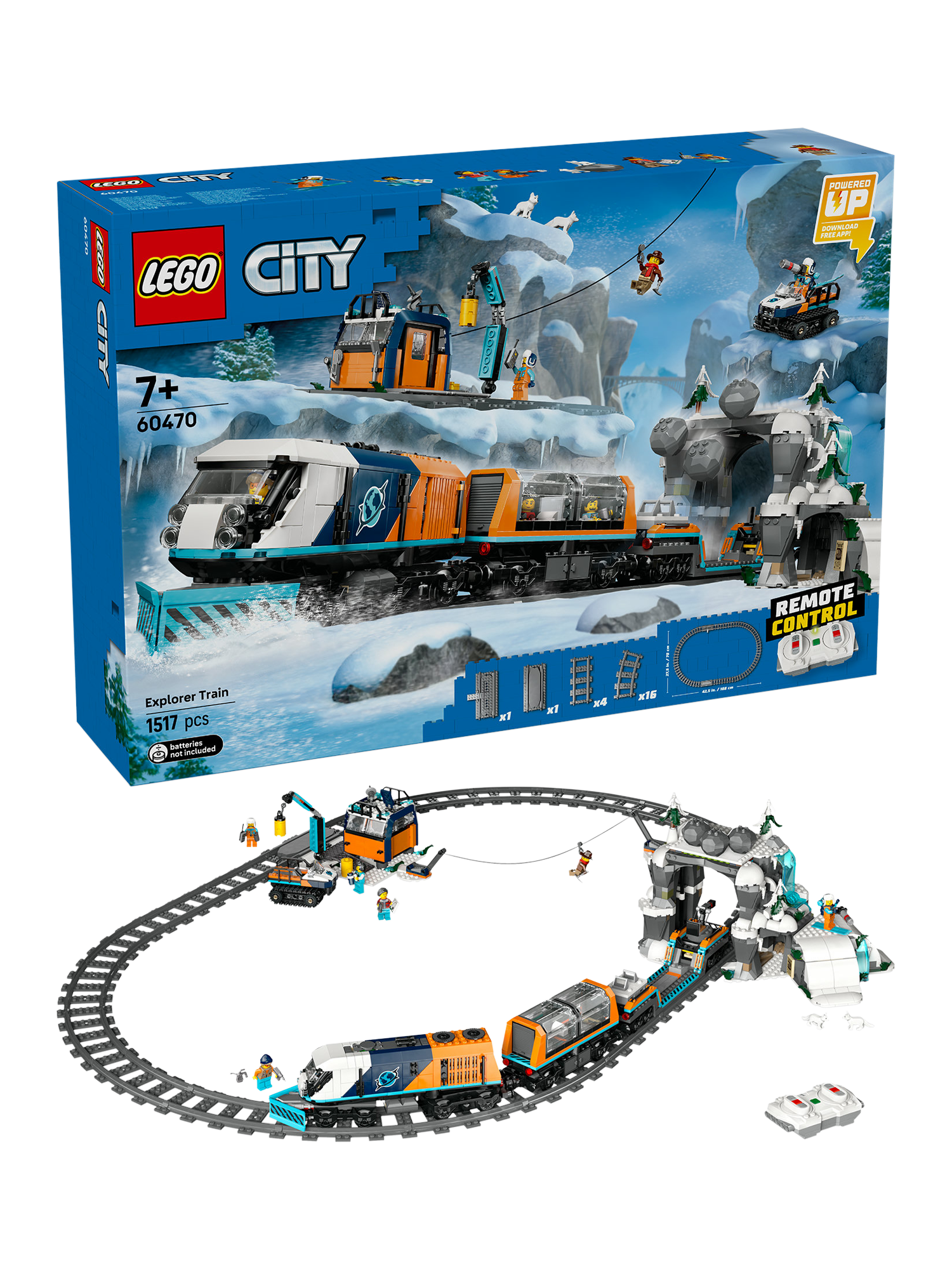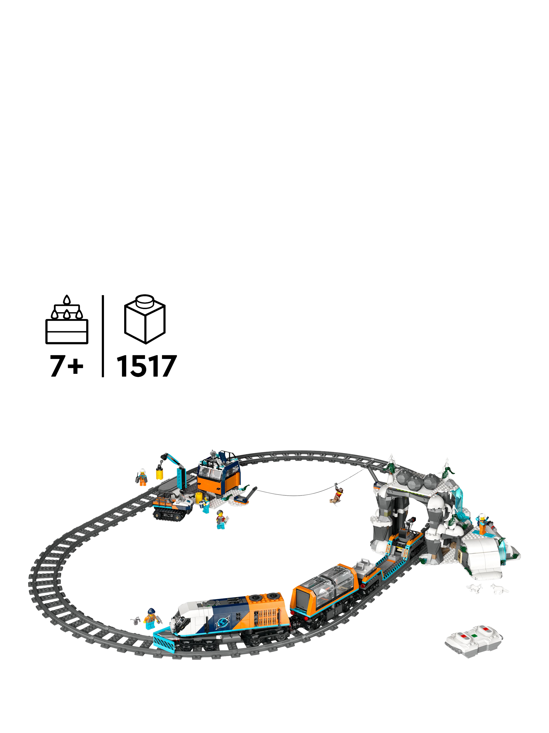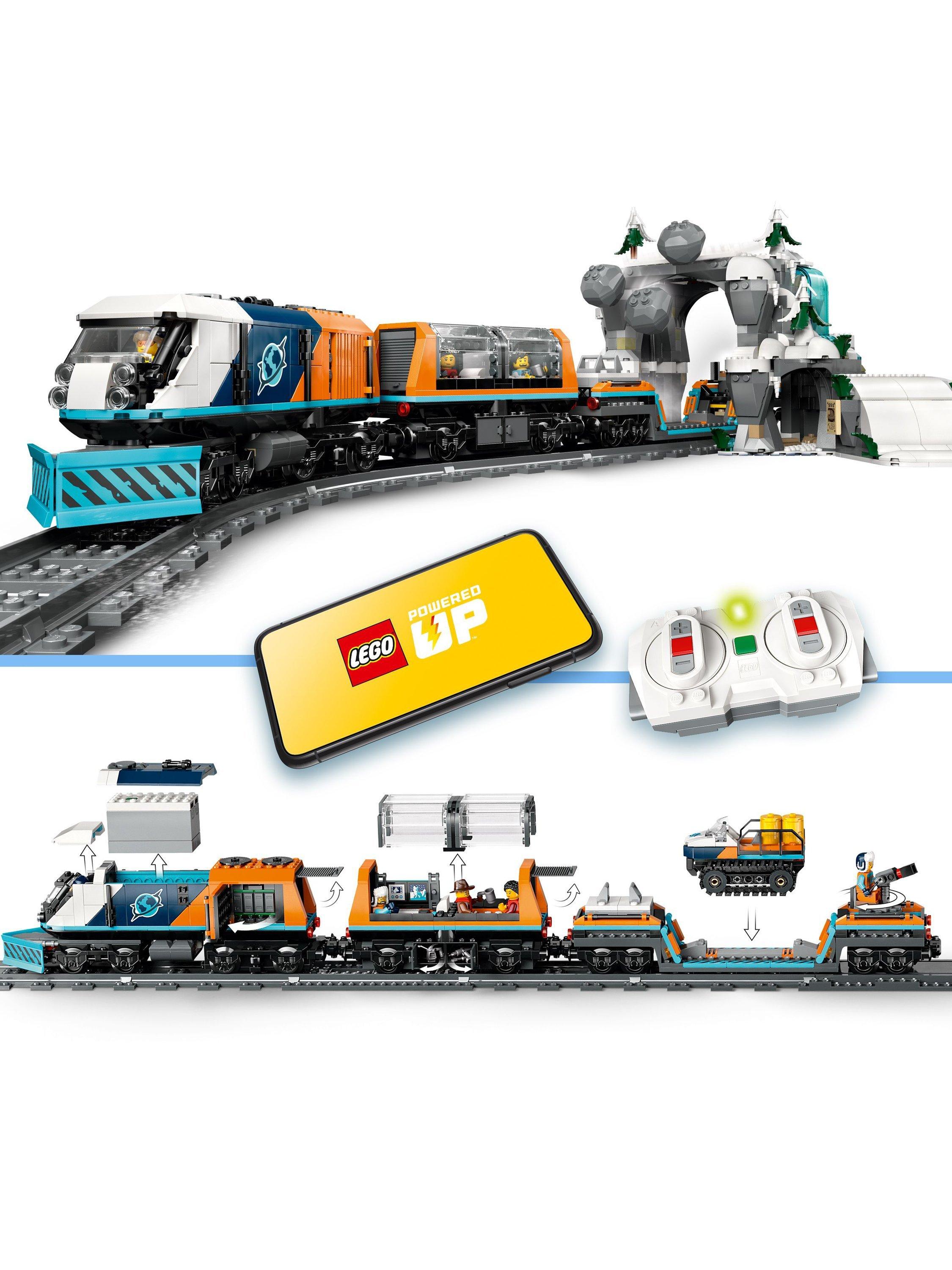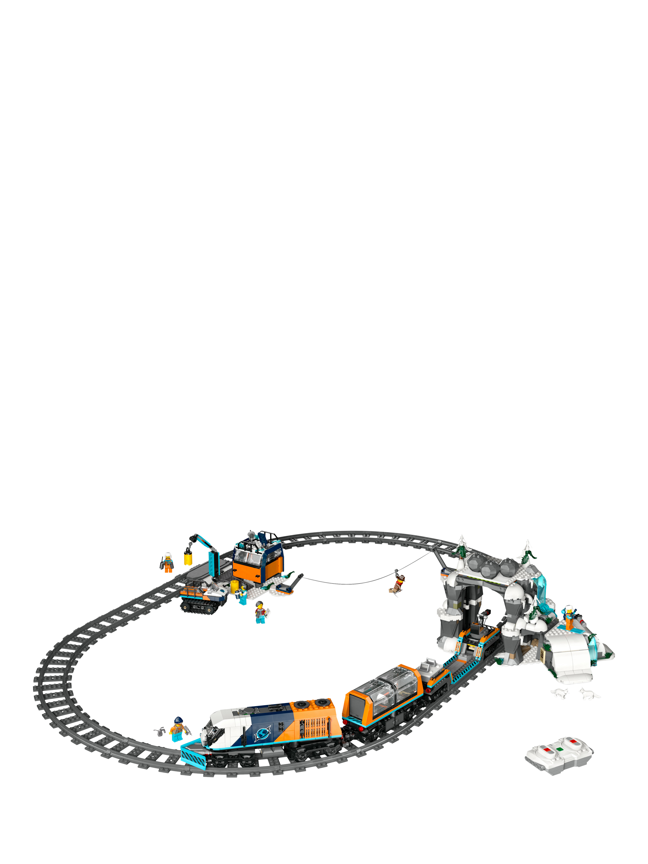 This premium building toy for 7+ year old boys and girls features a remote-controlled LEGO Powered Up train toy with a snowplough, panoramic passenger coach, flat wagon and snow tractor toy. Kids get 30 pieces of LEGO train track, a mountain tunnel with a rockfall function, an outpost building and a mining cave. Just add the Johnny Thunder and 5 LEGO explorer minifigures, plus 2 Arctic fox animal figures, and let the adventures begin.