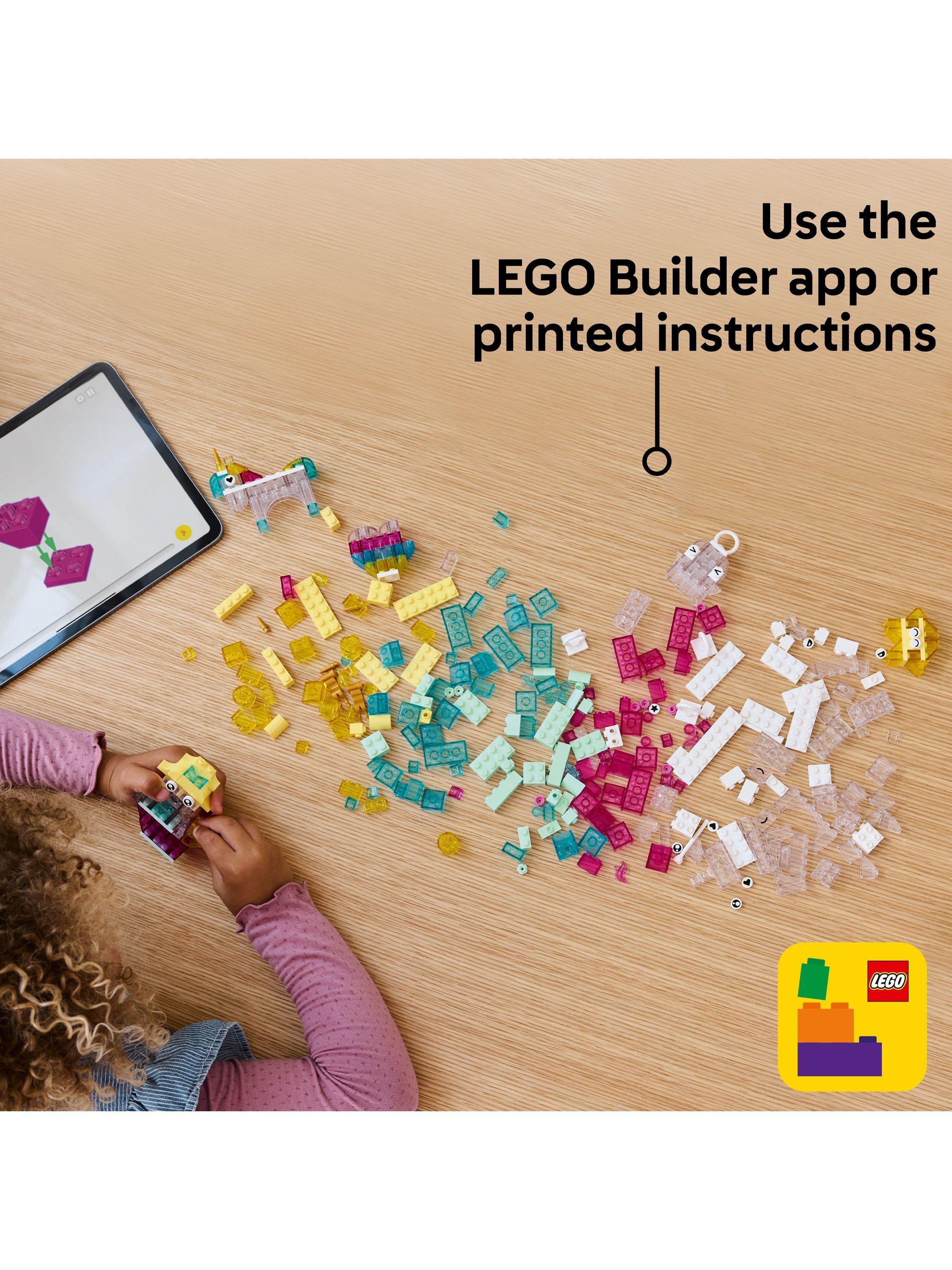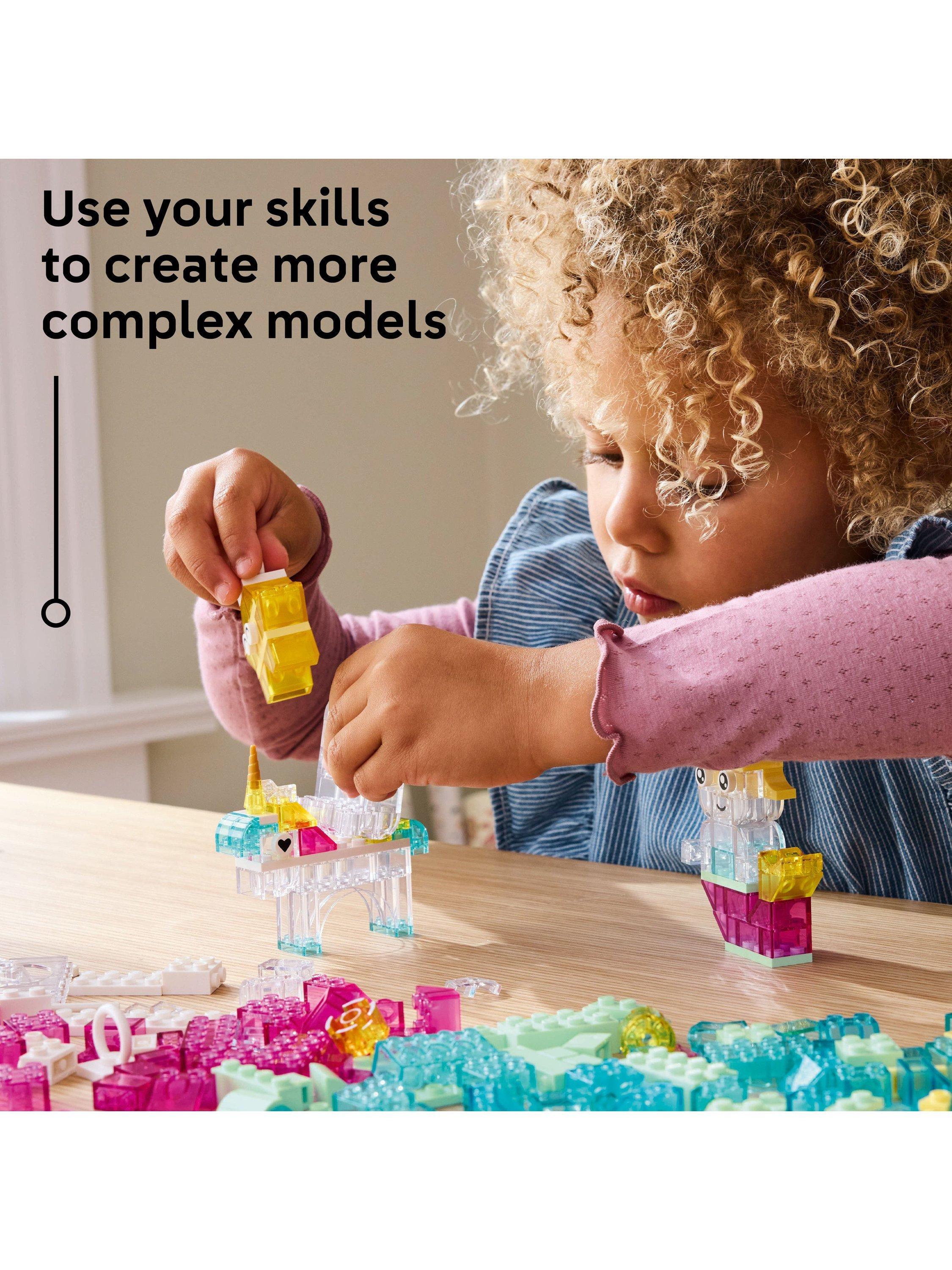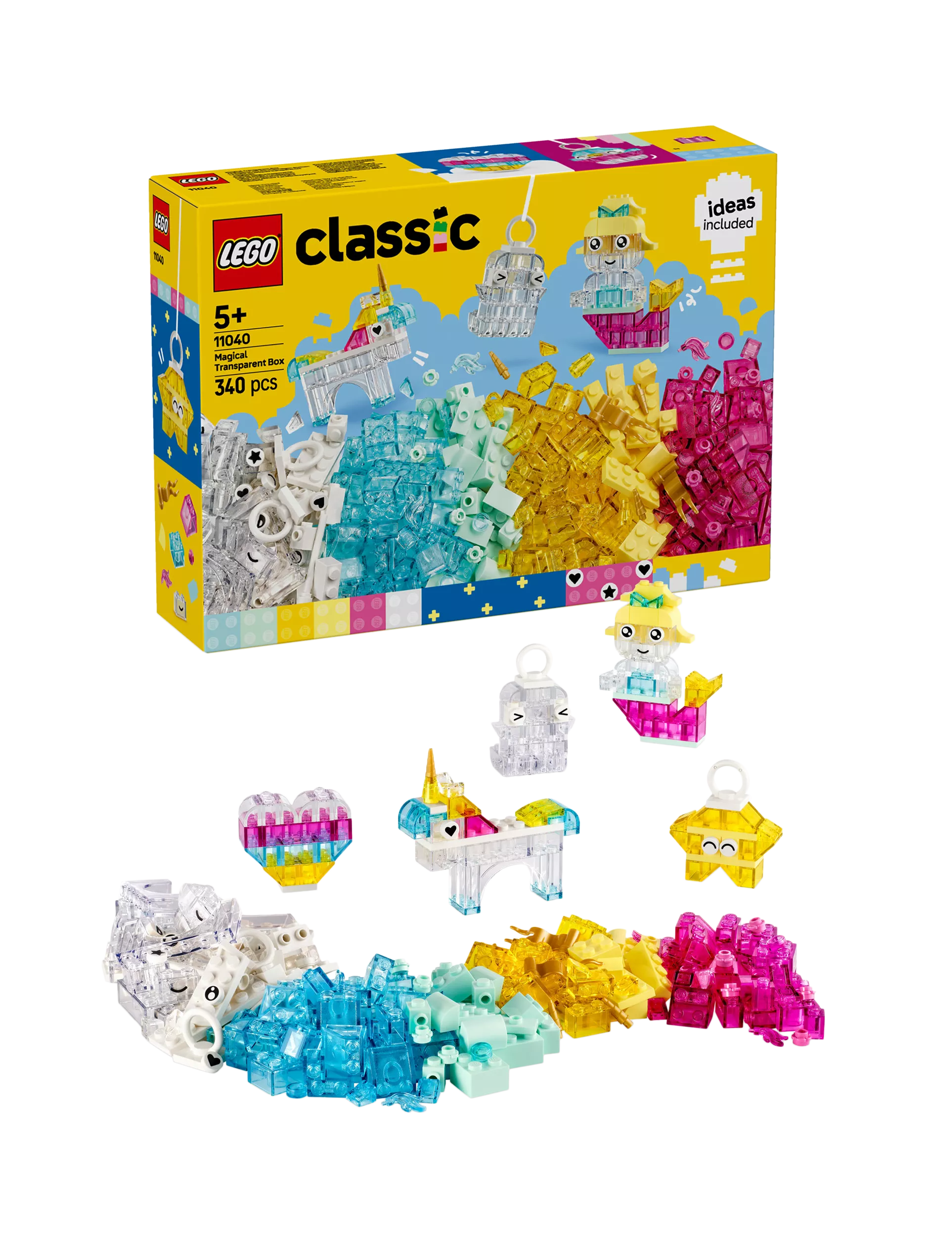 LEGO® Classic Magical Transparent Box (11040) will provide creative fun that lasts and lasts. With 340 colourful bricks, many of them transparent, plus a variety of special elements, this build-and-display set inspires kids’ creativity with enchanting models and endless imaginative play.