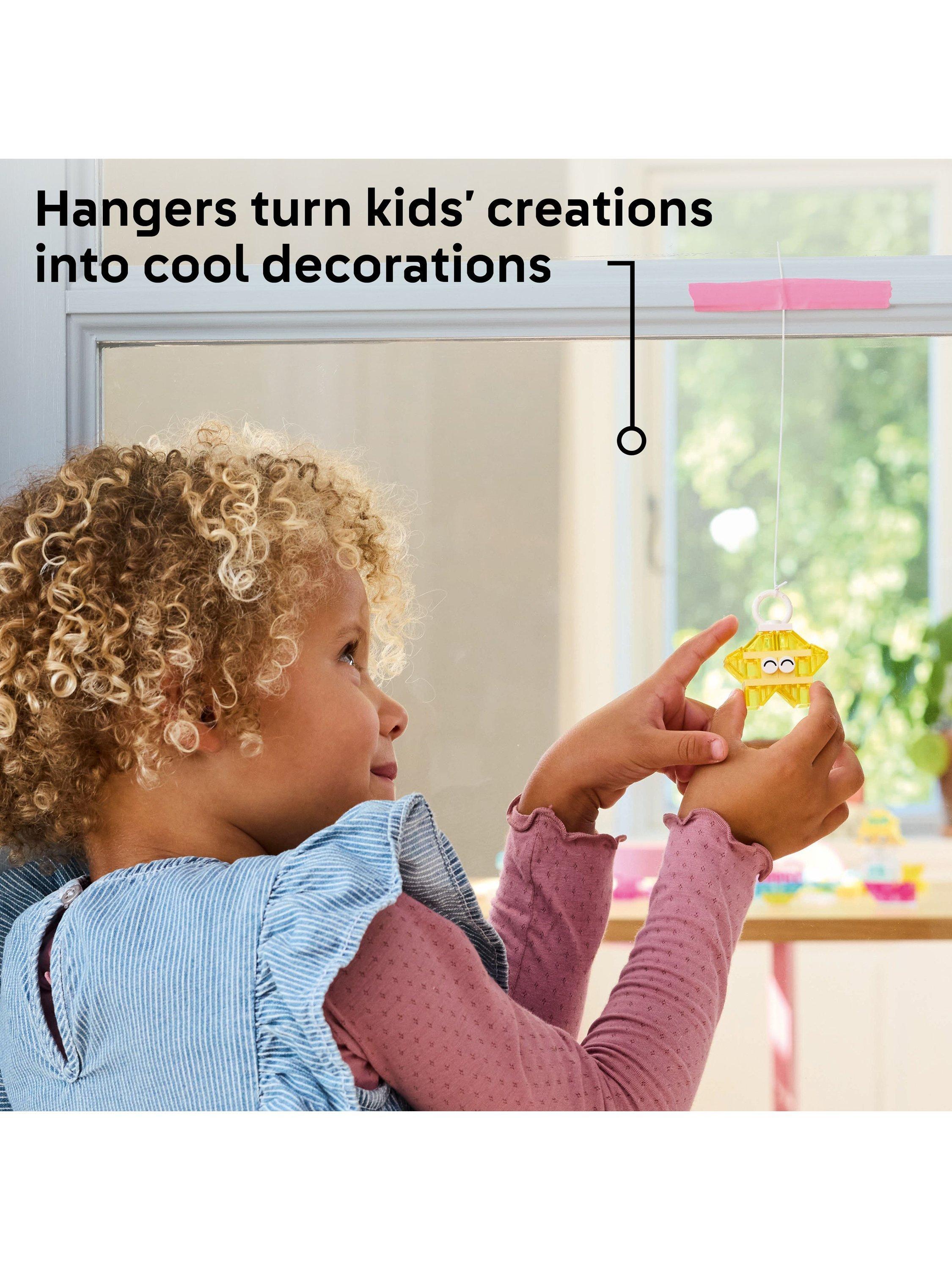 Kids begin by building heart, ghost, mermaid, star and unicorn toys. As their building confidence grows, they move onto a spaceship, cloud, shooting star, bird, narwhal, ice cream and flower. Next, they can scale up the creative fun with a large castle and dragon toy. Translucent bricks, eye and mouthpieces and hanger-bricks for display add see-through sparkle and extra creative fun to kids’ creations.