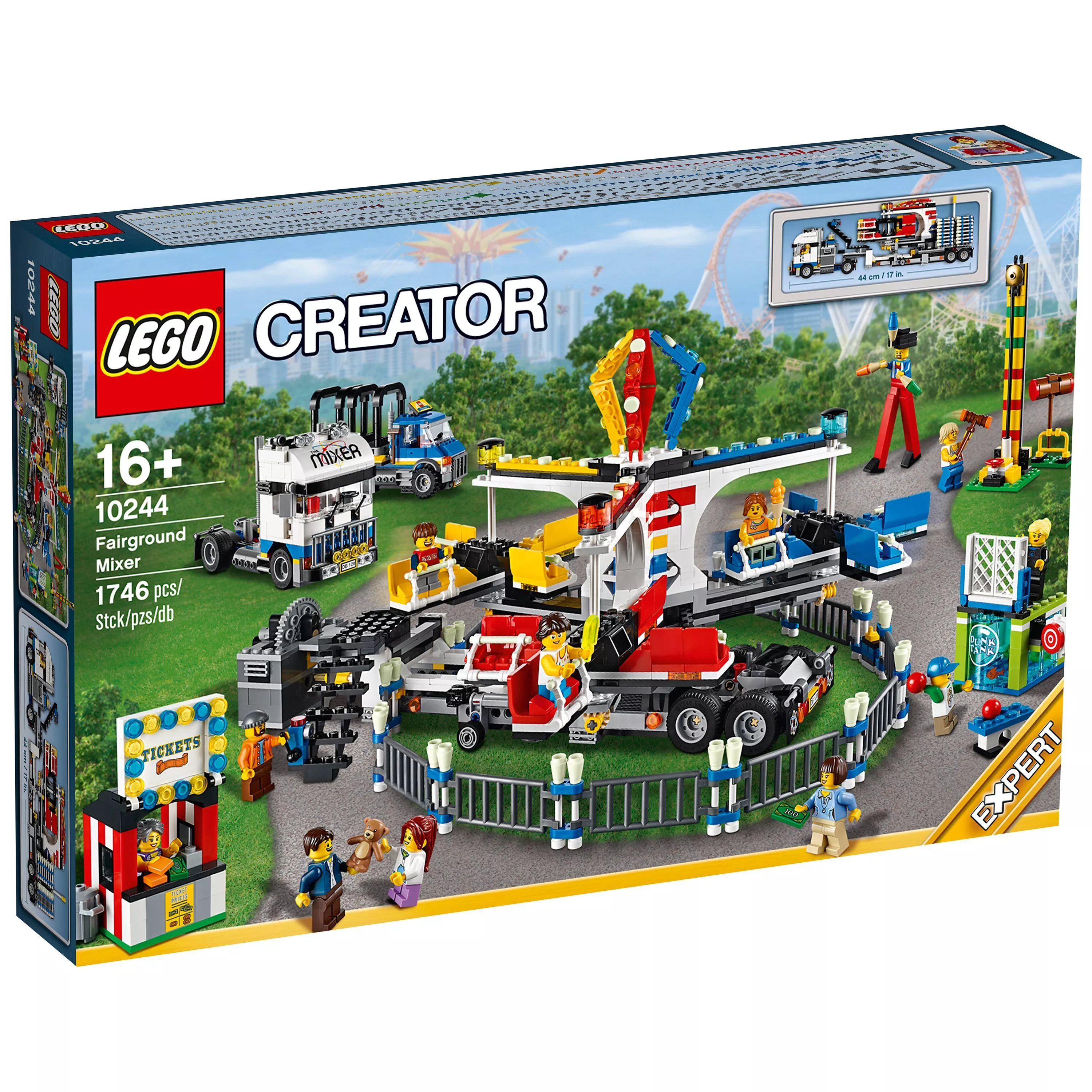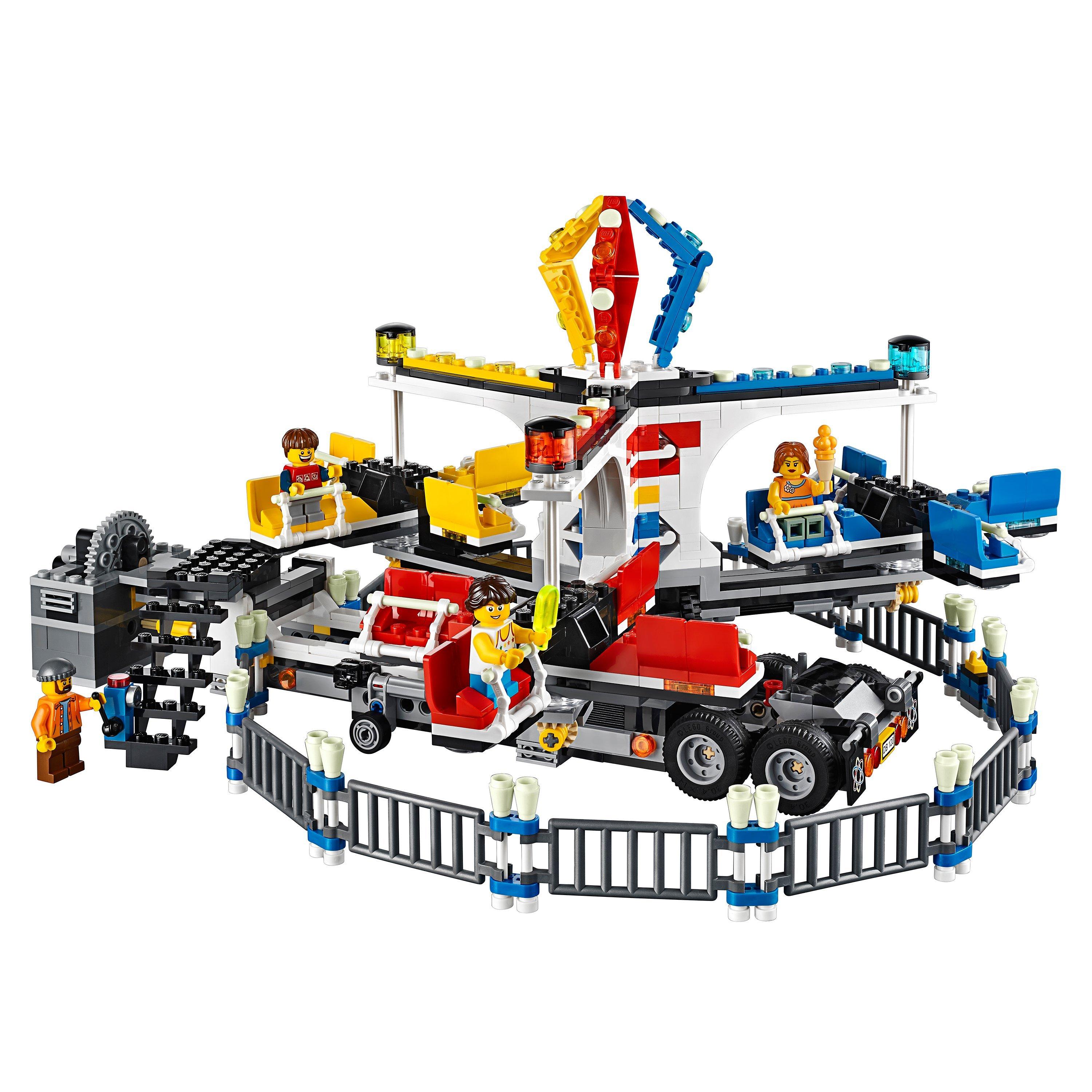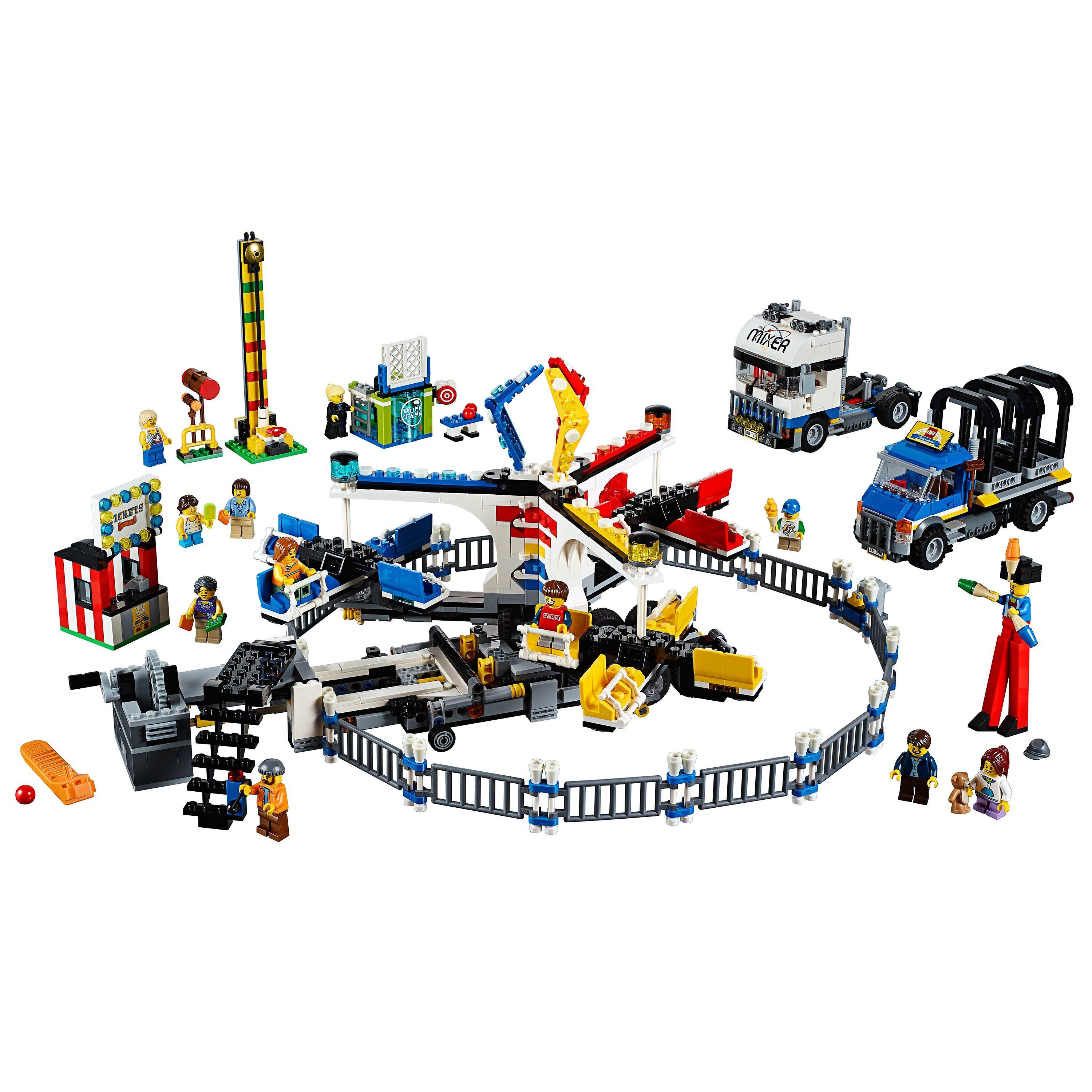 Includes 12 minifigures: a juggling man on stilts, dunk tank lady, strong man challenger, ticket lady, lorry driver/ride operator, 2 women, 2 girls, 2 boys and a queasy man who tried the mixer one too many times.