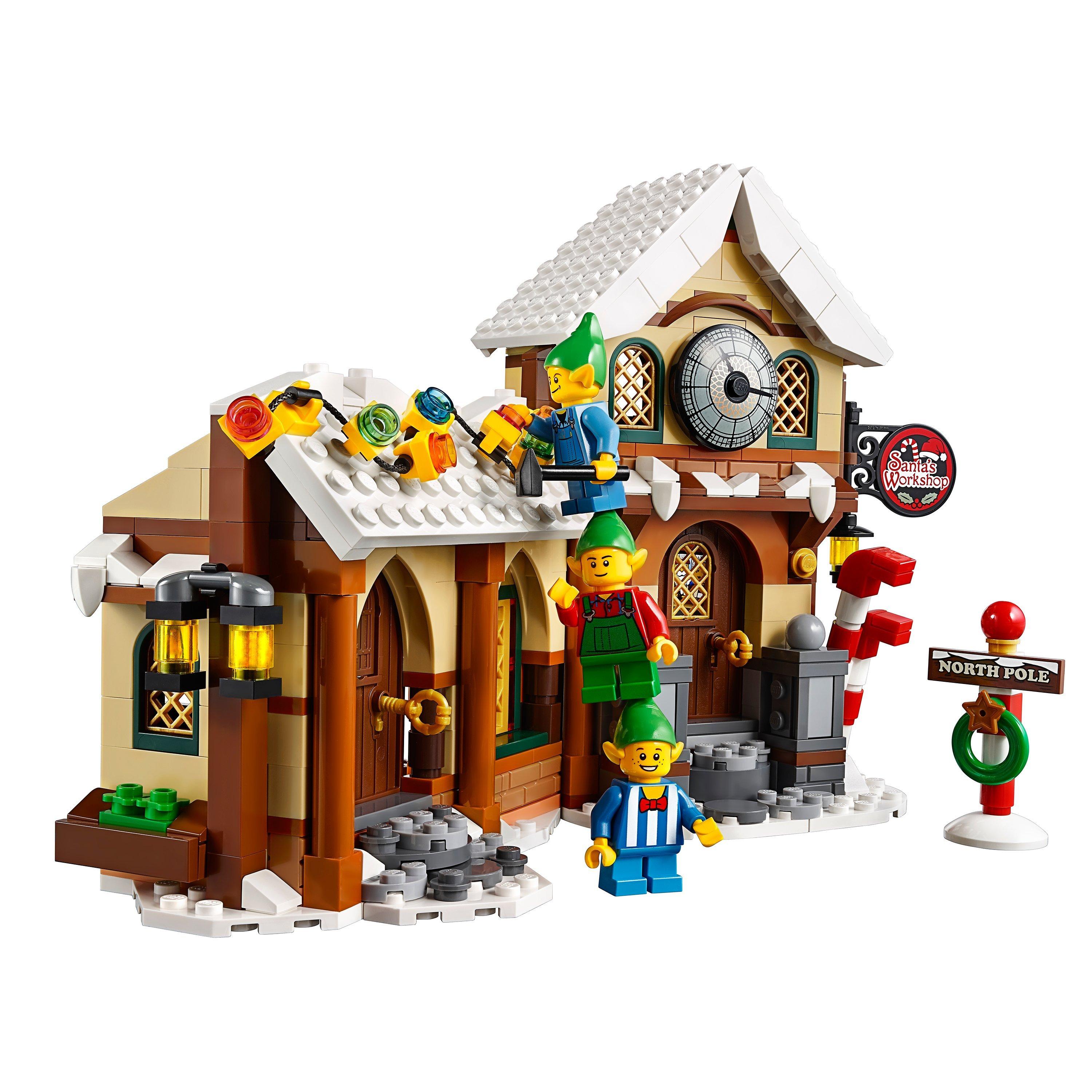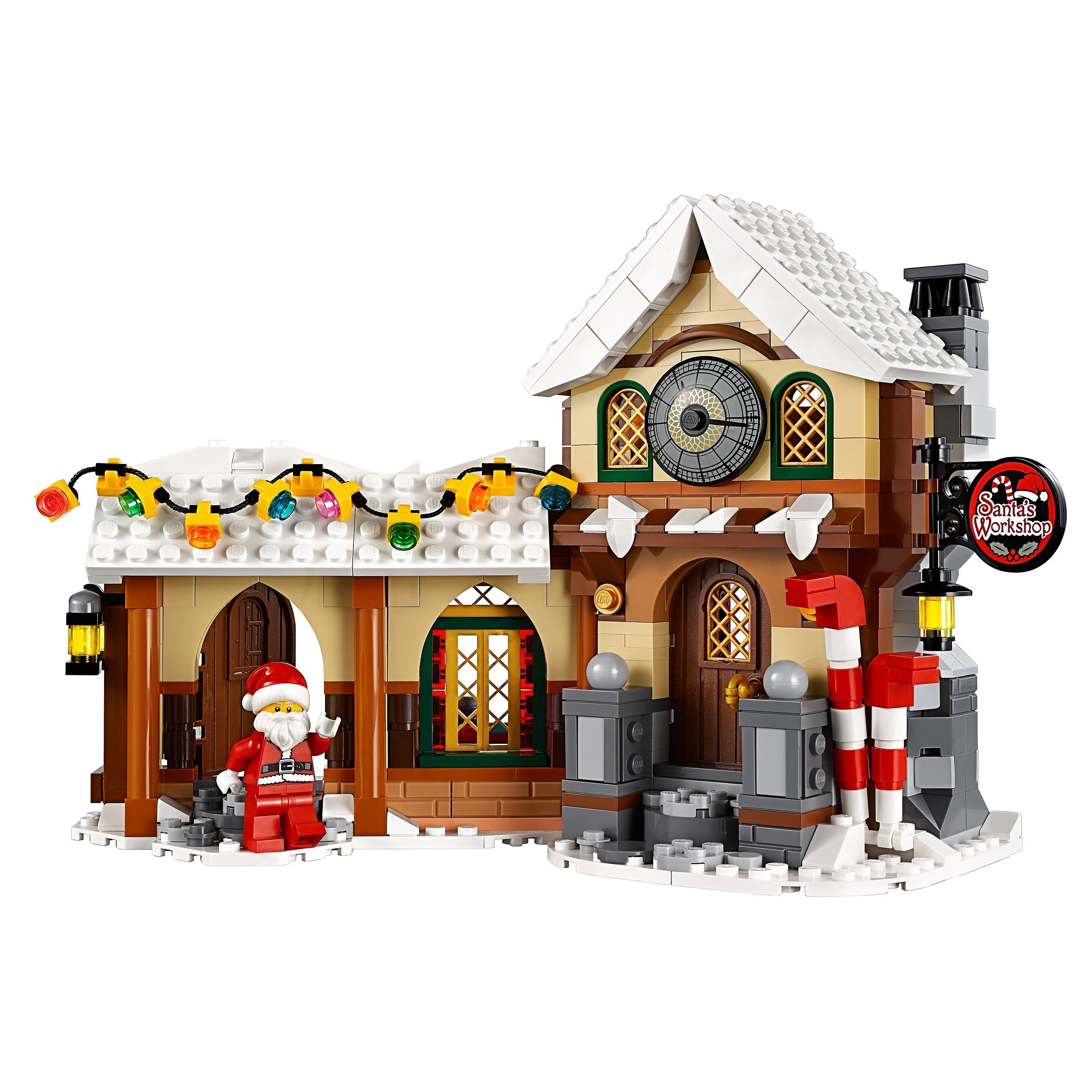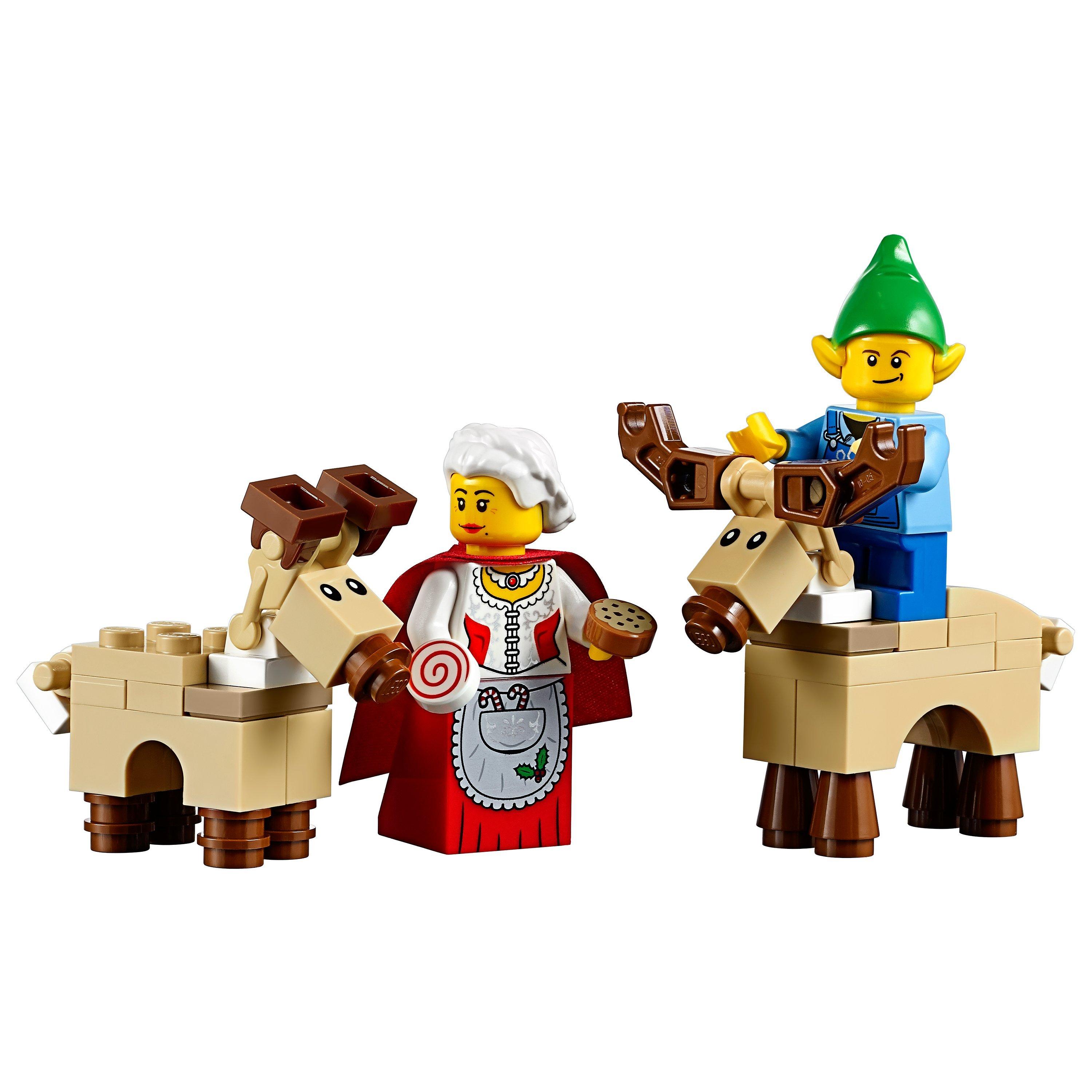 This festive addition to the LEGO Creator Winter Village Series includes 6 minifigures: Santa with red gift sack, Mrs. Claus with biscuit tray and 4 elves with pointy ears and hats.