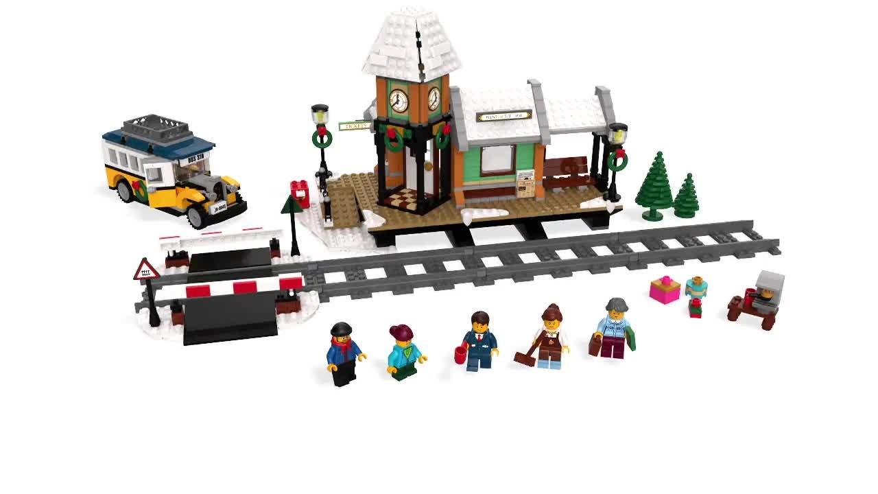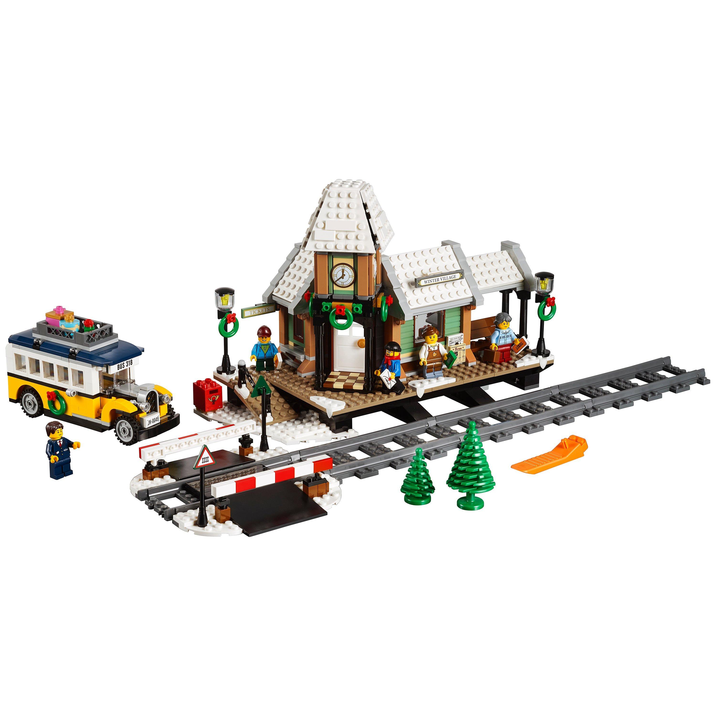 - The festively adorned Winter Village Station features a snowy train station with a clock tower, platform, coffee shop, ticket counter, grade crossing with twin barriers and lights, lampposts, mailbox and green trees, plus a bus