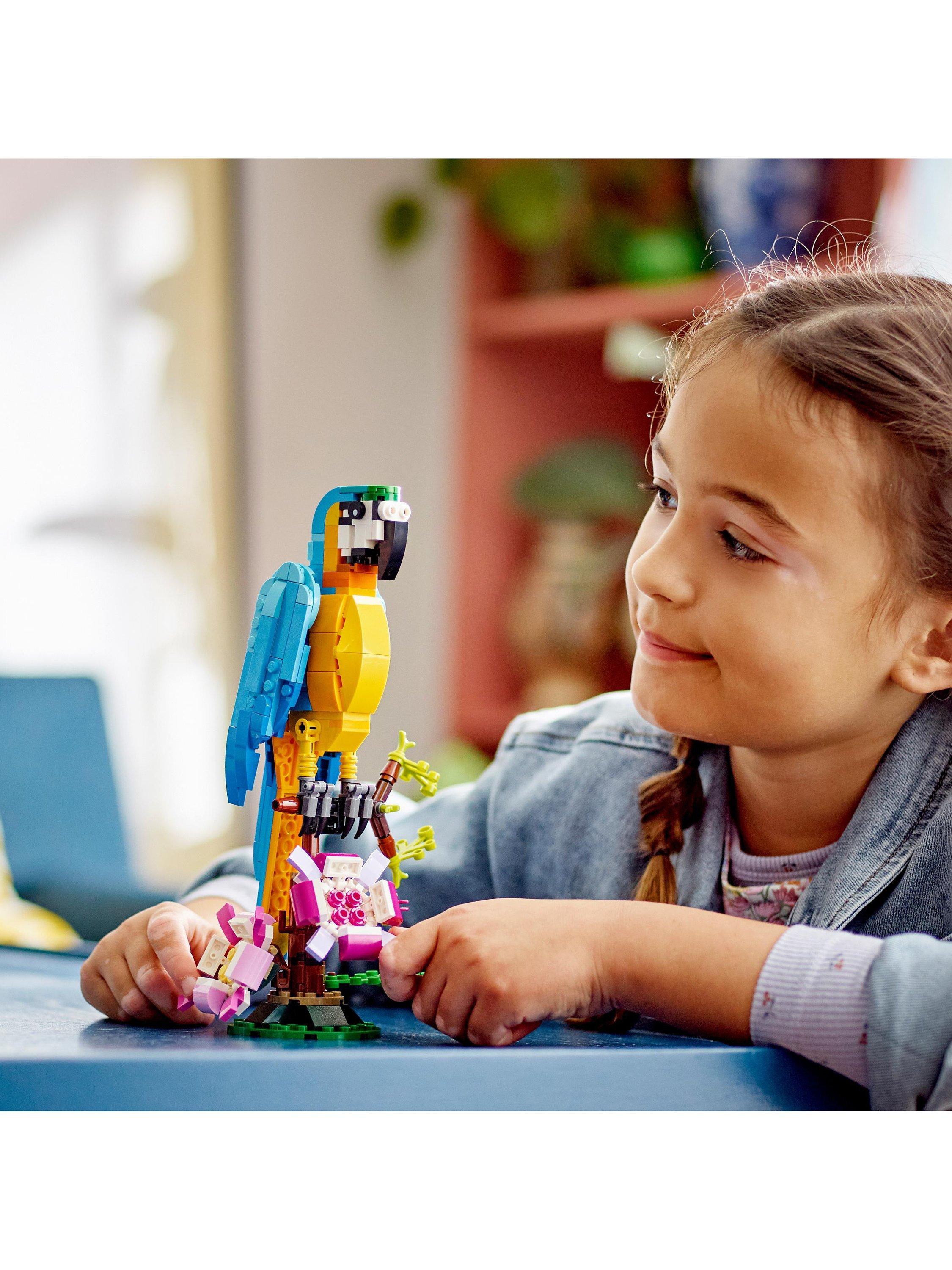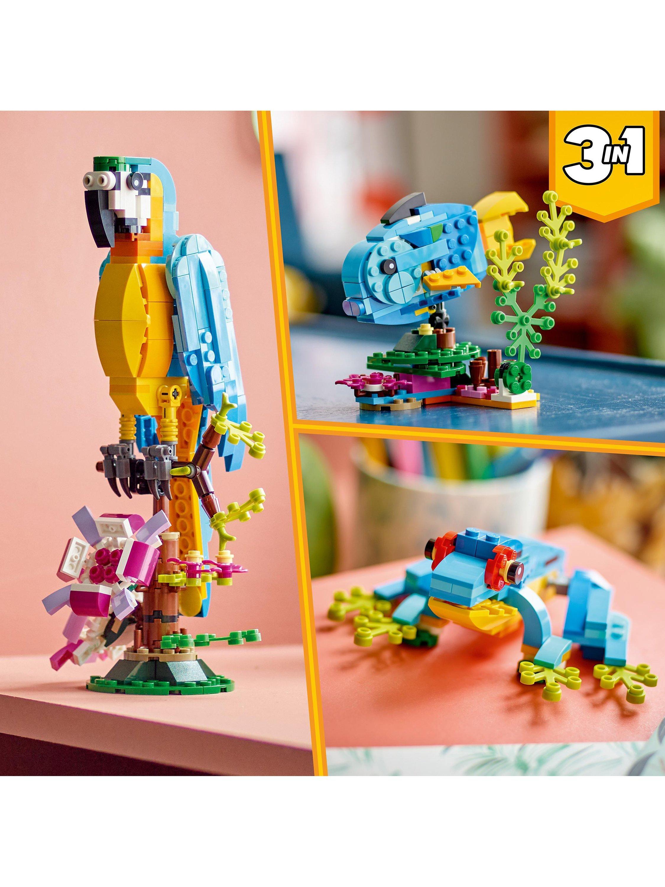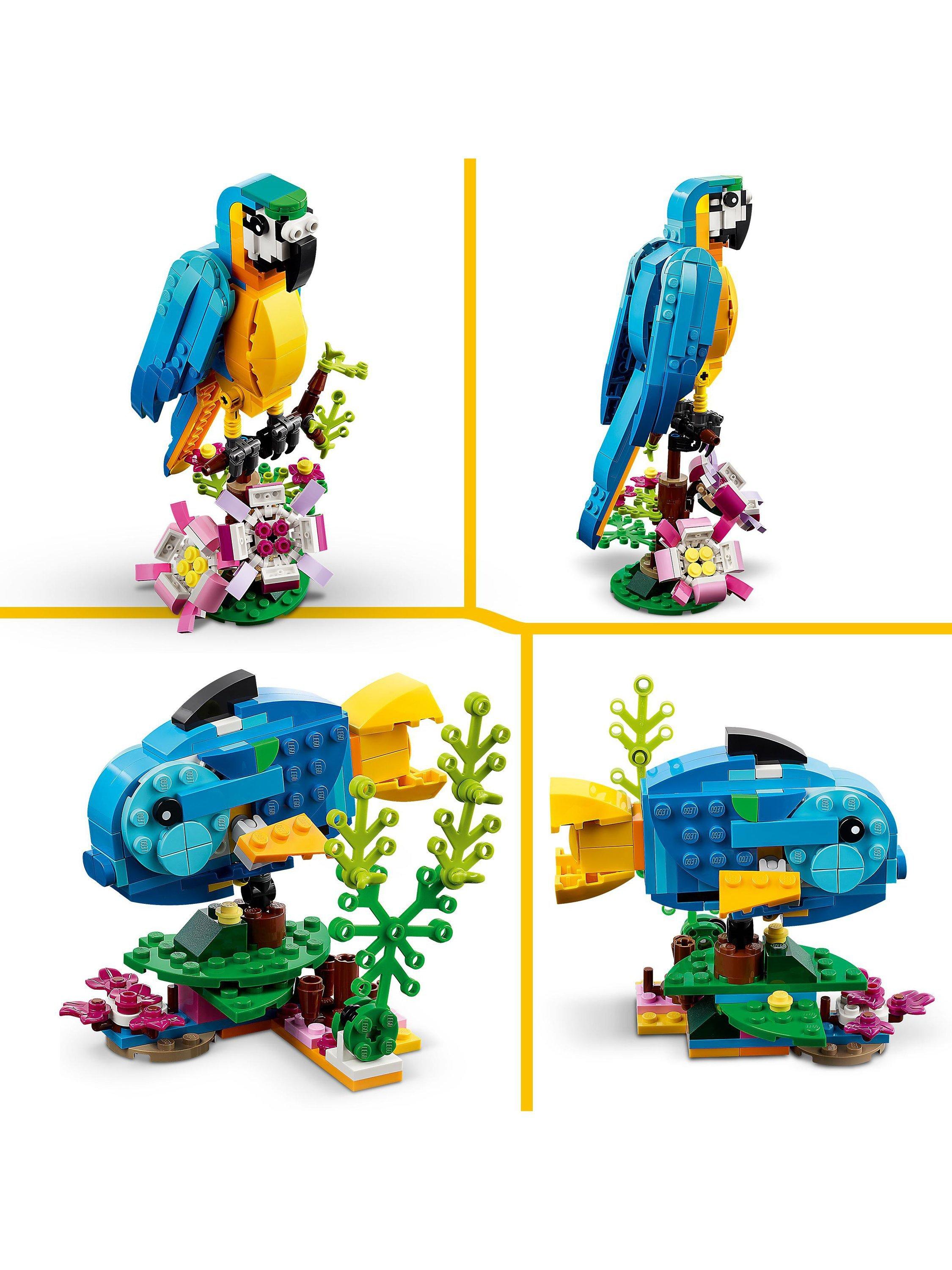 Venture into the rainforest for fun adventures with 3 exotic animals! You can build a beautiful parrot sitting on a tree branch surrounded by colourful flowers. Later, rebuild it into a blue and yellow fish, swimming in the sea, or a cool frog that can move its legs.