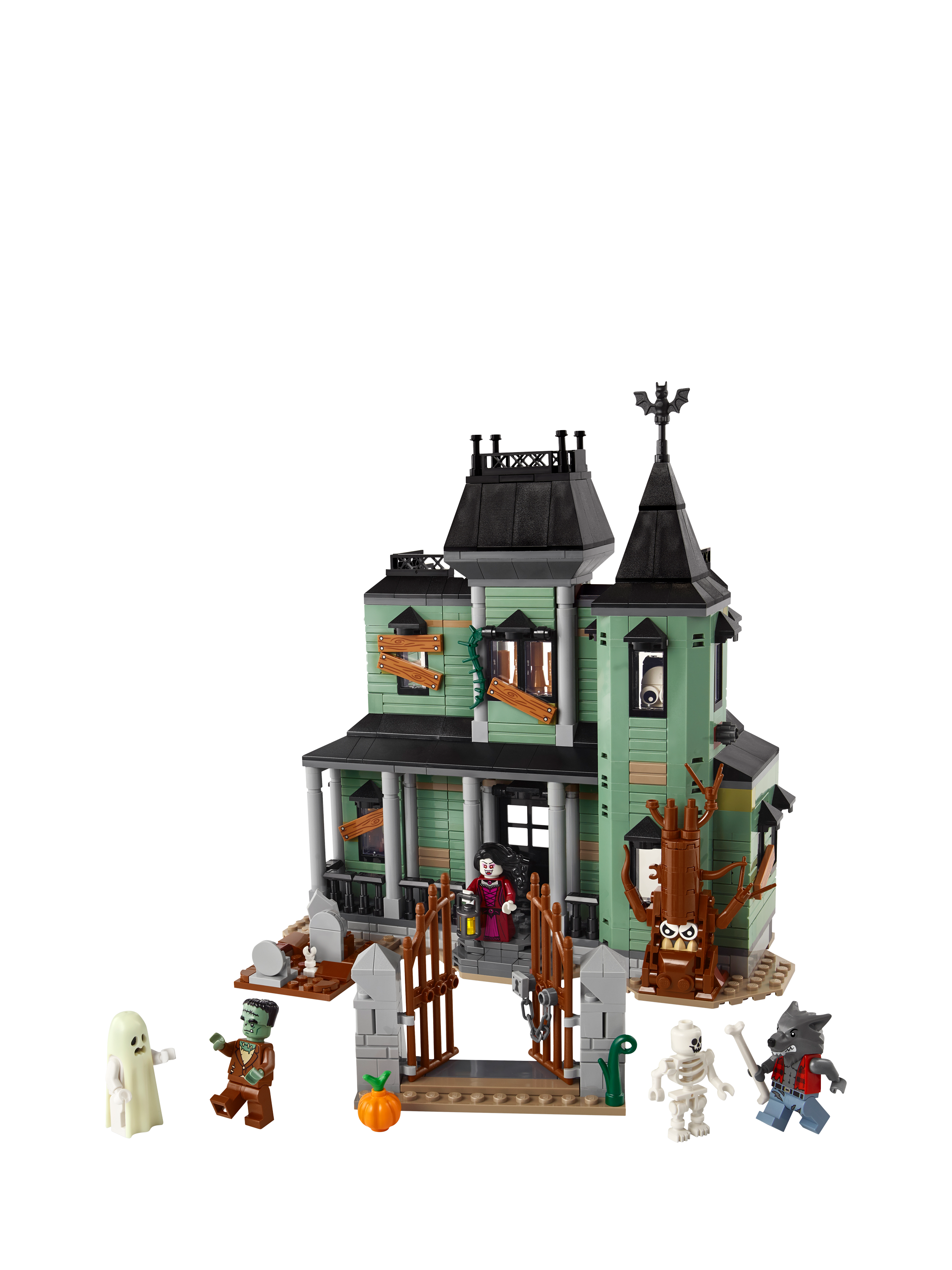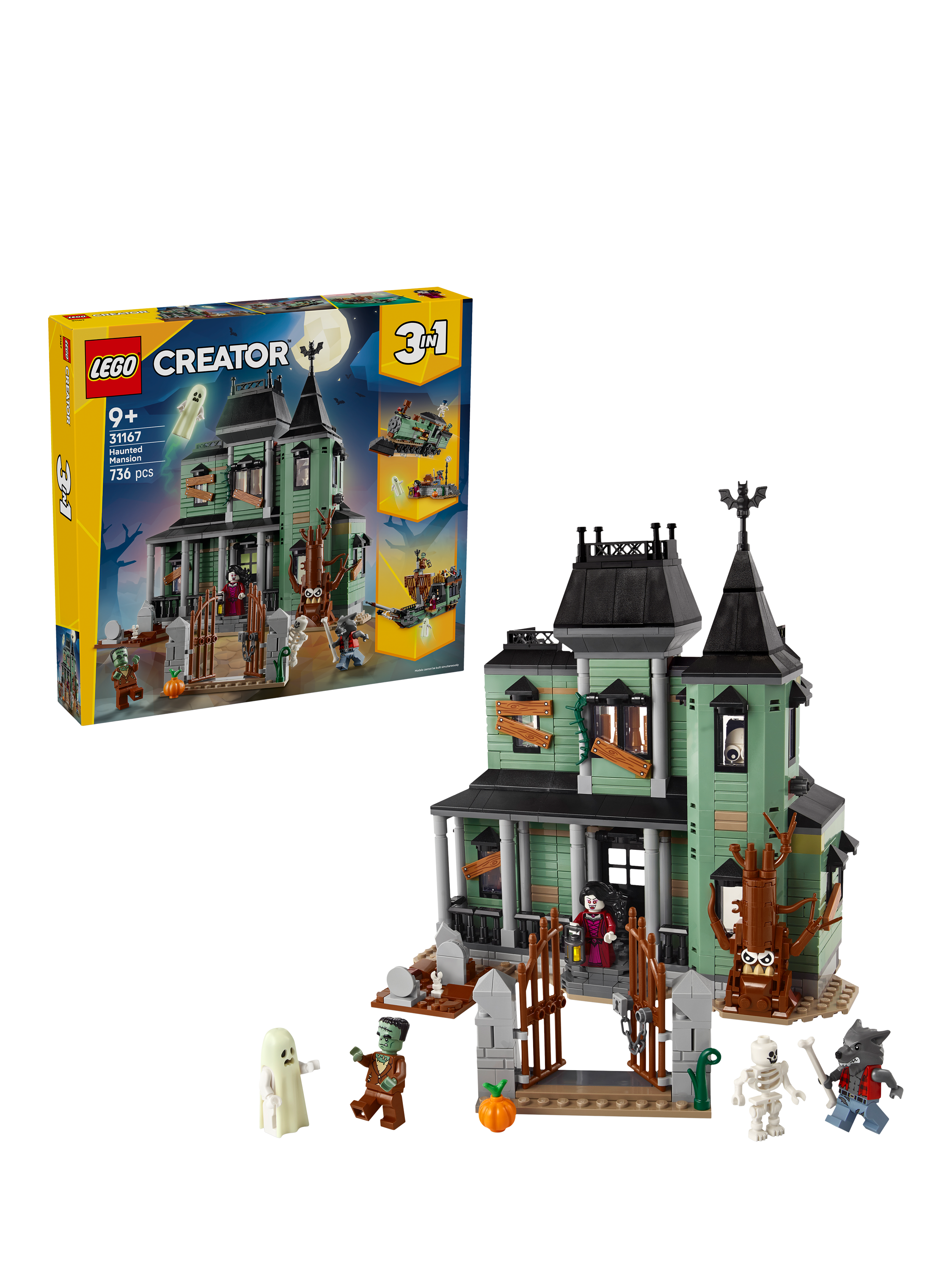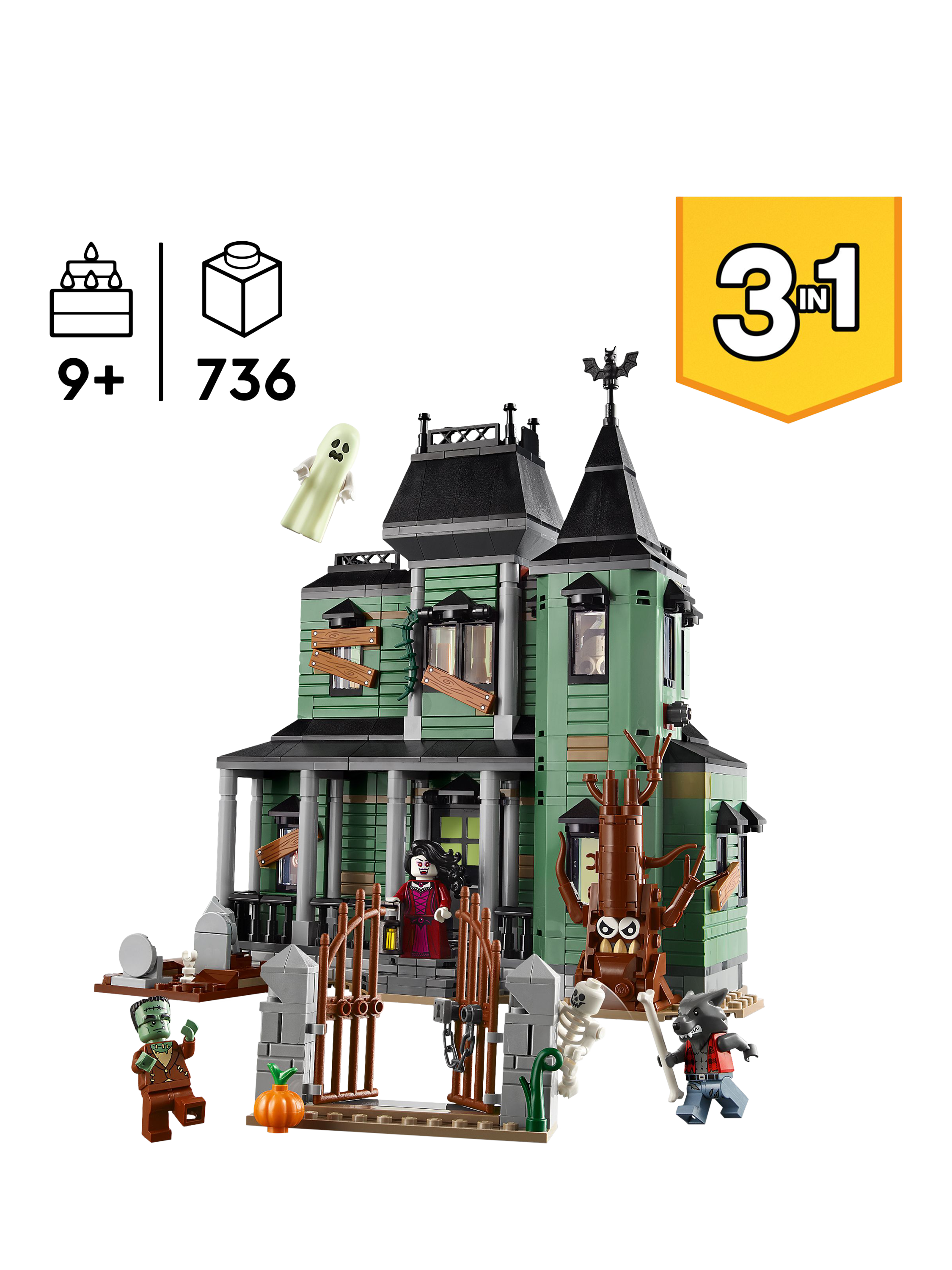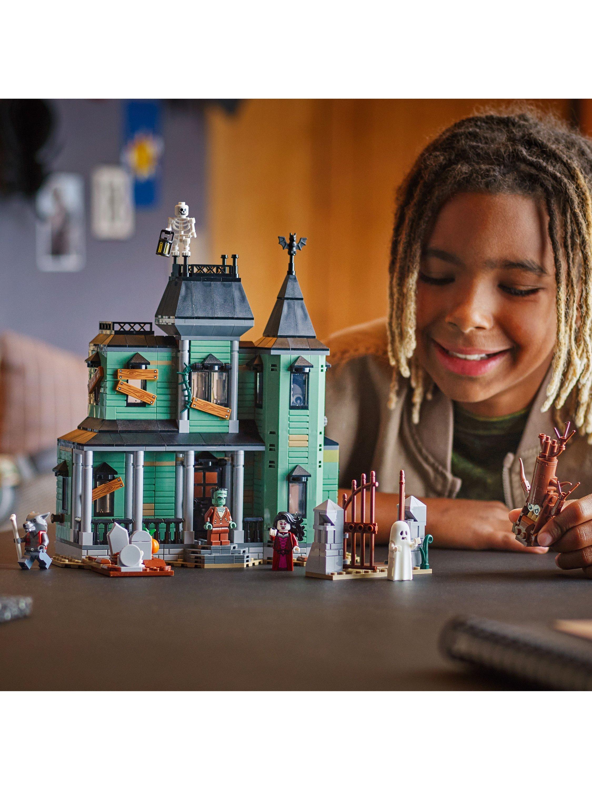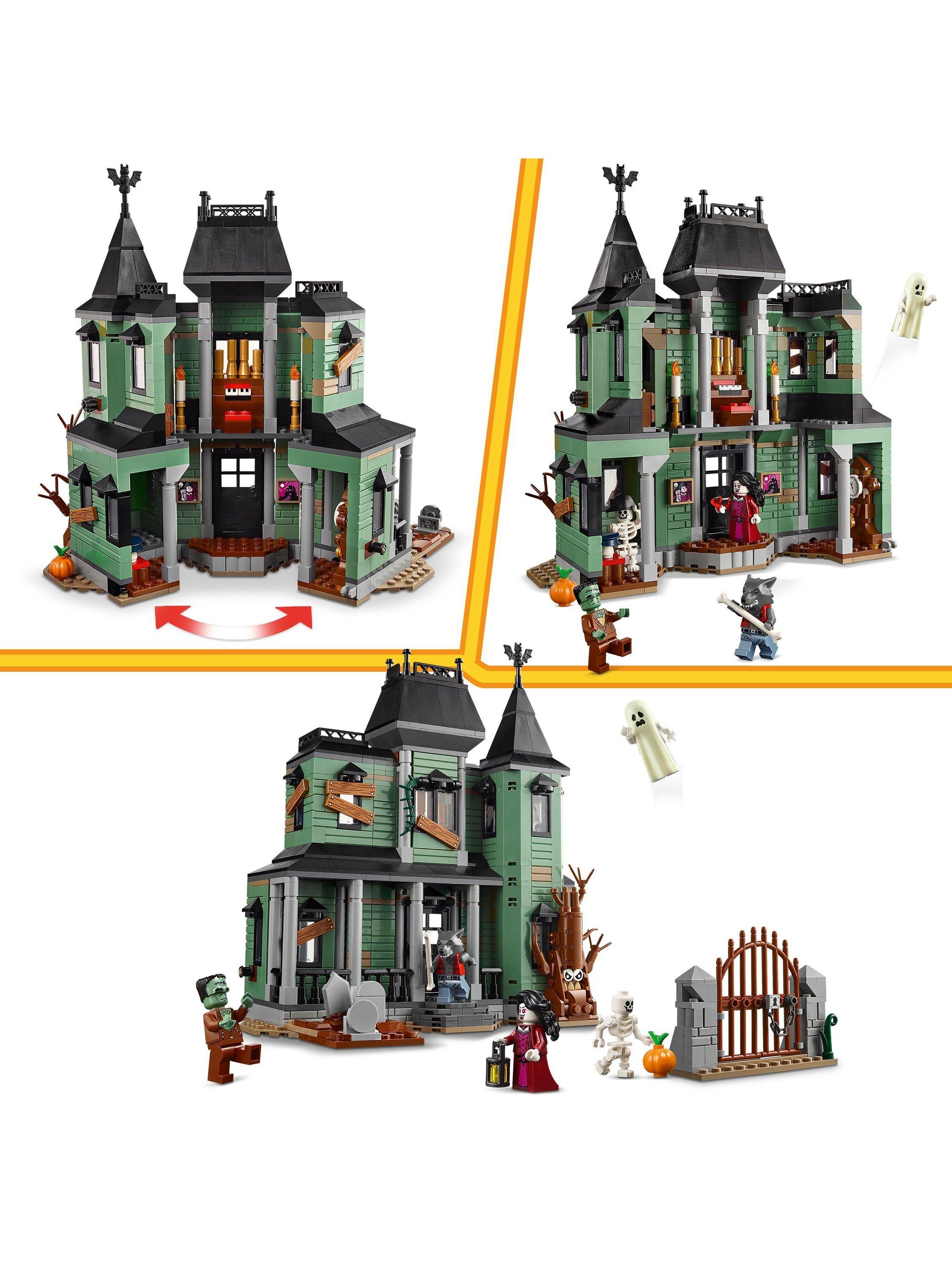 The building set comes with five LEGO minifigures: a werewolf, vampire, ghost with a glow-in-the-dark cape, Frankenstein's monster and a skeleton. All three builds in this creative toy make fun display models in kids' bedrooms, and the set makes a creative birthday gift for nine+ year olds.
