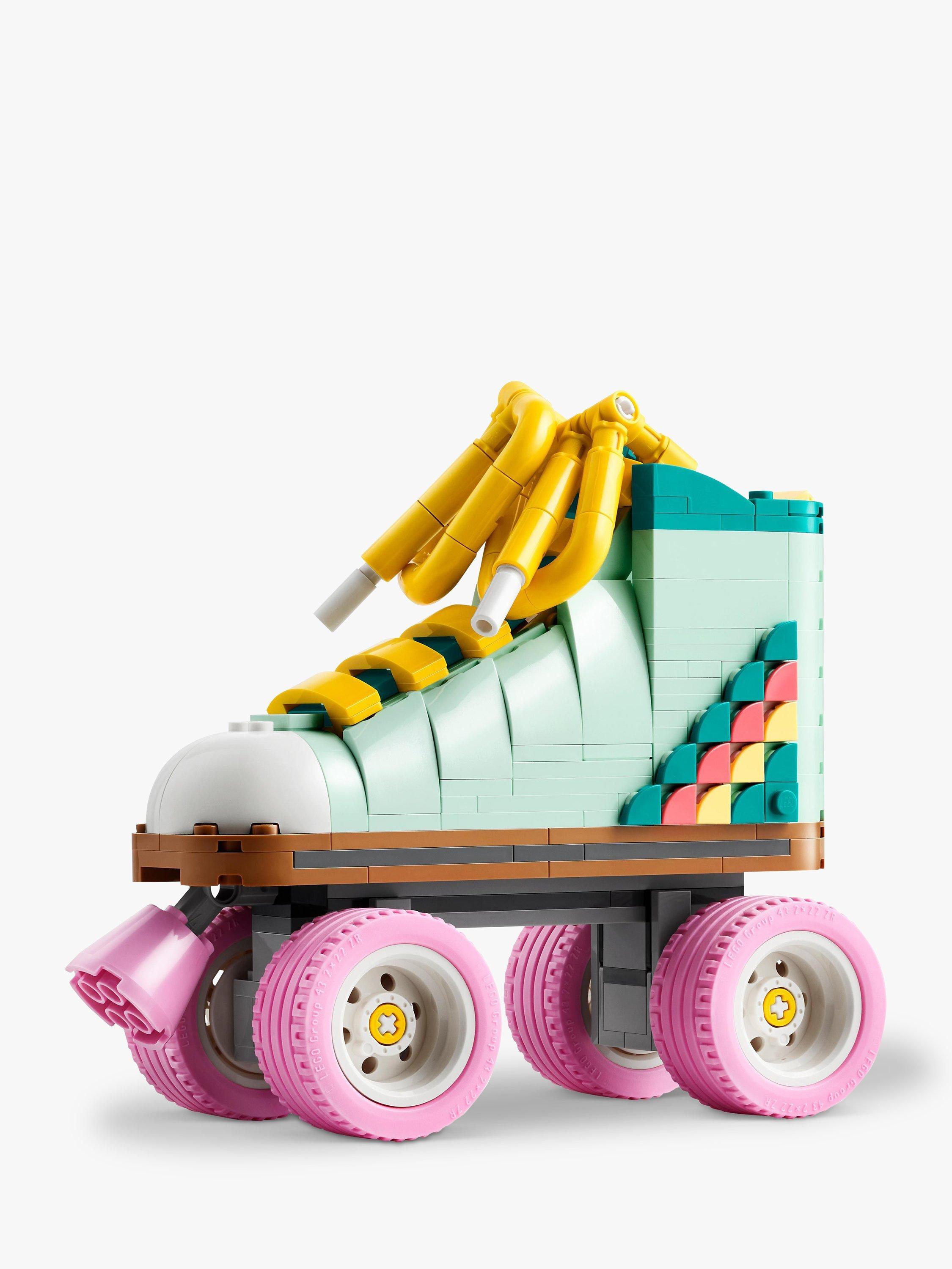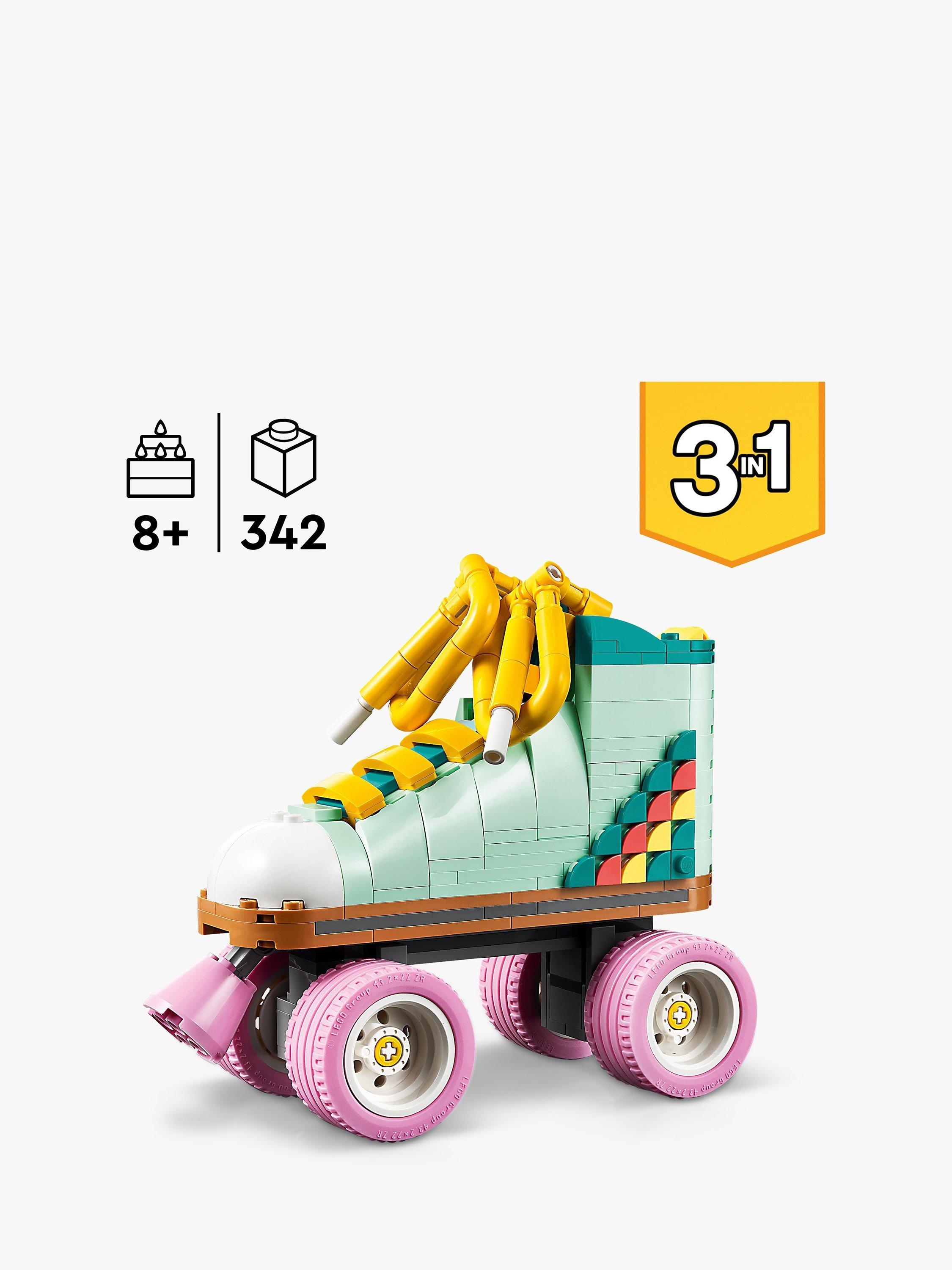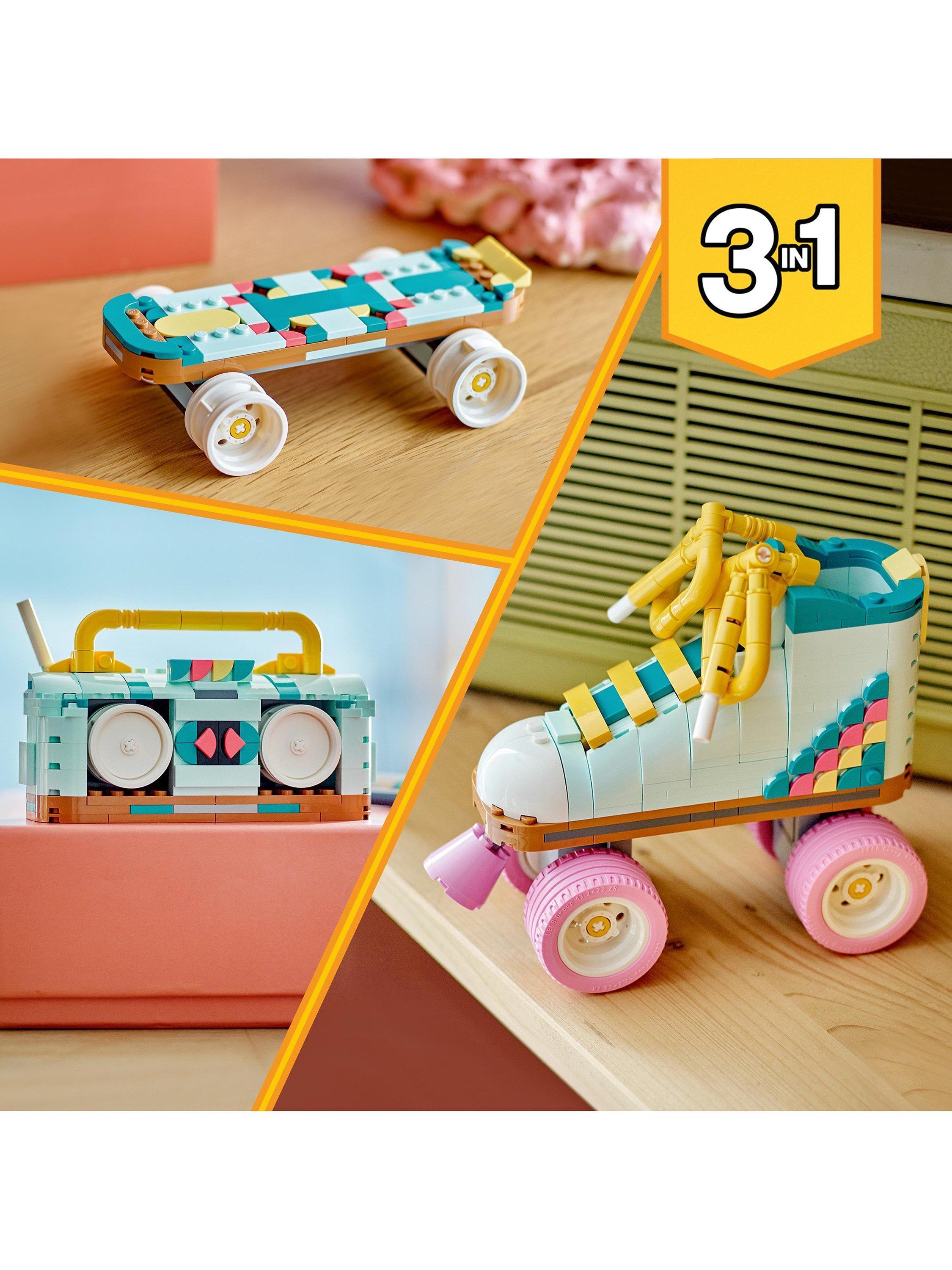 Roll back in time with the fun and colourful LEGO® Creator Retro Roller Skate. Once you have skated around the rink, pull over and rebuild it into another pop culture icon - a retro skateboard with moving wheels! Head to the skate park for more thrills or convert it into a super cool retro boom box radio. The roller skate toy has 4 moving pink wheels, while the mini skateboard also has 4 moving wheels. Colourful pieces are included so you can decorate the heel of the roller skate with your designs too! The choice is yours with this 3in1 set.