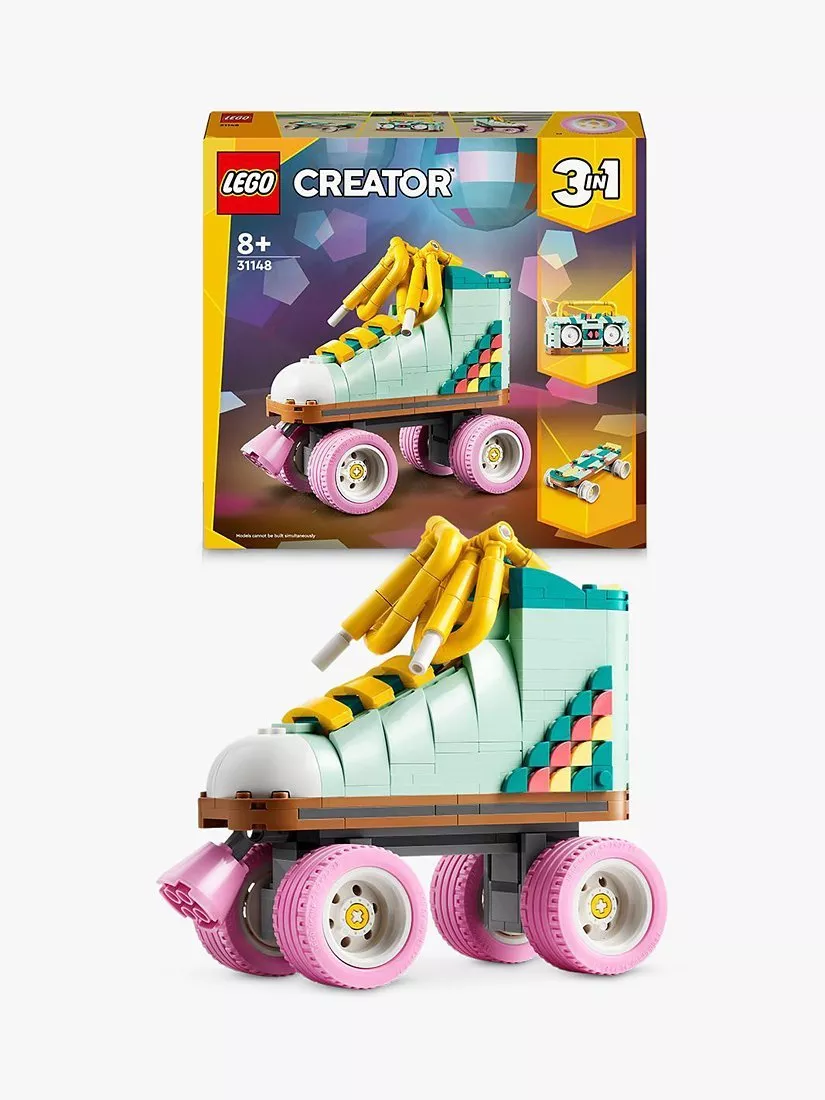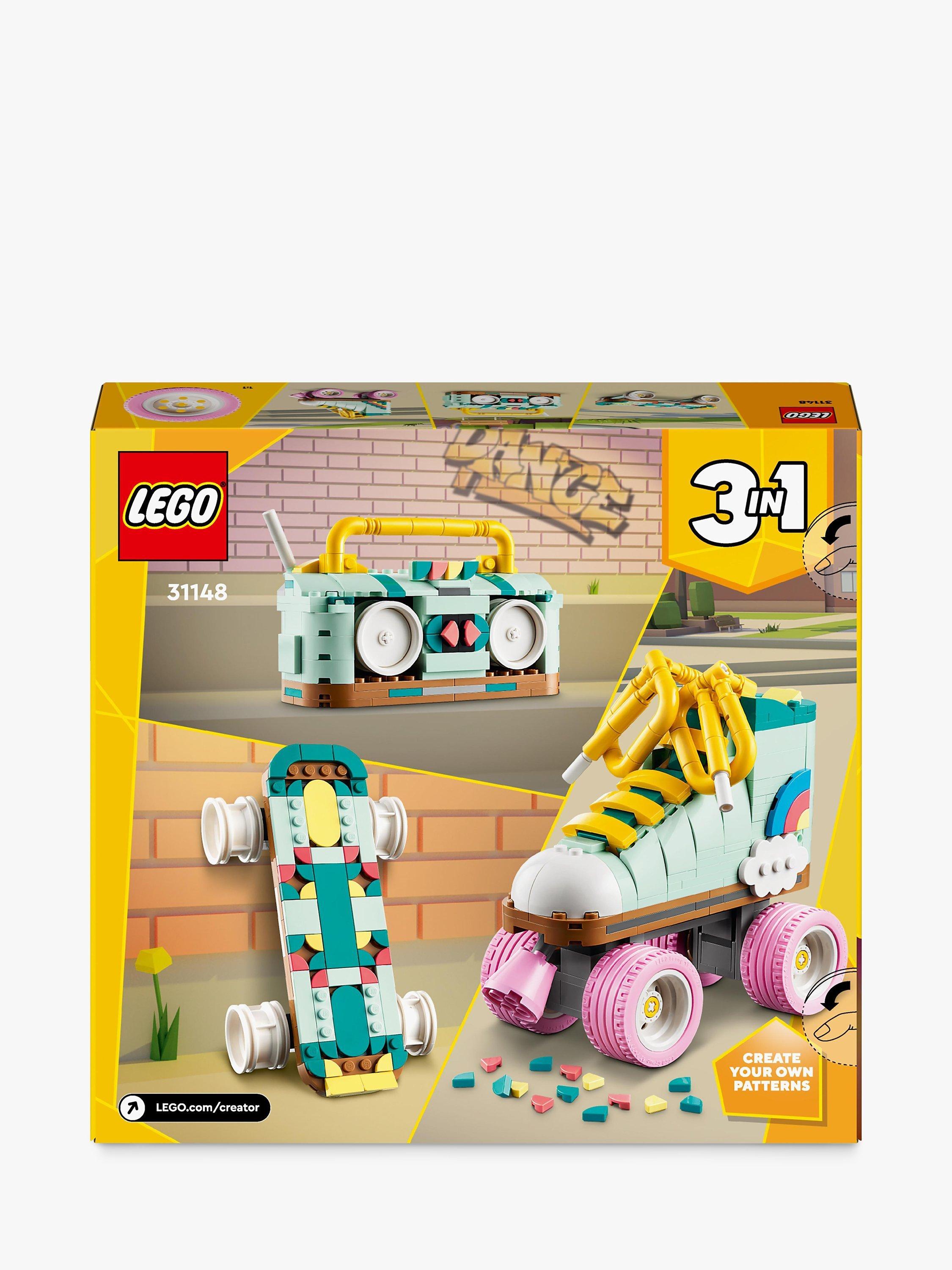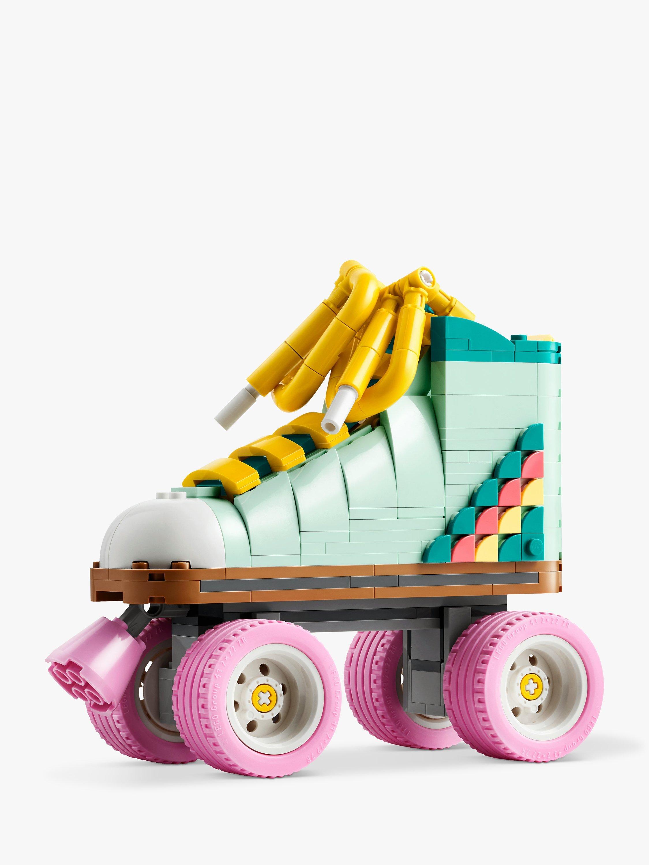 Roll back in time with the fun and colourful LEGO® Creator Retro Roller Skate. Once you have skated around the rink, pull over and rebuild it into another pop culture icon - a retro skateboard with moving wheels! Head to the skate park for more thrills or convert it into a super cool retro boom box radio. The roller skate toy has 4 moving pink wheels, while the mini skateboard also has 4 moving wheels. Colourful pieces are included so you can decorate the heel of the roller skate with your designs too! The choice is yours with this 3in1 set.