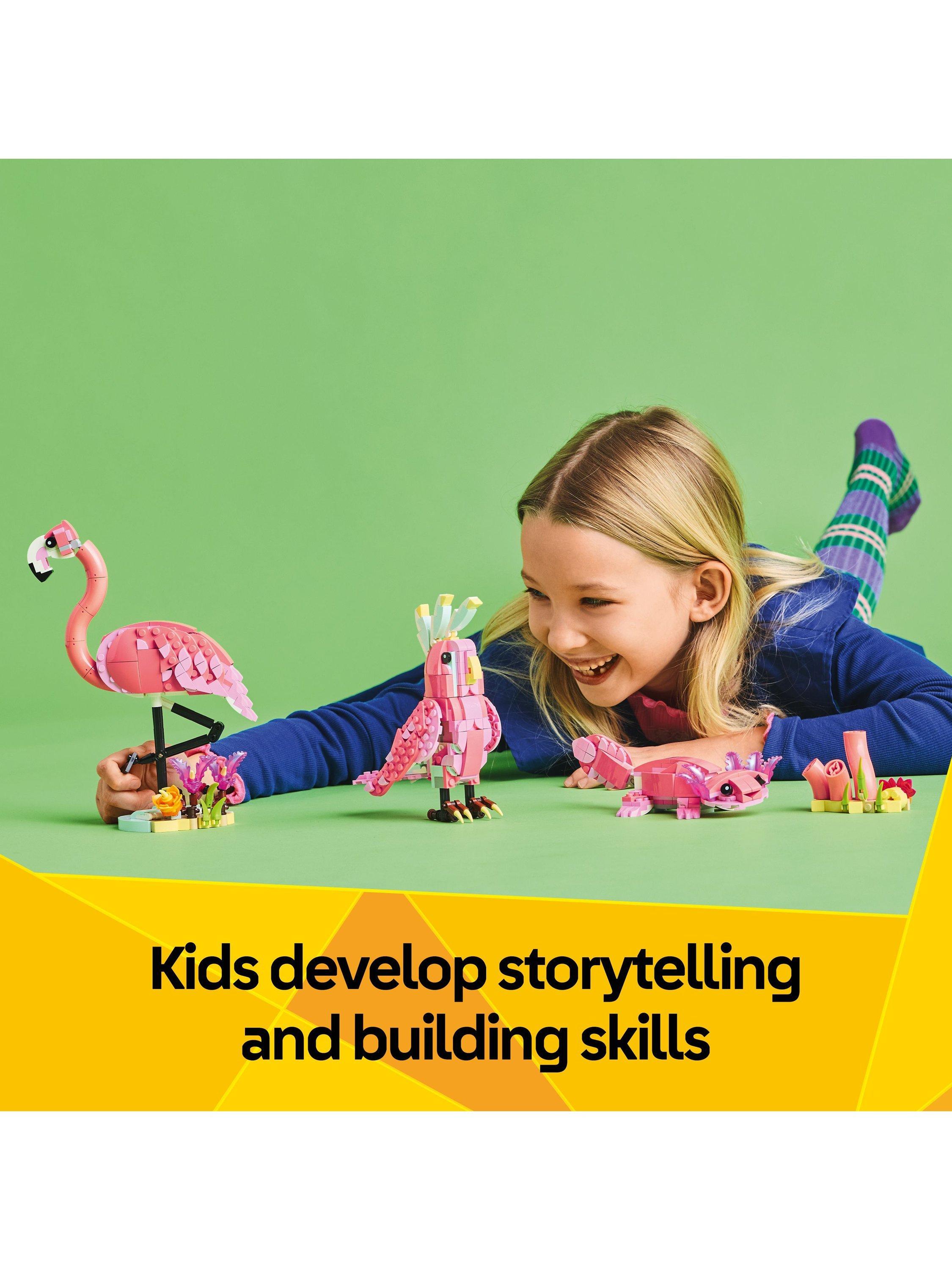 This LEGO set gives kids 3 different building options using the same bricks: a pink flamingo toy with a posable head on a plant-covered stand, a posable pink cockatoo toy, which can rotate its head 360 degrees, or an adorable posable pink axolotl toy with underwater plants. All 3 cute LEGO animal transforming toys make fun gifts for kids.