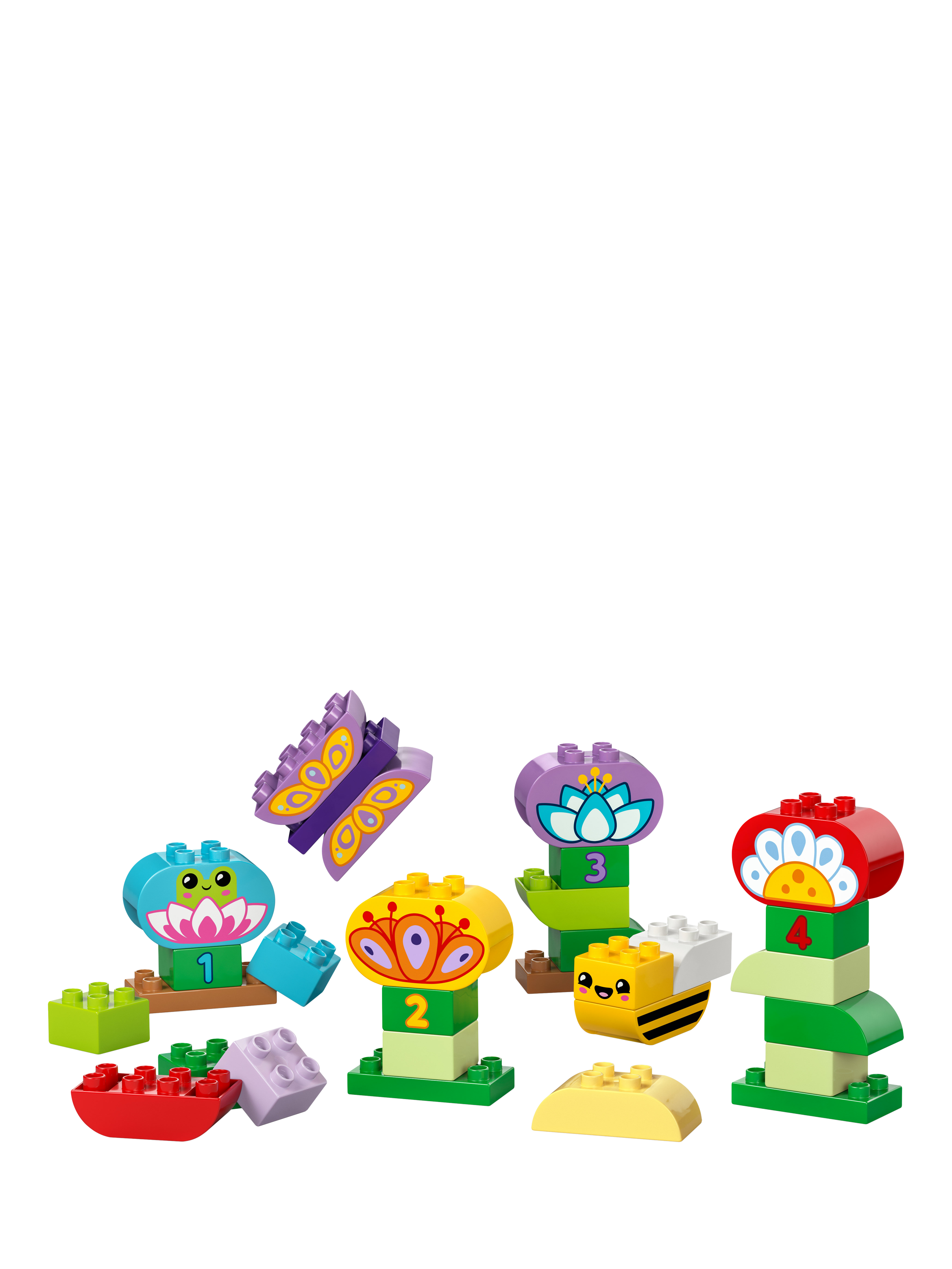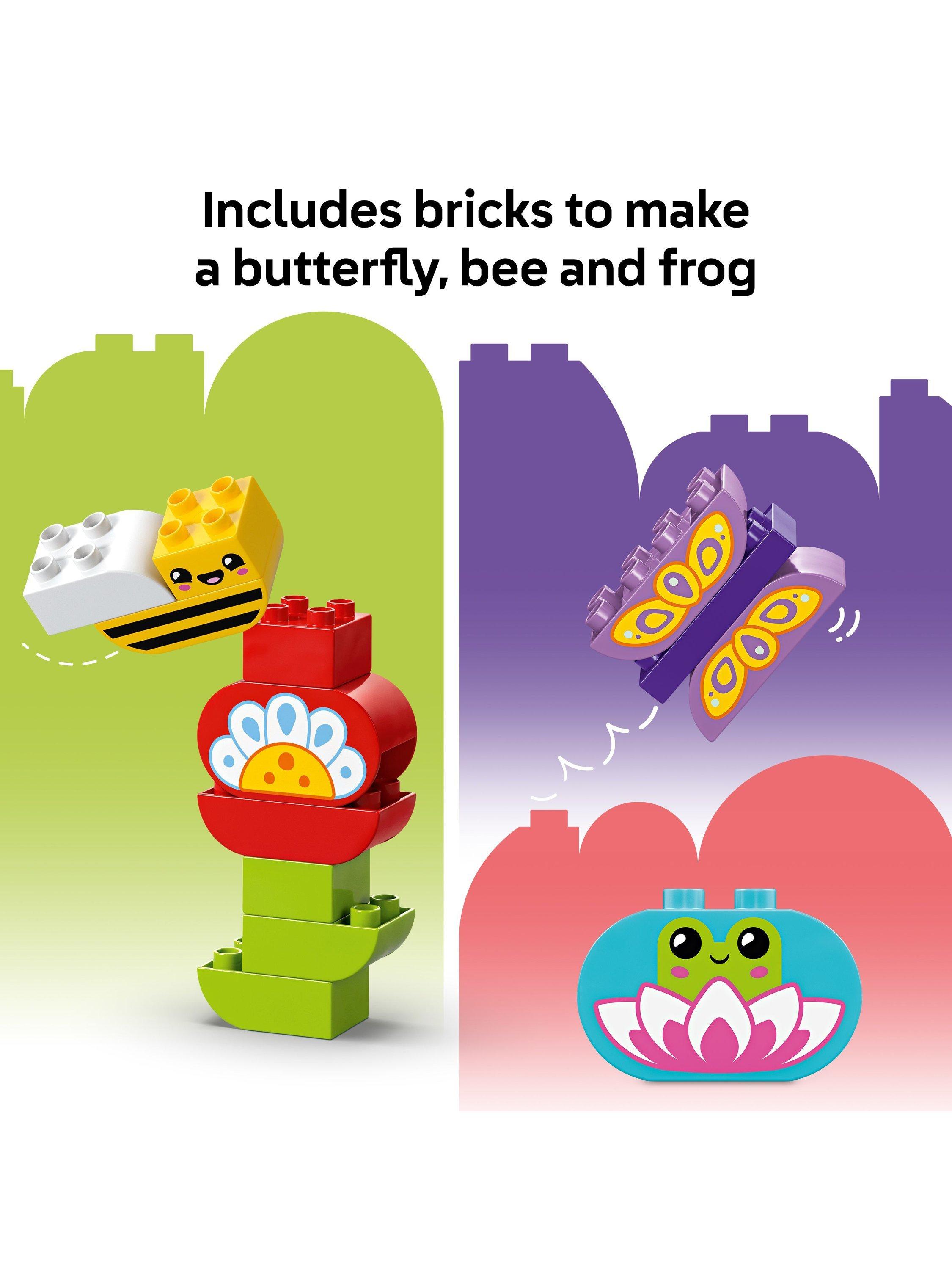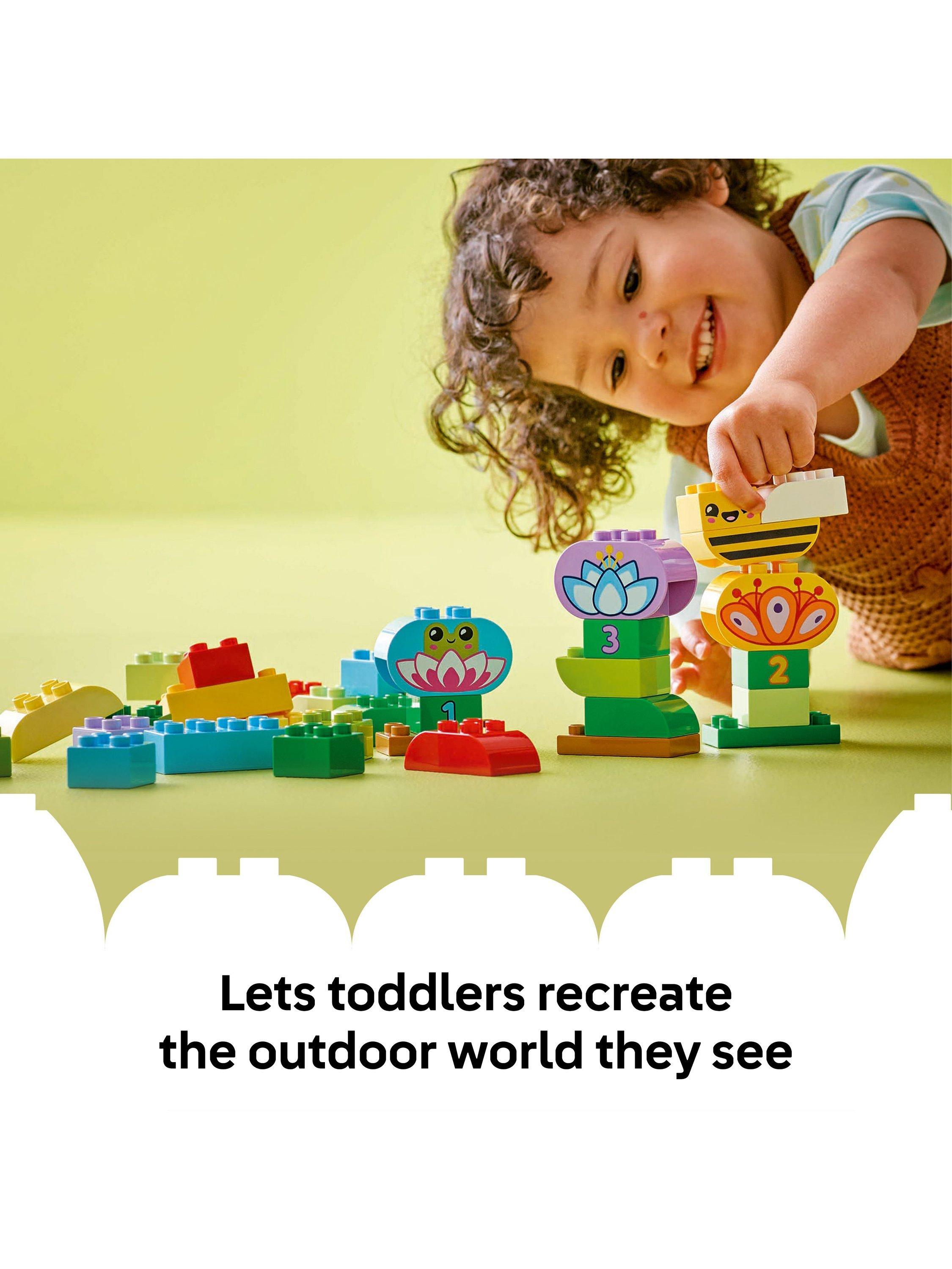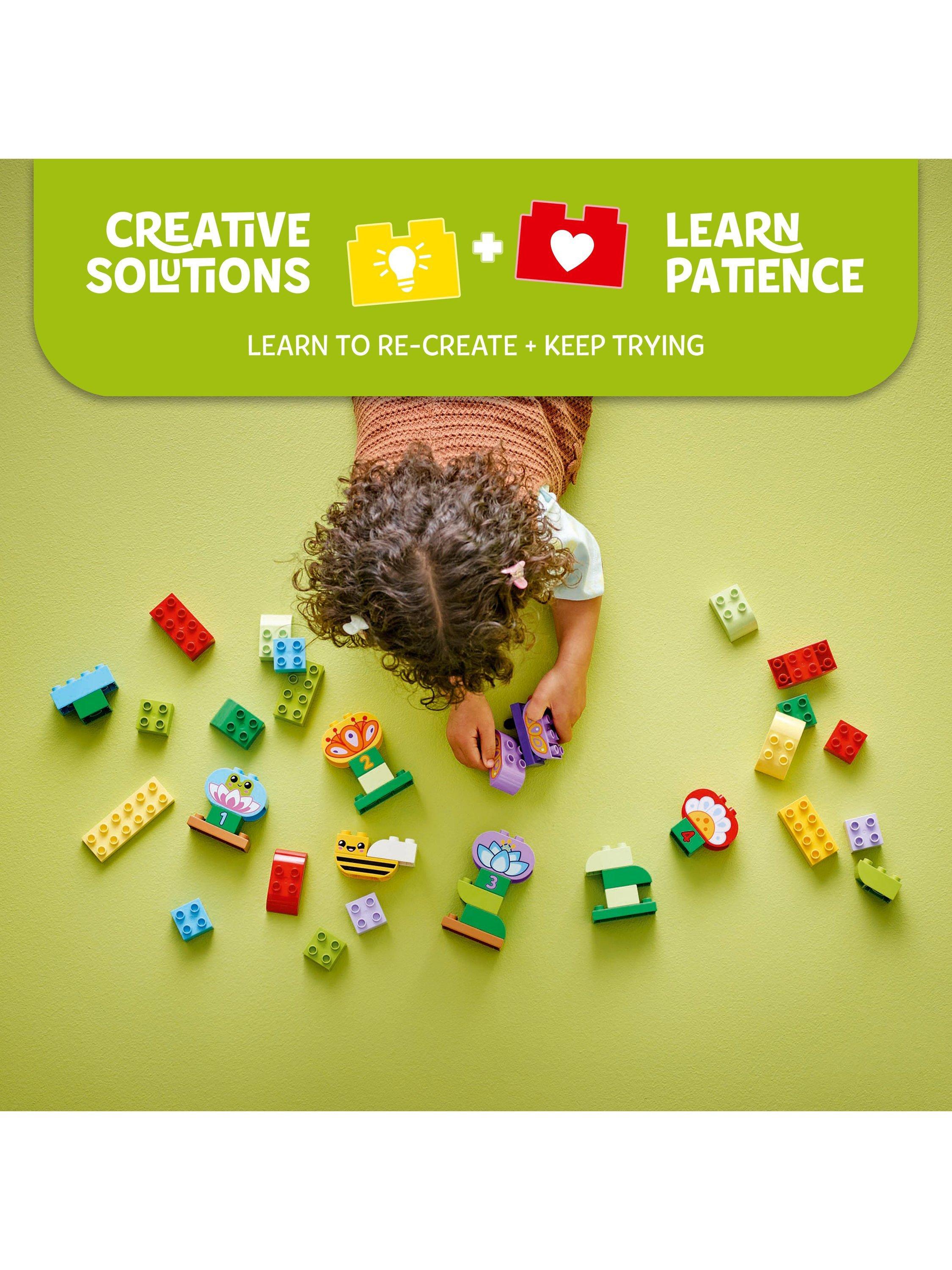 This educational toy encourages preschoolers' imaginations by helping them recreate the world they see around them every day. As they use the 45 LEGO DUPLO bricks to build their toy garden, toddlers begin to recognise numbers, learn colours, start to improve their language and hone fine motor skills. They also develop perseverance as they stack the different bricks to create creatures and flowers.