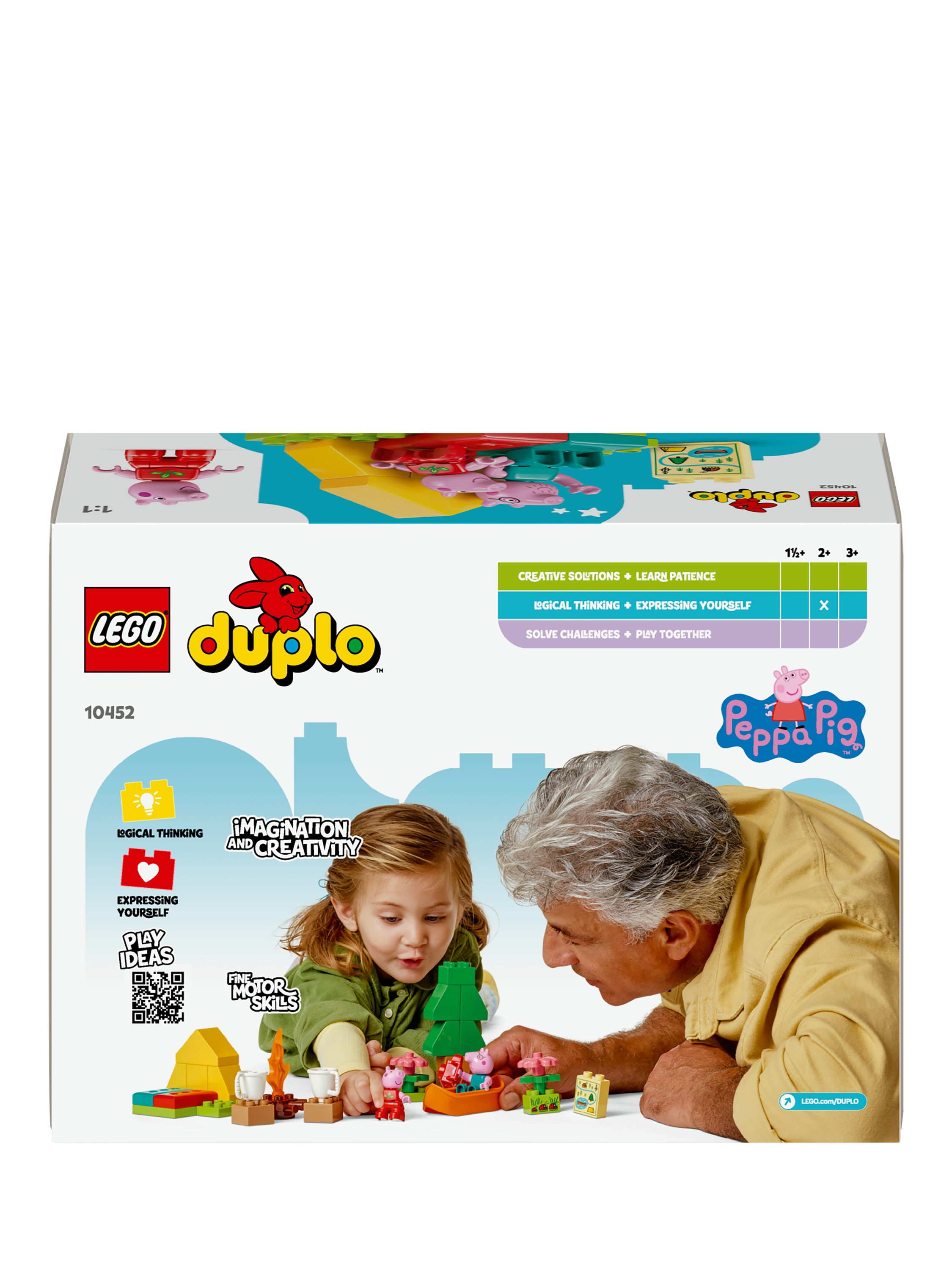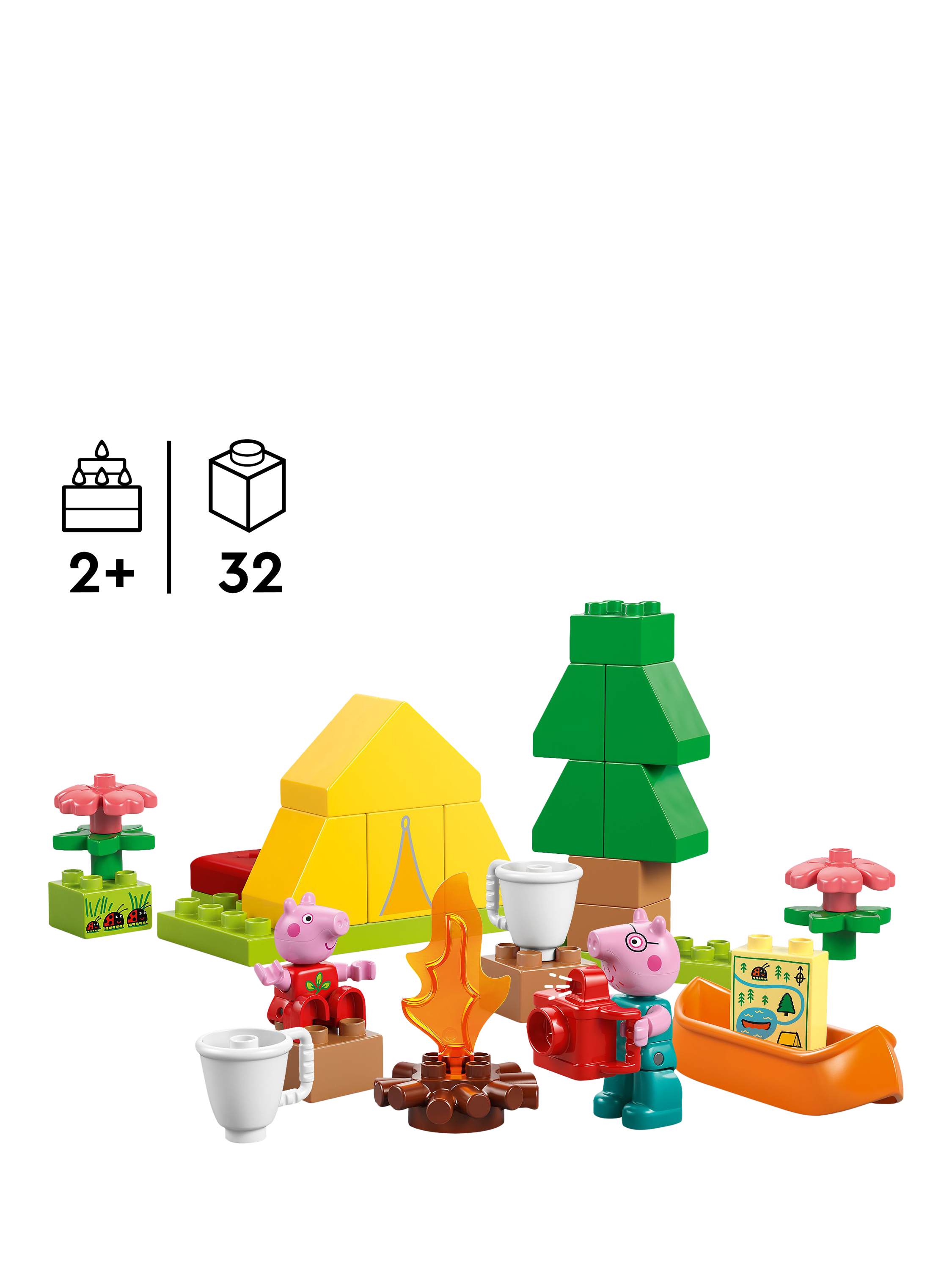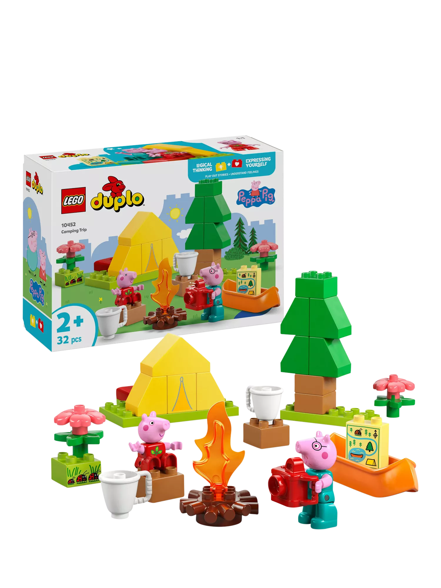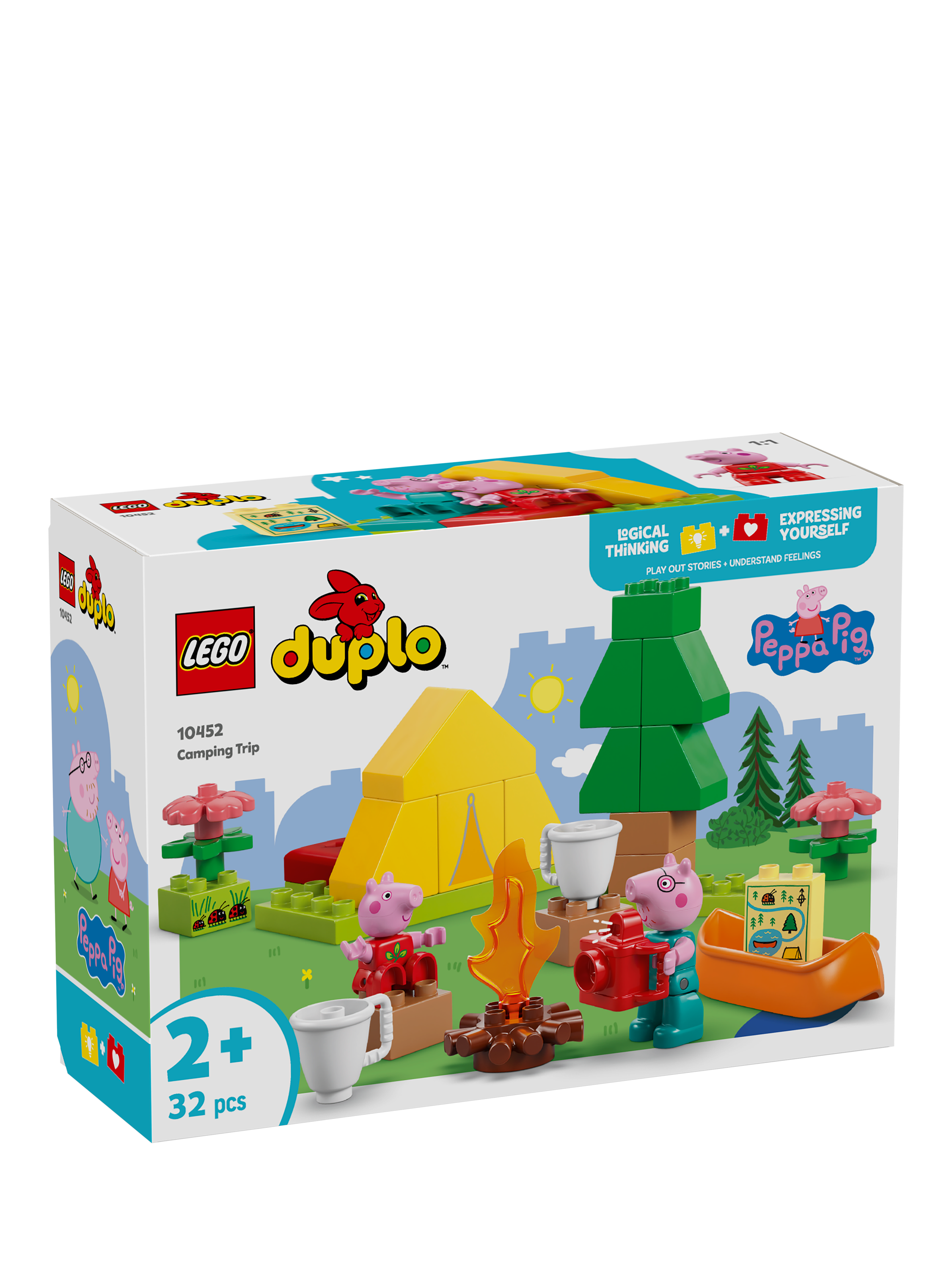 Toddlers embark on a LEGO® DUPLO® Peppa Pig adventure with the Camping Trip (10452) building playset. Through creative play, preschoolers explore how they feel about first-time experiences as they make-believe camping with Peppa Pig and Daddy Pig, then explore a river in the toy canoe.