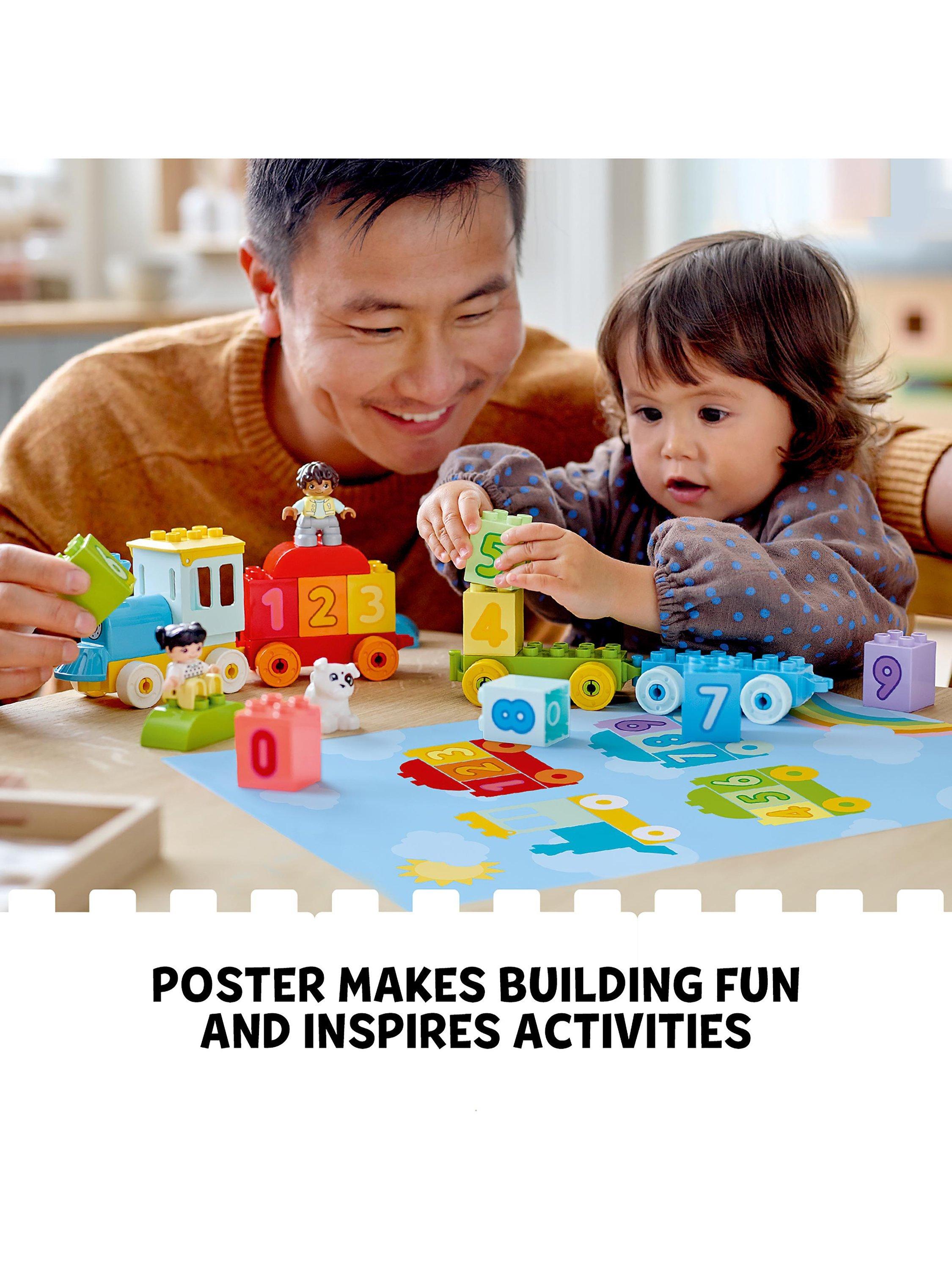 Toddlers can place the number bricks on and off the wagons, line them up in the correct order and build them together into a number wall. With moving wheels, an opening roof and friendly DUPLO characters to share the fun, the Number Train will transport your toddler to a world of imaginative, developmental play!.