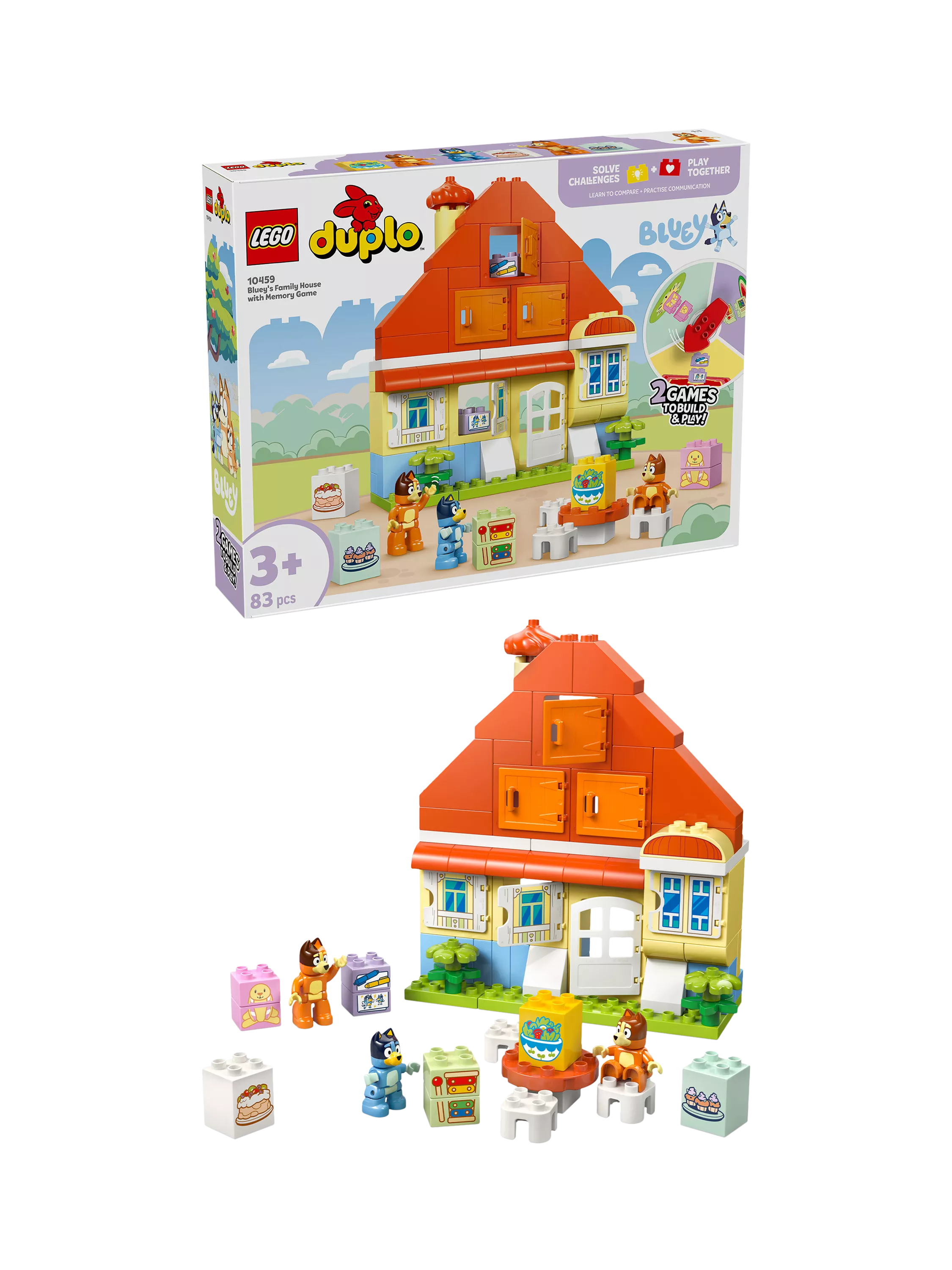 Introduce toddlers to a building set that packs in double the fun! LEGO DUPLO Bluey: Bluey’s Family House with Memory Game (10459) interactive toy for 3+ year old girls and boys delivers 2 fun activities in one colourful construction set.